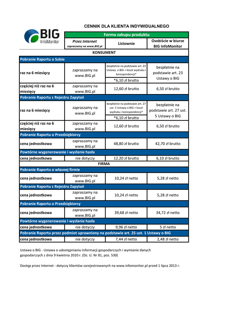 CENNIK DLA KLIENTA INDYWIDUALNEGO Forma zakupu produktu Przez Internet Osobiście w biurze BIG InfoMonitor Listownie zapraszamy na www.BIG.pl KONSUMENT Pobranie Raportu o Sobie raz na 6 miesięcy zapraszamy na www.BIG.pl bezpłatnie na podstawie art. 23 Ustawy o BIG + koszt wydruku i korespondencji* *6,10 zł brutto bezpłatnie na podstawie art. 23 Ustawy o BIG 12,60 zł brutto 6,50 zł brutto bezpłatnie na podstawie art. 27 ust. 5 Ustawy o BIG + koszt wydruku i korespondencji* *6,10 zł brutto bezpłatnie na podstawie art. 27 ust. 5 Ustawy o BIG 12,60 zł brutto 6,50 zł brutto 48,80 zł brutto 42,70 zł brutto 12,20 zł brutto 6,10 zł brutto częściej niż raz na 6 zapraszamy na miesięcy www.BIG.pl Pobranie Raportu z Rejestru Zapytań raz na 6 miesięcy zapraszamy na www.BIG.pl częściej niż raz na 6 zapraszamy na miesięcy www.BIG.pl Pobranie Raportu o Przedsiębiorcy zapraszamy na cena jednostkowa www.BIG.pl Powtórne wygenerowanie i wysłanie hasła cena jednostkowa nie dotyczy FIRMA Pobranie Raportu o własnej firmie zapraszamy na cena jednostkowa 10,24 zł netto 5,28 zł netto www.BIG.pl Pobranie Raportu z Rejestru Zapytań zapraszamy na cena jednostkowa 10,24 zł netto 5,28 zł netto www.BIG.pl Pobranie Raportu o Przedsiębiorcy zapraszamy na cena jednostkowa 39,68 zł netto 34,72 zł netto www.BIG.pl Powtórne wygenerowanie i wysłanie hasła cena jednostkowa nie dotyczy 9,96 zł netto 5 zł netto Pobranie Raportu przez podmiot uprawniony na podstawie art. 25 ust. 1 Ustawy o BIG cena jednostkowa nie dotyczy 7,44 zł netto 2,48 zł netto Ustawa o BIG - Ustawa o udostępnianiu informacji gospodarczych i wymianie danych gospodarczych z dnia 9 kwietnia 2010 r. (Dz. U. Nr 81, poz. 530) Dostęp przez Internet - dotyczy klientów zarejestrowanych na www.infomonitor.pl przed 1 lipca 2013 r.