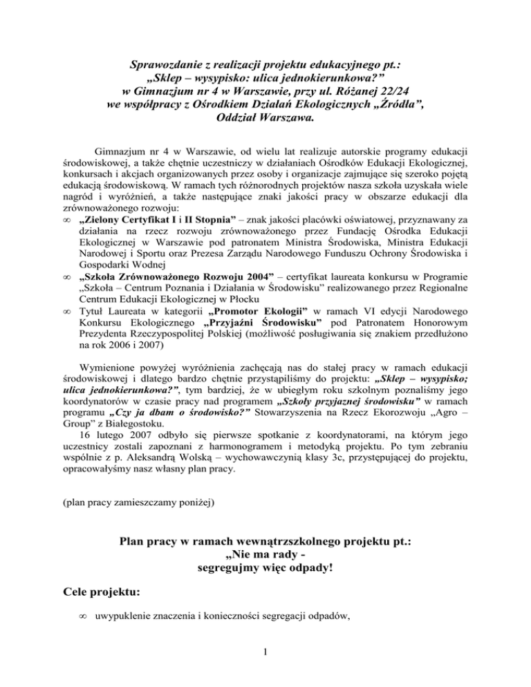 Sprawozdanie z realizacji projektu edukacyjnego pt.: „Sklep – wysypisko: ulica jednokierunkowa?” w Gimnazjum nr 4 w Warszawie, przy ul. RóŜanej 22/24 we współpracy z Ośrodkiem Działań Ekologicznych „Źródła”, Oddział Warszawa. Gimnazjum nr 4 w Warszawie, od wielu lat realizuje autorskie programy edukacji środowiskowej, a takŜe chętnie uczestniczy w działaniach Ośrodków Edukacji Ekologicznej, konkursach i akcjach organizowanych przez osoby i organizacje zajmujące się szeroko pojętą edukacją środowiskową. W ramach tych róŜnorodnych projektów nasza szkoła uzyskała wiele nagród i wyróŜnień, a takŜe następujące znaki jakości pracy w obszarze edukacji dla zrównowaŜonego rozwoju: • „Zielony Certyfikat I i II Stopnia” – znak jakości placówki oświatowej, przyznawany za działania na rzecz rozwoju zrównowaŜonego przez Fundację Ośrodka Edukacji Ekologicznej w Warszawie pod patronatem Ministra Środowiska, Ministra Edukacji Narodowej i Sportu oraz Prezesa Zarządu Narodowego Funduszu Ochrony Środowiska i Gospodarki Wodnej • „Szkoła ZrównowaŜonego Rozwoju 2004” – certyfikat laureata konkursu w Programie „Szkoła – Centrum Poznania i Działania w Środowisku” realizowanego przez Regionalne Centrum Edukacji Ekologicznej w Płocku • Tytuł Laureata w kategorii „Promotor Ekologii” w ramach VI edycji Narodowego Konkursu Ekologicznego „Przyjaźni Środowisku” pod Patronatem Honorowym Prezydenta Rzeczypospolitej Polskiej (moŜliwość posługiwania się znakiem przedłuŜono na rok 2006 i 2007) Wymienione powyŜej wyróŜnienia zachęcają nas do stałej pracy w ramach edukacji środowiskowej i dlatego bardzo chętnie przystąpiliśmy do projektu: „Sklep – wysypisko; ulica jednokierunkowa?”, tym bardziej, Ŝe w ubiegłym roku szkolnym poznaliśmy jego koordynatorów w czasie pracy nad programem „Szkoły przyjaznej środowisku” w ramach programu „Czy ja dbam o środowisko?” Stowarzyszenia na Rzecz Ekorozwoju „Agro – Group” z Białegostoku. 16 lutego 2007 odbyło się pierwsze spotkanie z koordynatorami, na którym jego uczestnicy zostali zapoznani z harmonogramem i metodyką projektu. Po tym zebraniu wspólnie z p. Aleksandrą Wolską – wychowawczynią klasy 3c, przystępującej do projektu, opracowałyśmy nasz własny plan pracy. (plan pracy zamieszczamy poniŜej) Plan pracy w ramach wewnątrzszkolnego projektu pt.: „Nie ma rady segregujmy więc odpady! Cele projektu: • uwypuklenie znaczenia i konieczności segregacji odpadów, 1 • • • • • • L.p. 1. 2. 3. upowszechnienie umiejętności prawidłowego przygotowania odpadów do powtórnego ich wykorzystania, pokazanie kosztów środowiskowych związanych z brakiem segregacji i recyklingu odpadów, kształtowanie prawidłowych zachowań konsumenckich, wskazywanie na właściwe postawy wobec środowiska i konieczność ich upowszechniania, doskonalenie umiejętności pracy w grupie, umoŜliwienie realizacji uczniowskich pomysłów w czasie pracy metodą projektu. Działanie: Czas realizacji: Osoby Uwagi o realizacji: odpowiedzial ne w Gimnazjum nr 4: p. Aleksandra spotkanie prowadzą Wolska koordynatorzy projektu z p. Izabella ODE „Źródła” Łysiak Spotkanie 16 lutego 2007 r. informacyjne dla nauczycieli – szkolnych koordynatorów projektu Zajęcia wstępne w 22 luty 2007 r. klasie 3c – klasie realizującej projekt w naszej szkole Zebranie redakcyjne 23 luty 2007 r. autorów Biuletynu Ekologicznego pt.: „Moje środowisko” – uczniowie klasy 3e 4. Warsztaty w ramach 26 luty 2007 r projektu dla klasy 3c 1 marca 2007 r. 2 kwietnia 2007 r. 5. Zajęcia warsztatowe kwiecień 2007 r. w ramach projektu dla klas drugich i trzecich 6. Opracowanie przez uczniów klasy 3c marzec/kwiecień 2007 r. 2 p. Izabella Łysiak p. Aleksandra Wolska p. Izabella Łysiak zapoznanie z zasadami pracy w ramach projektu, ustalenie z uczniami planu pracy ustalenie tematyki kolejnych numerów poświęconych realizacji projektu p. Izabella Łysiak p. Aleksandra Wolska klasy trzecie – p. Izabella Łysiak klasy drugie – p. Aleksanra Wolska warsztaty prowadzą koordynatorzy projektu z ODE „Źródła” p. Izabella Łysiak opracowany projekt kampanii (slogany zajęcia prowadzone w/g scenariuszy projektu „Sklep – wysypisko: ulica jednokierunkowa!” (lekcje WOS) projektu kampanii promującej segregację odpadów pod hasłem: „Nie ma rady – segregujmy więc odpady!”: a. dla szkoły b. dla społeczności lokalnej p. Aleksanra Wolska p. ElŜbieta Trzcińska 7. Zapoznanie marzec/kwiecień społeczności 2007 r. szkolnej i lokalnej z wynikami szkolnego monitoringu odpadów: a. prace badawcze b. ankiety p. Izabella Łysiak p. Aleksandra Wolska 8. Wydanie II numeru Biuletynu Ekologicznego pt.: „Moje środowisko” Przeprowadzenie w klasach trzecich konkursu plastycznego na plakat pt.: „Nie ma rady – segregujmy więc odpady! Przeprowadzenie akcji promocyjnej i zbiórki odpadów kwiecień 2007 r p. Izabella Łysiak marzec/kwiecień 2007 r. p. Hanna Sosnowska p. Beata Szwajka 9. 10. 11. X Szkolny Dzień Ziemi dla Szkół Podstawowych i Gimnazjów Mokotowa pt.: „Moje miasto” kwiecień 2007 r. p. Izabella Łysiak p. Aleksandra Wolska 27 kwietnia 2007 r. p. Izabella Łysiak p. Aleksandra Wolska p. ElŜbieta Trzcińska p. Hanna Sosnowska p. Beata Szwajka 3 reklamowe, wzory ulotek i artykułów prasowych, plakaty, fraszki i wiersze itp.) zostanie wykorzystany przy realizacji akcji zbiórki odpadów w szkole w ramach projektu: „Sklep – wysypisko: ulica jednokierunkowa”, a takŜe zostanie wysłany na konkurs w ramach projektu pt.: „Czy ja dbam o środowisko?” realizowanego przez Stowarzyszenie na rzecz Ekorozwoju Agro – Group” wyniki zostaną zaprezentowane w czasie: Dnia Otwartego Gimnazjum nr 4, Zebrań z Rodzicami, X Szkolnego Dnia Ziemi dla Uczniów Szkół Podstawowych i Gimnazjów Mokotowa pt.: „Moje miasto” zespół redakc
