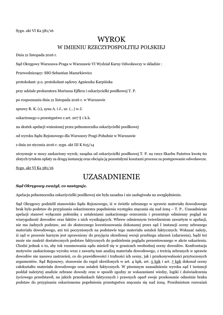 Sygn. akt VI Ka 581/16 WYROK W IMIENIU RZECZYPOSPOLITEJ POLSKIEJ Dnia 21 listopada 2016 r. Sąd Okręgowy Warszawa-Praga w Warszawie VI Wydział Karny Odwoławczy w składzie : Przewodniczący: SSO Sebastian Mazurkiewicz protokolant: p.o. protokolant sądowy Agnieszka Karpińska przy udziale prokuratora Mariusza Ejflera i oskarżycielki posiłkowej T. P. po rozpoznaniu dnia 21 listopada 2016 r. w Warszawie sprawy R. K. (1), syna A. i J., ur. (...) w J. oskarżonego o przestępstwo z art. 207 § 1 k.k. na skutek apelacji wniesionej przez pełnomocnika oskarżycielki posiłkowej od wyroku Sądu Rejonowego dla Warszawy Pragi-Południe w Warszawie z dnia 20 stycznia 2016 r. sygn. akt III K 615/14 utrzymuje w mocy zaskarżony wyrok; zasądza od oskarżycielki posiłkowej T. P. na rzecz Skarbu Państwa kwotę 60 złotych tytułem opłaty za drugą instancję oraz obciąża ją pozostałymi kosztami procesu za postępowanie odwoławcze. Sygn. akt VI Ka 581/16 UZASADNIENIE Sąd Okręgowy zważył, co następuje. Apelacja pełnomocnika oskarżycielki posiłkowej nie była zasadna i nie zasługiwała na uwzględnienie. Sąd Okręgowy podzielił stanowisko Sądu Rejonowego, iż w świetle zebranego w sprawie materiału dowodowego brak było podstaw do przypisania oskarżonemu popełnienia występku znęcania się nad żoną – T. P.. Uzasadnienie apelacji stanowi wyłącznie polemikę z ustaleniami zaskarżonego orzeczenia i prezentuje odmienny pogląd na wiarygodność dowodów oraz faktów z nich wynikających. Wbrew odmiennym twierdzeniom zawartym w apelacji, nie ma żadnych podstaw, ani do skutecznego kwestionowania dokonanej przez sąd I instancji oceny zebranego materiału dowodowego, ani też poczynionych na podstawie tego materiału ustaleń faktycznych. Wskazać należy, iż sąd w procesie karnym jest uprawniony do przyjęcia określonej wersji przebiegu zdarzeń (zdarzenia), bądź też może nie znaleźć dostatecznych podstaw faktycznych do podzielenia poglądu prezentowanego w akcie oskarżenia. Chodzi jednak o to, aby tok rozumowania sądu mieścił się w granicach swobodnej oceny dowodów. Konfrontacja motywów zaskarżonego wyroku wraz z zawartą tam analizą materiału dowodowego, z treścią zebranych w sprawie dowodów nie nasuwa zastrzeżeń, co do prawidłowości i trafności ich oceny, jak i przekonywalności przytoczonych argumentów. Sąd Rejonowy, stosownie do reguł określonych w art. 4 kpk, art. 5 kpk i art. 7 kpk dokonał oceny całokształtu materiału dowodowego oraz ustaleń faktycznych. W pisemnym uzasadnieniu wyroku sąd I instancji poddał należytej analizie zebrane dowody oraz w sposób zgodny ze wskazaniami wiedzy, logiki i doświadczenia życiowego przedstawił, na jakich przesłankach faktycznych i prawnych oparł swoje przekonanie odnośnie braku podstaw do przypisania oskarżonemu popełnienia przestępstwa znęcania się nad żoną. Przedmiotem rozważań Sądu Rejonowego był całokształt okoliczności ujawnionych podczas przewodu sądowego (art. 410 kpk), ocenionych swobodnie (art. 7 kpk ) i bezstronnie (art. 4 kpk). Godzi się przypomnieć, iż przez "znęcanie się" w rozumieniu art. 207 § 1 kk należy rozumieć takie umyślne i systematyczne powtarzające się zachowanie się sprawcy, które polega na intensywnym i dotkliwym naruszeniu nietykalności fizycznej lub zadawaniu cierpień moralnych osobie pokrzywdzonej w celu jej udręczenia, poniżenia lub dokuczenia albo wyrządzenia jej innej przykrości, bez względu na rodzaj pobudek. O uznaniu za "znęcanie się" zachowania sprawiającego ból fizyczny lub "dotkliwe cierpienia moralne ofiary" powinna decydować ocena obiektywna, a nie subiektywne odczucie pokrzywdzonego. Ustalone przez sąd meriti zachowania oskarżonego nie cechowały się systematycznością i zamiarem, koniecznym dla przyjęcia zaistnienia przestępstwa z art. 207 § 1 kk, a tym samym brak było podstaw do przyjęcia, że oskarżony swoim działaniem wyczerpał ustawowe znamiona przestępstwa znęcania się. Zdaniem Sądu Okręgowego, dokonana przez Sąd Rejonowy ocena treści zeznań świadków, wskazanych w uzasadnieniu apelacji, mieści się w granicach swobodnej oceny dowodów, zakreślonych treścią art. 7 kpk, zaś apelujący nie wykazał, że przy ocenie tych dowodów doszło do błędu natury faktycznej lub logicznej albo że ocena ta jest sprzeczna z doświadczeniem życiowym lub wskazaniami wiedzy. Odmienne od poglądu Sądu Rejonowego zdanie apelacji co do oceny zeznań świadków nie może odnieść skutku, skoro stanowisko sądu meriti zostało wyczerpująco i przekonywająco uzasadnione i - jako zgodne z zasadami logiki - znajduje ochronę w art. 7 kpk. Argumentację przytoczoną w uzasadnieniu zaskarżonego wyroku sąd odwoławczy w pełni akceptuje i do niej się odwołuje, nie widząc potrzeby jej powielania. Natomiast zawarta w apelacji ocena zeznań pokrzywdzonej i świadków jest całkowicie jednostronna i pozbawiona waloru kompleksowości, a w konsekwencji – nieprzekonująca. Zeznania pokrzywdzonej i wskazanych w apelacji świadków nie mogą być - w oderwaniu od innych faktów - oceniane jako dowody znęcania się oskarżonego nad żoną. Oceny tej w żaden sposób nie zmieniła treść dokumentów z k. 398-411 akt sprawy. Jak słusznie wyartykułował Sąd Rejonowy specyfika spraw karnych o czyny zabronione przeciwko rodzinie i opiece z zasady opiera się na wąskim gronie osób bezpośrednio uczestniczących w przestępnych zdarzeniach. Z reguły osobami tymi są członkowie najbliższej rodziny, mający całodobowy dostęp do domu bądź mieszkania, w których do takich zdarzeń dochodzi. Nie oznacza to jednak w żadnym razie, że w sprawach takich a limine brak wiarygodnego materiału dowodowego, gdyż osoby postronne z reguły nie uczestniczą w zdarzeniach domowych. W niniejszej sprawie sąd meriti dysponował bowiem zarówno zeznaniami i wyjaśnieniami osób bezpośrednio uczestniczących w zd