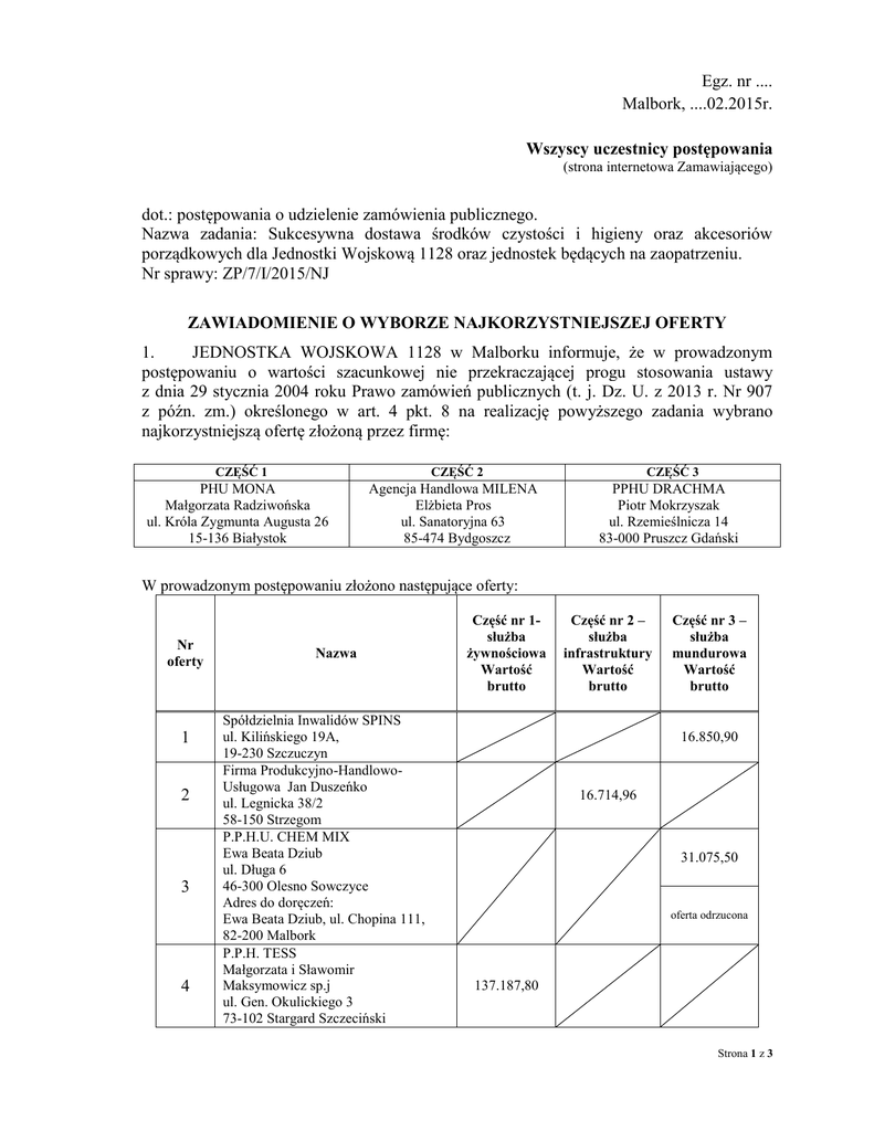 Egz. nr .... Malbork, ....02.2015r. Wszyscy uczestnicy postępowania (strona internetowa Zamawiającego) dot.: postępowania o udzielenie zamówienia publicznego. Nazwa zadania: Sukcesywna dostawa środków czystości i higieny oraz akcesoriów porządkowych dla Jednostki Wojskową 1128 oraz jednostek będących na zaopatrzeniu. Nr sprawy: ZP/7/I/2015/NJ ZAWIADOMIENIE O WYBORZE NAJKORZYSTNIEJSZEJ OFERTY 1. JEDNOSTKA WOJSKOWA 1128 w Malborku informuje, że w prowadzonym postępowaniu o wartości szacunkowej nie przekraczającej progu stosowania ustawy z dnia 29 stycznia 2004 roku Prawo zamówień publicznych (t. j. Dz. U. z 2013 r. Nr 907 z późn. zm.) określonego w art. 4 pkt. 8 na realizację powyższego zadania wybrano najkorzystniejszą ofertę złożoną przez firmę: CZĘŚĆ 1 CZĘŚĆ 2 PHU MONA Małgorzata Radziwońska ul. Króla Zygmunta Augusta 26 15-136 Białystok Agencja Handlowa MILENA Elżbieta Pros ul. Sanatoryjna 63 85-474 Bydgoszcz CZĘŚĆ 3 PPHU DRACHMA Piotr Mokrzyszak ul. Rzemieślnicza 14 83-000 Pruszcz Gdański W prowadzonym postępowaniu złożono następujące oferty: Nr oferty 1 2 3 4 Nazwa Spółdzielnia Inwalidów SPINS ul. Kilińskiego 19A, 19-230 Szczuczyn Firma Produkcyjno-HandlowoUsługowa Jan Duszeńko ul. Legnicka 38/2 58-150 Strzegom P.P.H.U. CHEM MIX Ewa Beata Dziub ul. Długa 6 46-300 Olesno Sowczyce Adres do doręczeń: Ewa Beata Dziub, ul. Chopina 111, 82-200 Malbork P.P.H. TESS Małgorzata i Sławomir Maksymowicz sp.j ul. Gen. Okulickiego 3 73-102 Stargard Szczeciński Część nr 1służba żywnościowa Wartość brutto Część nr 2 – służba infrastruktury Wartość brutto Część nr 3 – służba mundurowa Wartość brutto 16.850,90 16.714,96 31.075,50 oferta odrzucona 137.187,80 Strona 1 z 3 5 6 7 8 9 10 11 12 FARMPOL Sp. z o.o. ul. Nowatorów 8 80-298 Gdańsk Adres do doręczeń: Elena Migda, ul. Budowlanych 23, 80-298 Gdańsk LAS Kontny LAMS sp.j. ul. Przemysłowa 78 43-100 Tychy Przedsiębiorstwo Wielobranżowe MADA Kosiec i wspólnicy sp.j. ul. Słowicza 17 02-170 Warszawa Adres do doręczeń: Paweł Orzeł, ul. 1905 Roku 30B, 26-600 Radom Henry Kruse Sp. z o.o. ul. Kolejowa 3 Bielany Wrocławskie 55-049 Kobierzyce Agencja Handlowa MILENA Elżbieta Pros ul. Sanatoryjna 63 85-474 Bydgoszcz Przedsiębiorstwo Handlowe ADMOR Jerzy Moryto ul. Wierzbicka 58/1 26-600 Radom Adres do doręczeń: Jerzy Moryto, ul. Trzebińskiego 25/1, 26-600 Radom PHU MONA Małgorzata Radziwońska ul. Króla Zygmunta Augusta 26 15-136 Białystok PPHU DRACHMA Piotr Mokrzyszak ul. Rzemieślnicza 14 83-000 Pruszcz Gdański 8.405,46* została poprawiona z kwoty 8.417,46 27.554,06 * została poprawiona z kwoty 27.566,05 21.292,10* została poprawiona z kwoty21.304,10 13.009,83 oferta odrzucona 12.933,93 21.806,46 32.172,67 18.554,55 8.031,37 została poprawiona z kwoty 15.566,90 12.945,48 11.783,76 19.801,42 13.282,91 6.963,19 17.505,63 7.437,46 16.336,19 15.517,82* 12.666,84 Uzasadnienie wyboru: Oferty wybranych wykonawców spełniają wymagania zawarte w zaproszeniu do złożenia oferty, zostały złożone w określonym przez zamawiającego terminie oraz formie, są zgodne co do treści z wymaganiami zamawiającego uzyskały najwyższą ilość punktów w zakresie przyjętych kryteriów oceny oferty (najniższej ceny) tj. 100 pkt. Wykonawca spełnia wszystkie warunki udziału w postępowaniu. 2. Odrzucenie ofert: CZĘŚĆ 3 Oferta nr 3 – P.P.H.U. CHEM MIX Ewa Beata Dziub, ul. Długa 6, 46-300 Olesno Sowczyce Uzasadnienie faktyczne: Zgodnie z postanowieniami zaproszenia do składania ofert Wykonawca winien dostarczyć wraz z ofertą aktualny wyciąg z KRS lub Ewidencji i Działalności Gospodarczej wystawiony nie wcześniej niż 6 miesięcy przed upływem terminu składania ofert. Wykonawca nie załączył do oferty żadnego z w/w dokumentów. W związku z powyższym Zamawiający zgodnie z zapisami zaproszenia do składania ofert Strona 2 z 3 zwrócił się do Wykonawcy pismem z dnia 09.02.2015 r. o uzupełnienie brakującego dokumentu. Wykonawca w wyznaczonym przez Zamawiającego terminie do uzupełnienia oferty tj. do dnia 13.02.2015 r do godz. 10:00 uzupełnił brakujący dokument wygenerowany ze strony http://prod.ceidg.gov.pl w dniu 12.02.2015 r. Tym samym Wykonawca nie złożył wyciągu z CEIDG wystawionego wcześniej niż 6 miesięcy przed upływem terminu składania ofert tj. 28.01.2015r. Zgodnie z wyrokiem KIO z dnia 20.12.2011 r.(sygn. akt 2585/11) złożenie przez Wykonawcę dokumentów (oświadczeń) z datami późniejszymi niż upływ terminu składania ofert nie dyskredytuje tych dokumentów, jeżeli tylko z ich treści wynika, że Wykonawca spełniał warunki na dzień składania ofert. Z treści wyciągu z CEIDG nie da się wprost ustalić, czy na dzień składania ofert Wykonawca był w likwidacji lub upadłości. Wykonawca składając wydruk z CEIDG z datą po terminie otwarcia ofert zobowiązany jest do złożenia tzw. „historii wpisu” (do pobrania ze strony http://prod.ceidg.gov.pl), która zawiera informacje o wcześniejszych zmianach danych udostępnianych w ewidencji działalności gospodarczej. Połączenie tych dwóch dokumentów, tj. wyciągu z CEIDG i historii wpisu może poświadczyć, że Wykonawca na dzień składania ofert nie był w likwidacji lub upadłości, gdyż mimo wygenerowania tych dokumentów po dniu otwarcia ofert, z ich treści wynika, jakie były aktualne wpisy w ewidencji w określonym przedziale czasowym. Oferta nr 6 - LAS Kontny LAMS sp.j., ul. Przemysłowa 78, 43-100 Tychy Uzasadnienie faktyczne: Wykonawca nie złożył podpisu na formularzu cenowym. Konstytutywnym elementem formy pisemnej jest własnoręczny podpis, natomiast elementem konstytuującym podpis jest nazwisko wystawcy danego oświadczenia lub dokumentu. Wymóg własnoręczności podpisu pod oświadczeniem woli wynika z art. 78 § 1 Kodeksu Cywilnego według którego „do zachowania pisemnej formy czynności prawnej wystarcza złożenie własnor