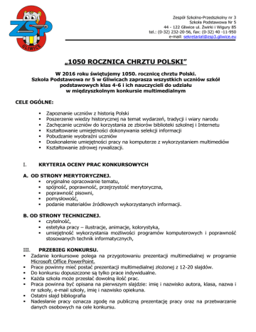 Zespół Szkolno-Przedszkolny nr 3 Szkoła Podstawowa Nr 5 44 - 122 Gliwice ul. Żwirki i Wigury 85 tel.: (0-32) 232-20-56, fax: (0-32) 40 -11-950 e-mail: [email protected] „1050 ROCZNICA CHRZTU POLSKI” W 2016 roku świętujemy 1050. rocznicę chrztu Polski. Szkoła Podstawowa nr 5 w Gliwicach zaprasza wszystkich uczniów szkół podstawowych klas 4-6 i ich nauczycieli do udziału w międzyszkolnym konkursie multimedialnym CELE OGÓLNE: Zapoznanie uczniów z historią Polski Poszerzenie wiedzy historycznej na temat wydarzeń, tradycji i wiary narodu Zachęcanie uczniów do korzystania ze zbiorów biblioteki szkolnej i Internetu Kształtowanie umiejętności dokonywania selekcji informacji Pobudzanie wyobraźni uczniów Doskonalenie umiejętności pracy na komputerze z wykorzystaniem multimediów Kształtowanie zdrowej rywalizacji. I. KRYTERIA OCENY PRAC KONKURSOWYCH A. OD STRONY MERYTORYCZNEJ. oryginalne opracowanie tematu, spójność, poprawność, przejrzystość merytoryczna, poprawność pisowni, pomysłowość, podanie materiałów źródłowych wykorzystanych informacji. B. OD STRONY TECHNICZNEJ. czytelność, estetyka pracy – ilustracje, animacje, kolorystyka, umiejętność wykorzystania możliwości programów komputerowych i poprawność stosowanych technik informatycznych, III. PRZEBIEG KONKURSU. Zadanie konkursowe polega na przygotowaniu prezentacji multimedialnej w programie Microsoft Office PowerPoint. Prace powinny mieć postać prezentacji multimedialnej złożonej z 12-20 slajdów. Do konkursu dopuszczone są tylko prace indywidualne. Każda szkoła może przesłać dowolną ilość prac. Praca powinna być opisana na pierwszym slajdzie: imię i nazwisko autora, klasa, nazwa i nr szkoły, e-mail szkoły, imię i nazwisko opiekuna. Ostatni slajd bibliografia Nadesłanie pracy oznacza zgodę na publiczną prezentację pracy oraz na przetwarzanie danych osobowych na cele konkursu. Nadesłane na konkurs prace nie będą zwracane. Organizator konkursu zastrzega sobie prawo archiwizowania prac w bibliotece multimedialnej SP5 w Gliwicach i ew. wykorzystanie ich na potrzeby dydaktyczne tej placówki. Organizatorzy przewidują dyplomy i nagrody rzeczowe za I, II, III miejsce, wyróżnienia oraz podziękowania dla opiekunów. Prace przyjmowane są do 15 listopada 2016r. w sekretariacie Szkoły Podstawowej nr 5 w Gliwicach oraz droga mailową: [email protected] w tytule proszę podać Konkurs 1050 rocznica chrztu Polski Warunkiem wzięcia udziału w konkursie jest wypełnienie oświadczenia 1 i 2 oraz przesłanie go mailem, faxem lub dostarczenie go wraz z pracą do sekretariatu SP 5 w Gliwicach. O wynikach konkursu uczestnicy zostaną poinformowani drogą e-mail do końca listopada 2016 roku. Organizatorkami konkursu są mgr Patrycja Małkiewicz mgr Izabela Krzecińska nauczycielki SP 5 w Gliwicach. OŚWIADCZENIE 1 Wyrażam zgodę na uczestnictwo mojego dziecka w Międzyszkolnym Konkursie Multimedialnym „1050 ROCZNICA CHRZTU POLSKI” organizowanego przez Zespół Szkolno – Przedszkolny nr 3 w Gliwicach, a także oświadczam, że zapoznałem(am) się z regulaminem konkursu. ...…............../............................................................................ (data) (czytelny podpis rodzica/opiekuna uczestnika konkursu) Oświadczam, że praca złożona na konkurs „1050 ROCZNICA CHRZTU POLSKI” organizowany przez Zespół Szkolno-Przedszkolny nr 3 w Gliwicach, została wykonana samodzielnie przez: ................................................................................................. (imię i nazwisko dziecka) Oświadczam ponadto, że przedmiotowa praca nie jest obciążona żadnymi roszczeniami oraz prawami osób trzecich ani nie narusza jakichkolwiek praw osób trzecich. ...…............../............................................................................ (data) (czytelny podpis rodzica/opiekuna uczestnika konkursu) OŚWIADCZENIE 2 Wyrażam zgodę na przetwarzanie danych osobowych mojego dziecka dla potrzeb niezbędnych do realizacji Konkursu „1050 ROCZNICA CHRZTU POLSKI” zgodnie z ustawą z dnia 29 sierpnia 1997 r. o ochronie danych osobowych (Dz. U. z 2002 r. Nr 101, poz. 926 z poźn. zm.). Wyrażam zgodę na opublikowanie imienia, nazwiska oraz wizerunku mojego dziecka w publikacjach Organizatora, na stronach internetowych i mediach. Jednocześnie oświadczam, że zostałem poinformowany o tym, że: 1. Administratorem danych osobowych Konkursu jest: Zespół Szkolno – Przedszkolny nr 3 w Gliwicach. 2. Dane będą przetwarzane dla realizacji Konkursu. Nie przewiduje się przekazywania danych. ...…............../............................................................................ (data) (czytelny podpis rodzica/opiekuna uczestnika konkursu) …………………………………………………………………………………………………………………………………………..………………………………………………………………………………………… OŚWIADCZENIE 1 Wyrażam zgodę na uczestnictwo mojego dziecka w Międzyszkolnym Konkursie Multimedialnym „1050 ROCZNICA CHRZTU POLSKI” organizowanego przez Zespół Szkolno – Przedszkolny nr 3 w Gliwicach, a także oświadczam, że zapoznałem(am) się z regulaminem konkursu. ...…............../............................................................................ (data) (czytelny podpis rodzica/opiekuna uczestnika konkursu) Oświadczam, że praca złożona na konkurs „1050 ROCZNICA CHRZTU POLSKI” organizowany przez Zespół Szkolno-Przedszkolny nr 3 w Gliwicach, została wykonana samodzielnie przez: ................................................................................................. (imię i nazwisko dziecka) Oświadczam ponadto, że przedmiotowa praca nie jest obciążona żadnymi roszczeniami oraz prawami osób trzecich ani nie narusza jakichkolwiek praw osób trzecich. ...…..............