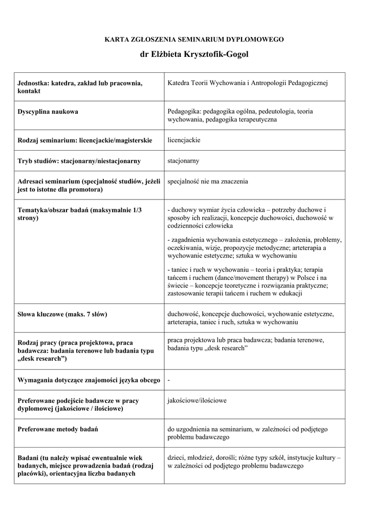 KARTA ZGŁOSZENIA SEMINARIUM DYPLOMOWEGO dr Elżbieta Krysztofik-Gogol Jednostka: katedra, zakład lub pracownia, kontakt Katedra Teorii Wychowania i Antropologii Pedagogicznej Dyscyplina naukowa Pedagogika: pedagogika ogólna, pedeutologia, teoria wychowania, pedagogika terapeutyczna Rodzaj seminarium: licencjackie/magisterskie licencjackie Tryb studiów: stacjonarny/niestacjonarny stacjonarny Adresaci seminarium (specjalność studiów, jeżeli jest to istotne dla promotora) specjalność nie ma znaczenia Tematyka/obszar badań (maksymalnie 1/3 strony) - duchowy wymiar życia człowieka – potrzeby duchowe i sposoby ich realizacji, koncepcje duchowości, duchowość w codzienności człowieka - zagadnienia wychowania estetycznego – założenia, problemy, oczekiwania, wizje, propozycje metodyczne; arteterapia a wychowanie estetyczne; sztuka w wychowaniu - taniec i ruch w wychowaniu – teoria i praktyka; terapia tańcem i ruchem (dance/movement therapy) w Polsce i na świecie – koncepcje teoretyczne i rozwiązania praktyczne; zastosowanie terapii tańcem i ruchem w edukacji Słowa kluczowe (maks. 7 słów) duchowość, koncepcje duchowości, wychowanie estetyczne, arteterapia, taniec i ruch, sztuka w wychowaniu Rodzaj pracy (praca projektowa, praca badawcza: badania terenowe lub badania typu „desk research”) praca projektowa lub praca badawcza; badania terenowe, badania typu „desk research” Wymagania dotyczące znajomości języka obcego - Preferowane podejście badawcze w pracy dyplomowej (jakościowe / ilościowe) jakościowe/ilościowe Preferowane metody badań do uzgodnienia na seminarium, w zależności od podjętego problemu badawczego Badani (tu należy wpisać ewentualnie wiek badanych, miejsce prowadzenia badań (rodzaj placówki), orientacyjna liczba badanych dzieci, młodzież, dorośli; różne typy szkół, instytucje kultury – w zależności od podjętego problemu badawczego Wymagana znajomość programów do obliczania wyników (wymagana/ nie wymagana) nie wymagana Inne wymagania lub informacje -