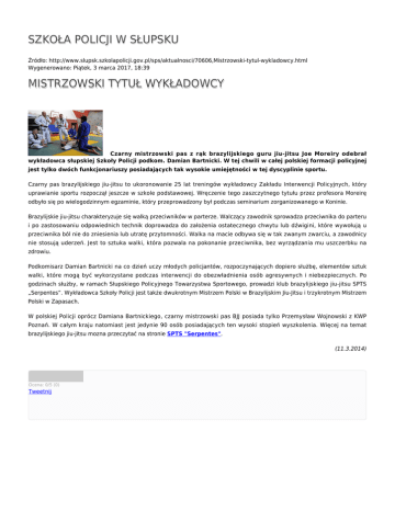 SZKOŁA POLICJI W SŁUPSKU Źródło: http://www.slupsk.szkolapolicji.gov.pl/sps/aktualnosci/70606,Mistrzowski-tytul-wykladowcy.html Wygenerowano: Piątek, 3 marca 2017, 18:39 MISTRZOWSKI TYTUŁ WYKŁADOWCY Czarny mistrzowski pas z rąk brazylijskiego guru jiu-jitsu Joe Moreiry odebrał wykładowca słupskiej Szkoły Policji podkom. Damian Bartnicki. W tej chwili w całej polskiej formacji policyjnej jest tylko dwóch funkcjonariuszy posiadających tak wysokie umiejętności w tej dyscyplinie sportu. Czarny pas brazylijskiego jiu-jitsu to ukoronowanie 25 lat treningów wykładowcy Zakładu Interwencji Policyjnych, który uprawianie sportu rozpoczął jeszcze w szkole podstawowej. Wręczenie tego zaszczytnego tytułu przez profesora Moreirę odbyło się po wielogodzinnym egzaminie, który przeprowadzony był podczas seminarium zorganizowanego w Koninie. Brazylijskie jiu-jitsu charakteryzuje się walką przeciwników w parterze. Walczący zawodnik sprowadza przeciwnika do parteru i po zastosowaniu odpowiednich technik doprowadza do założenia ostatecznego chwytu lub dźwigini, które wywołują u przeciwnika ból nie do zniesienia lub utratę przytomności. Walka na macie odbywa się w tak zwanym zwarciu, a zawodnicy nie stosują uderzeń. Jest to sztuka walki, która pozwala na pokonanie przeciwnika, bez wyrządzania mu uszczerbku na zdrowiu. Podkomisarz Damian Bartnicki na co dzień uczy młodych policjantów, rozpoczynających dopiero służbę, elementów sztuk walki, które mogą być wykorzystane podczas interwencji do obezwładnienia osób agresywnych i niebezpiecznych. Po godzinach służby, w ramach Słupskiego Policyjnego Towarzystwa Sportowego, prowadzi klub brazylijskiego jiu-jitsu SPTS „Serpentes”. Wykładowca Szkoły Policji jest także dwukrotnym Mistrzem Polski w Brazylijskim Jiu-Jitsu i trzykrotnym Mistrzem Polski w Zapasach. W polskiej Policji oprócz Damiana Bartnickiego, czarny mistrzowski pas BJJ posiada tylko Przemysław Wojnowski z KWP Poznań. W całym kraju natomiast jest jedynie 90 osób posiadających ten wysoki stopień wyszkolenia. Więcej na temat brazylijskiego jiu-jitsu mozna przeczytać na stronie SPTS "Serpentes". (11.3.2014) Ocena: 0/5 (0) Tweetnij