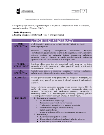 Projekt współfinansowany przez Unię Europejską w ramach Europejskiego Funduszu Społecznego Szczegółowy opis szkoleń, organizowanych w Wydziale Zamiejscowym WSB w Cieszynie, w ramach projektu „Wiosna z ABK”: 1.Techniki sprzedaży 2.Trening umiejętności liderskich (opis w przygotowaniu) 1. TECHNIKI SPRZEDAŻY OPIS SZKOLENIA „Jeśli priorytety klientów nie są naszymi priorytetami, nie mamy żadnych priorytetów.” Szkolenie dotyczy umiejętności budowania trwałych i satysfakcjonujących relacji z klientem. Szczególny nacisk w szkoleniu położony zostanie na działania służące skutecznym technikom sprzedaży. Istotnym obszarem szkolenia jest doskonalenie osobistego stylu realizowania zadań i rozwijania mocnych stron. PROFIL UCZESTNIKÓW CEL SZKOLENIA KORZYŚCI PROGRAM Szkolenie skierowane jest do wszystkich osób które na co dzień sprzedają lub będą sprzedawać i chcą podnieść swoje umiejętności radzenia sobie z klientami Kształtowanie postaw i zachowań sprzedawcy poprzez przekazanie technik, strategii i narzędzi wspierających handlowców. W dzisiejszych czasach dobry produkt to nie wszystko. Niezbędny jest człowiek, który potrafi go sprzedać i zdobyć uznanie i zadowolenie klientów. Dzięki szkoleniu uczestnicy poznają swoje mocne strony, których atutów nie wykorzystują, a które nawyki ograniczają skuteczną sprzedaż. Popracujemy nad proaktywna postawa, motywacją i pewnością siebie. Co najważniejsze uczestnicy poznają gotowe schematy postepowania w różnych sytuacjach handlowych. 1. Kompetencje sprzedawcy Jak sprzedawać z satysfakcją Rozpoznawanie swoich mocnych stron Przekonanie i nastawienie do procesu sprzedaży Poznawanie własnych źródeł motywacji. Dekalog sprzedawcy Motywacja do pracy kluczem skutecznego sprzedawcy 2. Komunikacja Rozpoznawanie potrzeb klienta. Komunikacja a budowanie dobrych relacji z klientem Komunikacja werbalna i niewerbalna Projekt współfinansowany przez Unię Europejską w ramach Europejskiego Funduszu Społecznego 3. 4. 5. 6. 7. 8. Postawy sprzedawcy wobec klienta Pytaj i Słuchaj - dlaczego jest to tak ważne w procesie obsługi Klienta? Nim odwiedzisz pierwszego klienta 1. Czynniki wpływające na osiągnięcie sukcesu 2. Określanie celów handlowych (ilościowych i jakościowych). SMART 3. osiąganie celu metodą KAIZEN Prezentacja handlowa 4. Etapy rozmowy handlowej 5. Rola i znaczenie odkrywania, zaspokajania i przekraczania oczekiwań Klientów 6. Język korzyści 7. Prezentacja oferty (Zasada CZK) 8. Interakcje z klientem Kim jest klient Klienci różnych sektorów sprzedaży Motywy zakupowe klientów. Charakterystyka osobowości klientów Rozpoznanie charakteru rozmówcy. Dostosowanie strategii komunikacyjnej do rozmówcy. Trudne sytuacje handlowe – pokonywanie najczęstszych obiekcji klienta Techniki odpierania zastrzeżeń Techniki reagowania na zastrzeżenia. Kiedy i jak mówić o cenie Asertywne budowanie relacji w sprzedaży z ,,trudnym’’ klientem Agresywne zachowania klienta Finalizowanie sprzedaży Zamkniecie sprzedaży- podsumowanie zobowiązań Zamykanie transakcji bezowocnych Poszerzanie sprzedaży Budowanie długofalowych relacji Trening umiejętności sprzedażowych Przeprowadzenie pełnej wizyty handlowej z wykorzystaniem zdobytej wiedzy i umiejętności. METODOLOGIA Wykład prowadzony metodą interaktywną. Część warsztatowa obejmuje: ćwiczenia w małych grupach, Projekt współfinansowany przez Unię Europejską w ramach Europejskiego Funduszu Społecznego ćwiczenia indywidualne, dyskusję moderowaną, wymianę doświadczeń uczestników, odgrywanie ról. CZAS TRWANIA 2 dni (16 h dydaktycznych) MATERIAŁY Każdy uczestnik otrzymuje własny skrypt zawierający całość informacji przekazywanych w trakcie szkolenia. PROWADZĄCY Marcin Grzelak Posiada 12-letnie doświadczenie zawodowe zdobyte w największych sieciach handlowych. Piastował stanowisko menedżerskie w jednej z największych sieci spożywczych. Swoje doświadczenie jak i wiedzę połączył jako trener-praktyk w sieci Intermarche (SCA PR Polska). Przeszkolił tam rzesze sprzedawców i koordynował otwarcia w kilkudziesięciu placówkach handlowych. Szkolił menedżerów oraz przyczynił się do rozwoju wiedzy i umiejętności przyszłych właścicieli spółek franchisingowych. Tworzył i wdrażał w sieci MediaExpert (TERG Sp. z o. o.) Standardy Obsługi Klienta, na którym pracuje ponad dwa tysiące sprzedawców. Jako trener wewnętrzny specjalizował się w szkoleniach z technik sprzedaży, obsługi klienta oraz reklamacji na poziomie podstawowym jak i zaawansowanym. Dzięki zdobytemu doświadczeniu, obecnie jako trener freelancer realizuje szkolenia zarówno dla sprzedawców, menedżerów, właścicieli firm jaki i instytucji publicznych. Specjalista z zakresu sprzedaży (m.in. techniki sprzedaży, obsługi klienta, telemarketing, zarządzanie sprzedażą,) oraz rozwoju osobistego. Akredytowany trener metodologii Insights Discovery, na bazie której prowadzi autorskie programy szkoleniowo-rozwojowe dla zespołów i liderów. Autor wielu filmów szkoleniowych z zakresu sprzedaży dla największych sieci handlowych w Polsce.