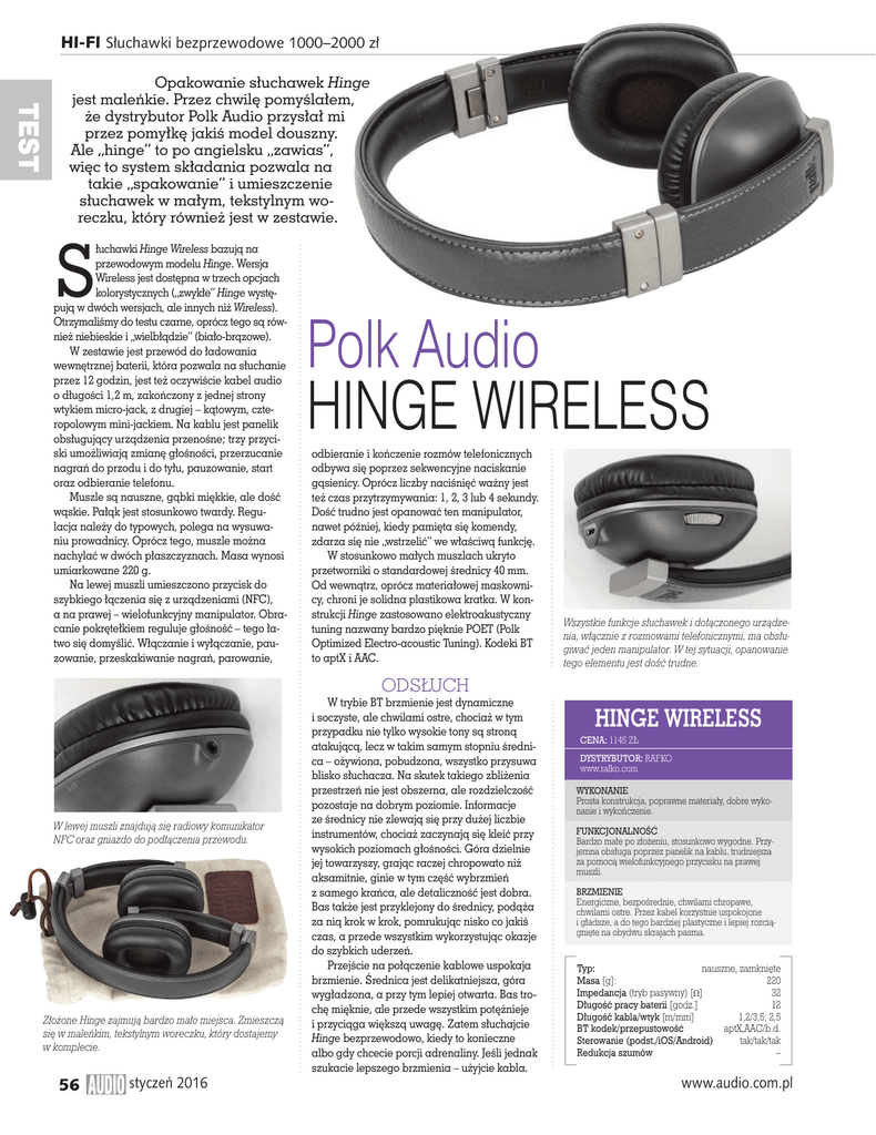 HI-FI Słuchawki bezprzewodowe 1000–2000 zł TEST Opakowanie słuchawek Hinge jest maleńkie. Przez chwilę pomyślałem, że dystrybutor Polk Audio przysłał mi przez pomyłkę jakiś model douszny. Ale „hinge” to po angielsku „zawias”, więc to system składania pozwala na takie „spakowanie” i umieszczenie słuchawek w małym, tekstylnym woreczku, który również jest w zestawie. S łuchawki Hinge Wireless bazują na przewodowym modelu Hinge. Wersja Wireless jest dostępna w trzech opcjach kolorystycznych („zwykłe” Hinge występują w dwóch wersjach, ale innych niż Wireless). Otrzymaliśmy do testu czarne, oprócz tego są również niebieskie i „wielbłądzie” (biało-brązowe). W zestawie jest przewód do ładowania wewnętrznej baterii, która pozwala na słuchanie przez 12 godzin, jest też oczywiście kabel audio o długości 1,2 m, zakończony z jednej strony wtykiem micro-jack, z drugiej – kątowym, czteropolowym mini-jackiem. Na kablu jest panelik obsługujący urządzenia przenośne; trzy przyciski umożliwiają zmianę głośności, przerzucanie nagrań do przodu i do tyłu, pauzowanie, start oraz odbieranie telefonu. Muszle są nauszne, gąbki miękkie, ale dość wąskie. Pałąk jest stosunkowo twardy. Regulacja należy do typowych, polega na wysuwaniu prowadnicy. Oprócz tego, muszle można nachylać w dwóch płaszczyznach. Masa wynosi umiarkowane 220 g. Na lewej muszli umieszczono przycisk do szybkiego łączenia się z urządzeniami (NFC), a na prawej – wielofunkcyjny manipulator. Obracanie pokrętełkiem reguluje głośność – tego łatwo się domyślić. Włączanie i wyłączanie, pauzowanie, przeskakiwanie nagrań, parowanie, Polk Audio HINGE WIRELESS odbieranie i kończenie rozmów telefonicznych odbywa się poprzez sekwencyjne naciskanie gąsienicy. Oprócz liczby naciśnięć ważny jest też czas przytrzymywania: 1, 2, 3 lub 4 sekundy. Dość trudno jest opanować ten manipulator, nawet później, kiedy pamięta się komendy, zdarza się nie „wstrzelić” we właściwą funkcję. W stosunkowo małych muszlach ukryto przetworniki o standardowej średnicy 40 mm. Od wewnątrz, oprócz materiałowej maskownicy, chroni je solidna plastikowa kratka. W konstrukcji Hinge zastosowano elektroakustyczny tuning nazwany bardzo pięknie POET (Polk Optimized Electro-acoustic Tuning). Kodeki BT to aptX i AAC. Wszystkie funkcje słuchawek i dołączonego urządzenia, włącznie z rozmowami telefonicznymi, ma obsługiwać jeden manipulator. W tej sytuacji, opanowanie tego elementu jest dość trudne. ODSŁUCH W lewej muszli znajdują się radiowy komunikator NFC oraz gniazdo do podłączenia przewodu. Złożone Hinge zajmują bardzo mało miejsca. Zmieszczą się w maleńkim, tekstylnym woreczku, który dostajemy w komplecie. 56 styczeń 2016 W trybie BT brzmienie jest dynamiczne i soczyste, ale chwilami ostre, chociaż w tym przypadku nie tylko wysokie tony są stroną atakującą, lecz w takim samym stopniu średnica – ożywiona, pobudzona, wszystko przysuwa blisko słuchacza. Na skutek takiego zbliżenia przestrzeń nie jest obszerna, ale rozdzielczość pozostaje na dobrym poziomie. Informacje ze średnicy nie zlewają się przy dużej liczbie instrumentów, chociaż zaczynają się kleić przy wysokich poziomach głośności. Góra dzielnie jej towarzyszy, grając raczej chropowato niż aksamitnie, ginie w tym część wybrzmień z samego krańca, ale detaliczność jest dobra. Bas także jest przyklejony do średnicy, podąża za nią krok w krok, pomrukując nisko co jakiś czas, a przede wszystkim wykorzystując okazje do szybkich uderzeń. Przejście na połączenie kablowe uspokaja brzmienie. Średnica jest delikatniejsza, góra wygładzona, a przy tym lepiej otwarta. Bas trochę mięknie, ale przede wszystkim potężnieje i przyciąga większą uwagę. Zatem słuchajcie Hinge bezprzewodowo, kiedy to konieczne albo gdy chcecie porcji adrenaliny. Jeśli jednak szukacie lepszego brzmienia – użyjcie kabla. HINGE WIRELESS CENA: 1145 ZŁ DYSTRYBUTOR: RAFKO www.rafko.com WYKONANIE Prosta konstrukcja, poprawne materiały, dobre wykonanie i wykończenie. FUNKCJONALNOŚĆ Bardzo małe po złożeniu, stosunkowo wygodne. Przyjemna obsługa poprzez panelik na kablu, trudniejsza za pomocą wielofunkcyjnego przycisku na prawej muszli. BRZMIENIE Energiczne, bezpośrednie, chwilami chropawe, chwilami ostre. Przez kabel korzystnie uspokojone i gładsze, a do tego bardziej plastyczne i lepiej rozciągnięte na obydwu skrajach pasma. Typ: nauszne, zamknięte Masa [g]: 220 Impedancja (tryb pasywny) [W] 32 Długość pracy baterii [godz.] 12 Długość kabla/wtyk [m/mm] 1,2/3,5; 2,5 BT kodek/przepustowość aptX,AAC/b.d. Sterowanie (podst./iOS/Android) tak/tak/tak Redukcja szumów – www.audio.com.pl