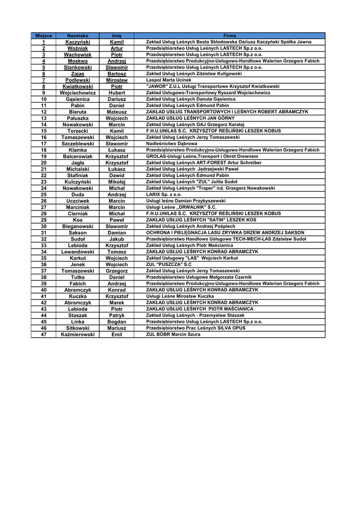 Miejsce Nazwisko Imię 1 2 3 4 5 6 7 8 9 10 11 12 13 14 15 16 17 18 19 20 21 22 23 24 25 26 27 28 29 30 31 32 33 34 35 36 37 38 39 40 41 42 43 44 45 46 47 Kaczyński Woźniak Wachowiak Moskwa Stankowski Zajas Podlewski Kwiatkowski Wojciechowicz Gąsienica Pabin Bieruta Pałuszka Nowakowski Torzecki Tomaszewski Szczeblewski Klamka Balcerowiak Jagła Michalski Stafiniak Kulczyński Nowakowski Duda Uczciwek Marciniak Cierniak Kos Bieganowski Sakson Sudoł Lebioda Lewandowski Karkut Jenek Tomaszewski Tutka Fabich Abramczyk Kuczka Abramczyk Lebioda Staszak Linka Sitkowski Kaźmierowski Kamil Artur Piotr Andrzej Sławomir Bartosz Mirosław Piotr Hubert Dariusz Daniel Mateusz Wojciech Marcin Kamil Wojciech Sławomir Łukasz Krzysztof Krzysztof Łukasz Dawid Mikołaj Michał Andrzej Marcin Marcin Michał Paweł Sławomir Damian Jakub Krzysztof Tomasz Wojciech Wojciech Grzegorz Daniel Andrzej Konrad Krzysztof Marek Piotr Patryk Bogdan Mariusz Emil Firma Zakład Usług Leśnych Beata Skłodowska Dariusz Kaczyński Spółka Jawna Przedsiębiorstwo Usług Leśnych LASTECH Sp.z o.o. Przedsiębiorstwo Usług Leśnych LASTECH Sp.z o.o. Przedsiębiorstwo Produkcyjno-Usługowo-Handlowe Walerian Grzegorz Fabich Przedsiębiorstwo Usług Leśnych LASTECH Sp.z o.o. Zakład Usług Leśnych Zdzisław Kuligowski Laspol Marta Ucinek "JAWOR" Z.U.L Usługi Transportowe Krzysztof Kwiatkowski Zakład Usługowo-Transportowy Ryszard Wojciechowicz Zakład Usług Leśnych Danuta Gąsienica Zakład Usług Leśnych Edmund Pabin ZAKŁAD USŁUG TRANSPORTOWYCH I LEŚNYCH ROBERT ABRAMCZYK ZAKŁAD USŁUG LEŚNYCH JAN GÓRNY Zakład Usług Leśnych GAJ Grzegorz Karataj F.H.U.UNILAS S.C. KRZYSZTOF REŚLIŃSKI LESZEK KOBUS Zakład Usług Leśnych Jerzy Tomaszewski Nadleśnictwo Dąbrowa Przedsiębiorstwo Produkcyjno-Usługowo-Handlowe Walerian Grzegorz Fabich GROLAS-Usługi Leśne,Transport i Obrót Drewnem Zakład Usług Leśnych ART-FOREST Artur Schreiber Zakład Usług Leśnych Jędrzejwski Paweł Zakład Usług Leśnych Edmund Pabin Zakład Usług Leśnych "ZUL" Julita Sudoł Zakład Usług Leśnych "Traper" inż. Grzegorz Nowakowski LARIX Sp. z o.o. Usługi leśne Damian Przybyszewski Usługi Leśne ,,DRWALNIK'' S.C. F.H.U.UNILAS S.C. KRZYSZTOF REŚLIŃSKI LESZEK KOBUS ZAKŁAD USŁUG LEŚNYCH "SATIN" LESZEK KOS Zakład Usług Leśnych Andrzej Pośpiech OCHRONA I PIELĘGNACJA LASU ZRYWKA DRZEW ANDRZEJ SAKSON Przedsiębiorstwo Handlowo Usługowe TECH-MECH-LAS Zdzisław Sudoł Zakład Usług Leśnych Piotr Maścianica ZAKŁAD USŁUG LEŚNYCH KONRAD ABRAMCZYK Zakład Usługowy "LAS" Wojciech Karkut ZUL "PUSZCZA" S.C Zakład Usług Leśnych Jerzy Tomaszewski Przedsiębiorstwo Usługowe Małgorzata Czarnik Przedsiębiorstwo Produkcyjno-Usługowo-Handlowe Walerian Grzegorz Fabich ZAKŁAD USŁUG LEŚNYCH KONRAD ABRAMCZYK Usługi Leśne Mirosław Kuczka ZAKŁAD USŁUG LEŚNYCH KONRAD ABRAMCZYK ZAKŁAD USŁUG LEŚNYCH PIOTR MAŚCIANICA Zakład Usług Leśnych - Przemysław Staszak Przedsiębiorstwo Usług Leśnych LASTECH Sp.z o.o. Przedsiębiorstwo Prac Leśnych SILVA OPUS ZUL BÓBR Marcin Szura