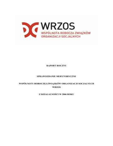 RAPORT ROCZNY SPRAWOZDANIE MERYTORYCZNE WSPÓLNOTY ROBOCZEJ ZWIĄZKÓW ORGANIZACJI SOCJALNYCH WRZOS Z DZIAŁALNOŚCI W 2006 ROKU W realizacji zadań pomagali nam w 2006 roku następujący sponsorzy: DEUTSCHER PARITÄTISCHER WOHLFAHRTSVERBAND GESAMTSVERBAND e.V. NIEMIECKI PARYTETOWY ZWIĄZEK SOCJALNY - ZWIĄZEK FEDERALNY FUNDACJA “Akcja Człowiek” FUNDACJA im S. BATOREGO MINISTERSTWO PRACY I POLITYKI SPOŁECZNEJ MINISTERSTWO ROZWOJU – EFS KOMISJA EUROPEJSKA Dziękujemy. 2 Wstęp Wspólnota Robocza Związków Organizacji Socjalnych - WRZOS jest organizacją o charakterze federacyjnym, zarejestrowaną w lutym 2000 roku i zrzeszającą 15 regionalnych związków stowarzyszeń organizacji działających na polu pomocy społecznej w województwach: dolnośląskim, lubelskim, lubuskim, małopolskim, mazowieckim, pomorskim, śląskim, wielkopolskim, opolskim, podkarpackim, łódzkim, świętokrzyskim zachodniopomorskim, kujawsko-pomorskim, warmińsko-mazurskim oraz 4 ponadregionalne struktury o zasięgu ogólnopolskim ( Federacja Polskich Banków śywności, CROSS - Stowarzyszenie Kultury Fizycznej, Sportu i Turystyki Osób Niewidomych i Słabowidzących, Ogólnopolskie Stowarzyszenie Pracowników i Sympatyków Środowiskowych Domów Samopomocy, Związek Stowarzyszeń Rodzin i Opiekunów Osób Chorych Psychicznie „POL-FAMILA” ). Na poziomie lokalnym do struktury formalnie przynaleŜy ok. 550 organizacji socjalnych. Aktualnie WRZOS wspiera procesy federalizacyjne w województwie podlaskim. Główne cele WRZOS to: Celem WRZOS jest techniczne, szkoleniowe i informacyjne wspomaganie organizacji pozarządowych w następujących zakresach: pomocy społecznej, w tym pomocy rodzinom i osobom w trudnej sytuacji Ŝyciowej oraz wyrównywania szans tych rodzin i osób, działalności charytatywnej, ochrony i promocji zdrowia, działania na rzecz osób niepełnosprawnych, promocji zatrudnienia i aktywizacji zawodowej osób pozostających bez pracy i zagroŜonych zwolnieniem z pracy, upowszechnienia i ochrony praw kobiet oraz działalności na rzecz równych praw kobiet i męŜczyzn, działalności wspomagającej rozwój wspólnot i społeczności lokalnych, nauki, edukacji, oświaty i wychowania, krajoznawstwa oraz wypoczynku dzieci i młodzieŜy, kultury, sztuki, ochrony dóbr kultury i tradycji, porządku i bezpieczeństwa publicznego oraz przeciwdziałania patologiom społecznym, upowszechniania i ochrony wolności i praw człowieka oraz swobód obywatelskich 3 a takŜe działań wspierających rozwój demokracji, działalności na rzecz mniejszości narodowych, ratownictwa i ochrony ludności, pomocy ofiarom katastrof, klęsk Ŝywiołowych, konfliktów zbrojnych i wojen w kraju i za granicą, działań na rzecz integracji europejskiej oraz rozwijania kontaktów i współpracy między społeczeństwami, promocji i organizacji wolontariatu. Działalność statutowa WRZOS prowadzona jest wyłącznie na rzecz ogółu społeczności, ze szczególnym uwzględnieniem grup i osób pozostających w szczególnie trudnej sytuacji Ŝyciowej lub materialnej w stosunku do społeczeństwa, w tym dotkniętych lub zagroŜonych społecznym wykluczeniem. Formy realizacji zadań WRZOS Cele statutowe WRZOS realizowane są przez: reprezentowanie organizacji pozarządowych, zwłaszcza organizacji członkowskich wobec sektora publicznego i innych środowisk, w tym opiniowanie prawodawstwa na szczeblu ogólnopolskim, regionalnym i lokalnym oraz współpracę z podmiotami publicznymi w kształtowaniu polityki dotyczącej organizacji pozarządowych oraz polityki społecznej i praktyki administracyjnej dotyczącej rozwiązywania problemów grup zagroŜonych bądź dotkniętych wykluczeniem społecznym, doradztwo, wymianę doświadczeń pomiędzy organizacjami członkowskimi oraz merytoryczne i metodyczne wspieranie ich działalności, w tym organizowanie konferencji, seminariów, zwłaszcza z uczestnictwem reprezentantów administracji publicznej i innych środowisk, organizowanie szkoleń, publikacje, rozwijanie obywatelskiej aktywności socjalnej, m.in. poprzez pomoc w tworzeniu nowych organizacji pozarządowych i ich związków, współpracę z innymi organizacjami pozarządowymi, grupami nieformalnymi i instytucjami, promocję i organizację samopomocy i wolontariatu, nawiązywanie współpracy i wymiana doświadczeń z partnerami zagranicznymi, prowadzenie działalności i usług socjalnych w celu wspierania realizacji wyŜej wymienionych celów, inne działania, wynikające z aktualnych potrzeb środowiska socjalnych organizacji pozarządowych, zwłaszcza organizacji członkowskich i potrzeb osób, którym organizacje członkowskie słuŜą. Działania WRZOS słuŜą rozwiązywaniu kwestii istotnych dla efektywnego funkcjonowania organizacji i inicjatyw obywatelskich, adresujących swoją działalność do osób, rodzin i innych grup społecznych zagroŜonych róŜnorodnymi deficytami, ubóstwem, degradacją czy teŜ wykluczeniem społecznym. 4 Do wspólnych, bliskich nam wartości naleŜą: NiezaleŜność - wolność w decydowaniu o misji, celach oraz metodach pracy; dywersyfikacja źródeł finansowania; apolityczność rozumiana jako nie identyfikowanie i nie uleganie wpływom jakiejkolwiek partii i opcji politycznej. Tolerancja - opierająca się na szanowaniu tak w ramach organizacji jak i poza nią kaŜdej osoby, instytucji, organizacji, partnerów. Transparentność - udostępnienie swojego programu, statutu, programu działań i zasad pracy, a takŜe podawanie o publicznej wiadomości sprawozdań merytorycznych i finansowych z zakończonych działań. Rzetelność - podejmowanie działań na miarę posiadanych moŜliwości finansowych i kompetencji; wywiązywanie się z podjętych umów i zobowiązań; ocena i ewaluacja jako stały element kaŜdego działania, dbałość o doskonalenie i rozwój, ale równieŜ i o najwyŜszą jakość pracy. Otwartość - współpraca i poszukiwanie partnerów społecznych 