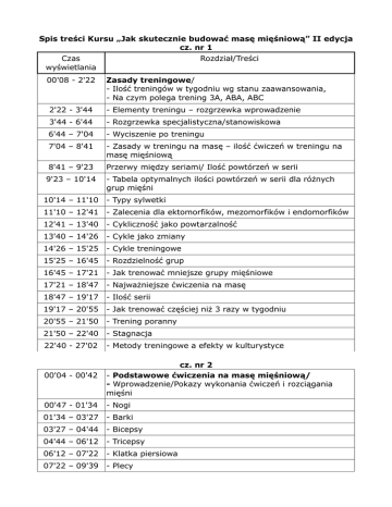 Spis treści Kursu „Jak skutecznie budować masę mięśniową” II edycja cz. nr 1 Czas wyświetlania 00'08 - 2'22 Rozdział/Treści Zasady treningowe/ - Ilość treningów w tygodniu wg stanu zaawansowania, - Na czym polega trening 3A, ABA, ABC 2'22 - 3'44 - Elementy treningu – rozgrzewka wprowadzenie 3'44 - 6'44 - Rozgrzewka specjalistyczna/stanowiskowa 6'44 – 7'04 - Wyciszenie po treningu 7'04 – 8'41 - Zasady w treningu na masę – ilość ćwiczeń w treningu na masę mięśniową 8'41 – 9'23 Przerwy między seriami/ Ilość powtórzeń w serii 9'23 – 10'14 - Tabela optymalnych ilości powtórzeń w serii dla różnych grup mięśni 10'14 – 11'10 - Typy sylwetki 11'10 – 12'41 - Zalecenia dla ektomorfików, mezomorfików i endomorfików 12'41 – 13'40 - Cykliczność jako powtarzalność 13'40 – 14'26 - Cykle jako zmiany 14'26 – 15'25 - Cykle treningowe 15'25 – 16'45 - Rozdzielność grup 16'45 – 17'21 - Jak trenować mniejsze grupy mięśniowe 17'21 – 18'47 - Najważniejsze ćwiczenia na masę 18'47 – 19'17 - Ilość serii 19'17 – 20'55 - Jak trenować częściej niż 3 razy w tygodniu 20'55 – 21'50 - Trening poranny 21'50 – 22'40 - Stagnacja 22'40 - 27'02 - Metody treningowe a efekty w kulturystyce 00'04 - 00'42 cz. nr 2 - Podstawowe ćwiczenia na masę mięśniową/ - Wprowadzenie/Pokazy wykonania ćwiczeń i rozciągania mięśni 00'47 - 01'34 - Nogi 01'34 – 03'27 - Barki 03'27 – 04'44 - Bicepsy 04'44 – 06'12 - Tricepsy 06'12 – 07'22 - Klatka piersiowa 07'22 – 09'39 - Plecy 09'39 - 10'19 - Brzuch 10'19 – 11'48 - Odcinek lędźwiowy kręgosłupa 11'48 – 12'58 - Podsumowanie naszego zestawu i rady co do doboru ćwiczeń 12'58 – 18'32 - Przetrenowanie/ - Jak odróżnić przetrenowanie od niechęci - Co robić w poszczególnych przypadkach cz. nr 3 00'04 – 03'13 - Rozciąganie/ - Wprowadzenie - Pokaz zestawu ćwiczeń 03'13 – 04'13 - Omówienie powodów i korzyści z rozciągania 04'13 – 12'40 - Omówienie poszczególnych póz rozciągających 12'40 – 14'09 - Podsumowanie rozdziału o rozciąganiu 14'09 – 20'30 - Notowanie/ - Co powinno się znaleźć w notesie treningowym - Jak wykorzystywać notatki - Jaka intensywność treningu jest optymalna w treningu na masę cz. nr 4 00'05 - 1'14 - Odżywianie/ - Definicja, substancje odżywcze 1'14 – 4'31 - Białka – ich rola i źródła 4'31 – 5'11 - Węglowodany – podział i źródła 5'11 – 6'27 - Tłuszcze – podział i źródła 6'27 – 8'17 - Witaminy i minerały – ich rola, źródła 8'17 – 10'20 - Woda – znaczenie i zapotrzebowanie 10'20 – 11'52 - Rady praktyczne co do ilości posiłków, jakości żywności i jej źródeł 11'52 – 12'24 - Warzywa, które są najlepsze dla kulturystów 12'24 – 13'45 - Tłuszcze – polecane źródła 13'44 – 14'28 - Witaminy i minerały – jak spożywać 14'28 – 15'16 - Jak pić wodę 15'16 – 16'00 - Posiłki/poranny 16'00– 16'45 - Drugi posiłek 16'45 – 18'45 - Trzeci posiłek 18'45 – 24'17 - Pora około-treningowa 00'04 – 02'08 cz. nr 5 - Posiłek po-treningowy - rozwinięcie 02'08 – 26'37 - 2 warianty posiłku po-treningowego 02'24 – 04'04 - I wariant/Omówienie podstaw 04'04 – 07'02 - Jakie produkty białkowe są najlepsze po treningu 07'02 – 07'48 - II wariant – omówienie różnic w przyjmowaniu węglowodanów 07'48 – 08'36 - Zasada 120 minuty po treningu 08'36 – 09'06 - Jak postępować kiedy trening jest wykonany bardzo późno, blisko pory na sen 09'06 – 10'52 - Trening poranny – co z posiłkami 10'52 – 11'36 - Rada dla „zabieganych” 11'36 – 12'05 - Magiczna minuta po treningu 12'05 – 12'58 - Jak zabezpieczyć się na noc 12'58 – 14'17 - Porady praktyczne n/t odżywiania 14'17 – 15'20 - Jak reagują hormony anaboliczne w porze po-treningowej 15'20 – 15'52 - Jak jeść ziemniaki i jaja 15'52 – 16'58 - Co się dzieje w sytuacjach krytycznych (brak dostarczenia optymalnych produktów) 16'58 - 18'11 - Ważne zasady w kulturystyce – kiedy budujemy szybko masę 00'04 – 01'13 cz. nr 6 - Suplementacja/ - Dlaczego warto brać suplementy 01'13 – 02'23 - Jaki suplement powinniśmy brać zawsze i jak go dobrać dla siebie 02'23 – 03'54 - Co powinieneś ustalić zanim kupisz pierwsze odżywki 03'54 – 04'09 - Kiedy przyjmować preparaty witaminowo-mineralne 04'09 – 04'55 - Jak brać odżywki w dni treningowe i dni wolne 04'55 – 05'50 - W czym rozpuszczać odżywki 05'50 – 07'08 - Jak postępować z nową odżywką 07'08 – 07'47 - Odżywki a posiłki – co i kiedy 07'47 – 08'52 - Uwaga na okazje – jak do nich podejść 08'52 – 10'10 - Źródła białek w odżywkach i ich znaczenie na przydatność w budowaniu masy mięśniowej 10'10 – 11'19 - Tańszy wariant suplementacji 11'19 – 12'40 - Jak wspomóc odtłuszczanie suplementami 12'40 – 14'12 - Cykle w suplementacji 14'12 – 15'39 - Cykl kreatynowy I, 15'39 – 17'36 - Sposoby przyjmowania kreatyny, prawidłowe łączenie z innymi produktami 17'36 – 18'40 - Jak wykorzystać insulinę by lepiej przyswoić kreatynę 18'40 – 20'05 - Dlaczego powinieneś zrezygnować z pepsi i kawy w czasie cyklu kreatynowego 20'05 – 20'58 - Wariant droższy suplementacji/Jakie suplementy polecamy dodatkowo 20'58 – 21'42 - Jak przyjmować aminokwasy i glutaminę 21'42 – 23'12 - Jak podnieść poziomy hormonów anabolicznych poprzez suplementy 23'12 – 23'58 - Terminarz przyjmowania posiłków i suplementów w dzień treningowy 23'58 – 24'47 - Glutamina – dlaczego warto ja przyjmować 24'47 – 26'14 - Cykl kreatynowy II Tabela łączenia suplementów w cyklu kreatynowym 26'14 – 27'54 - HMB/Jak stosować 27'54 – 28'34 - Jak czytać teksty reklamowe czyli jak oszczędzić 28'34 – 29'18 - Przerwy w suplementacji 29'18 - 30'48 - Podsumowanie