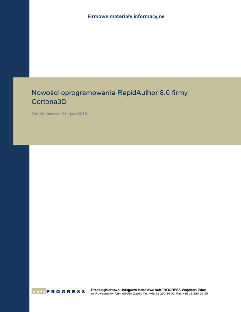 Firmowe materiały informacyjne Nowości oprogramowania RapidAuthor 8.0 firmy Cortona3D Opublikowano: 21 lipca 2015 Przedsiębiorstwo Usługowo Handlowe softPROGRESS Wojciech Zdun ul. Powstańców 72H, 05-091 Ząbki, Tel. +48 22 250 26 50, Fax +48 22 250 26 55 Firmowe materiały informacyjne Różnice pomiędzy RapidAuthor i RapidAuthor S Należy zwrócić uwagę, że istnieją dwie różne wersje oprogramowania: RapidAuthor i RapidAuthor S. RapidAuthor S jest wersją, która importuje wyłącznie dane JT z Teamcenter. RapidAuthor, który dostarczany jest przez softPROGRESS jako wersja niezależna (standalone), i który daje o wiele większe możliwości importu różnych formatów danych CAD 3D np.: CATIA, NX, SolidWorks, Solid Edge, etc. oraz formatów obojętnych jak STEP, Parasolid, etc. Co nowego w RapidAuthor wersja 8.0 Cortona3D, udostępniła nową wersję RapidAuthor v. 8.0 zapewniającą znaczną poprawę importu danych i nowe funkcje edycji obrazów wektorowych 2D CGM. RapidAuthor pozwala na automatyczne tworzenie obrazów 2D CGM z modeli 3D i ich modyfikacje w oprogramowaniu Cortona2D Editor Pro. Nowa wersja edytora zawiera galerię obiektów parametrycznych (strzałki, objaśnienia, proste kształty i linie), więc ilustratorzy mogą łatwo tworzyć szablony z wymaganych obiektów. Powoduje to znaczne oszczędności czasu podczas pracy. Nowa wersja obsługuje różne jednostki miar i oferuje liczne udoskonalenia interfejsu. RapidAuthor S importuje teraz alternatywne reprezentacje części z PLMXML, udoskonalono także import danych BOP. Proces importu może być teraz przeprowadzany w tle innych działań. Inne nowe funkcje w RapidAuthor 8.0 obejmują: Możliwość wykorzystania formatów JT 10, NX 10, CATIA V5-6 2014, Solid Edge ST7 , Creo Parametric 3.0, Autodesk Inventor 2015, SolidWorks 2015, Parasolid 27 (tylko w RapidAuthor). Możliwość zmiany parametrów reprezentacji. Ulepszone algorytmy aktualizacji. Liczne poprawki błędów i ulepszenia interfejsu. Szczegółowy opis nowych funkcji znajduje się poniżej. Aktualizacje w RapidAuthor i RapidAuthor S Usprawnienia procesu przygotowania dokumentów (Authoring) • • • • • Możliwości zmiany parametrów reprezentacji takich jak: crease angle, solid, ccw. Bieżące reprezentacje elementów są wyświetlane na liście pozycji (Itemów) w kolumnie „Reprezentacja”. Skala / linia czasu w edytorze procedur wyświetla teraz znaki kiedy obraz 2D był tworzony. Możliwość dzielenia wyrazów (hyphenation) w publikowanych dokumentach PDF 2D. Możliwości dostosowania kolorów z edytorze procedur. Usprawnienia importu danych • Plug-in’y importu wcześniejszych danych inżynierskich (legacy) są teraz domyślnie ukryte w celu uproszczenia wyboru plug-in’ów. Usprawnienia w Cortona2D Editor Pro • • • • • • • Dodano nową galerię obiektów parametrycznych takich jak: strzałki, callouts, composite lines i podstawowe kształty. Możliwości wyboru różnych punktów obiektu i zaaplikowanie im określonych operacji na grupach. Możliwość pracy z różnymi jednostkami miar (metry, milimetry). Możliwość przesuwania obiektów w odniesieniu do określonych koordynatów. Możliwość skonwertowania jakiegokolwiek obiektu do regionu hotspot. Widok Keyline teraz wyświetla regiony hotspot. Nazwy warstw i hotspotów wyświetlają się w eksplorerze Metafile. Naprawione błędy • • • Problemy z wykorzystaniem pamięci przy wykonywaniu polecenia Capture 3D. Błąd Edytora XML występujący przy wstawianiu elementu zawierającego obraz. Niepoprawne pozycjonowanie części w publikowanych katalogach IPC. Przedsiębiorstwo Usługowo Handlowe softPROGRESS Wojciech Zdun ul. Powstańców 72H, 05-091 Ząbki, Tel. +48 22 250 26 50, Fax +48 22 250 26 55 Firmowe materiały informacyjne • Problemy z ignorowaniem niektórych wartości metadanych w danych źródłowych obiektu zawierającego kilka metadanych o tej samej nazwie. Inne zmiany • • • • • • • Poprawione nazewnictwo generowanych obrazków 2D w celu uniknięcia duplikacji ich nazw. Środek obrotu nie jest teraz domyślnie wyświetlany w publikowanych katalogach IPC stworzonych przy użyciu komponentów specyfikacji out-of-the-box. Automatyczna identyfikacja serwera licencji pływającej w sieci lokalnej (kiedy klient i serwer znajdują się w pojedynczym segmencie sieci). Poprawione algorytmy aktualizacji. Opcja “Publikuj jako PDF 3D” została usunięta. Możliwość dostosowania za pomocą RapidDeveloper’a komponentu S1000D 4.0 w specyfikacji procedury. Poprawione wyświetlanie plików CGM z IsoDraw w Cortona2D Viewer. Aktualizacje wprowadzone wyłącznie do niezależnej wersji RapidAuthor Poprawiony import danych CAD • Możliwość przejmowania danych z najnowszych wersji formatów JT 10, NX 10, CATIA V5-6 2014, Solid Edge ST7, Creo Parametric 3.0, Autodesk Inventor 2015, SolidWorks 2015, Parasolid 27. Aktualizacje w RapidDeveloper i w RapidDeveloper S • • • Możliwość wyboru reguł odczytu geometrii PLMXML oraz zmiana jej priorytetów. To pozwala poradzić sobie ze zdeformowaną geometrią, dopasowaniem części CAD do siebie oraz z innymi skomplikowanymi scenariuszami w dostosowanym do wymagań klienta środowisku TC. Możliwość wyłączenia ponownego indeksowania pozycji listy części (DPL) podczas aktualizacji. To pozwala na generowanie numerów pozycji na liście DPL podczas importu danych oraz uniknięcie komplikacji podczas procesu aktualizacji. Naprawa błędów i poprawienie parametrów wydajności. O Cortona3D Oprogramowanie firmy Cortona3D umożliwia producentom zdolność przygotowania efektywnej i skutecznej dokumentacji technicznej - katalogów części, instrukcji techniczne, procedur operacyjnych, instrukcji montażu oraz materiałów szkoleniowych. Narzędzia Cortona3D są sprawdzone w środowiskach produkcyjnych takich znanych firm jak Boeing, GE, Airbus, ale także w wielu małych i średnich firm