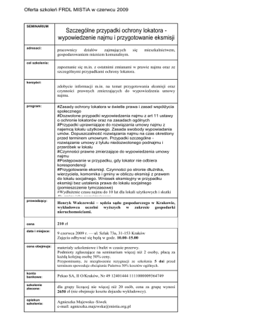 Oferta szkoleń FRDL MISTiA w czerwcu 2009 SEMINARIUM Szczególne przypadki ochrony lokatora wypowiedzenie najmu i przygotowanie eksmisji adresaci: pracownicy działów zajmujących się gospodarowaniem mieniem komunalnym. mieszkalnictwem, cel szkolenia: zapoznanie się m.in. z ostatnimi zmianami w prawie najmu oraz ze szczególnymi przypadkami ochrony lokatora. korzyści: zdobycie informacji m.in. na temat przygotowania eksmisji oraz czynności prawnych zmierzających do wypowiedzenia umowy najmu. program: #Zasady ochrony lokatora w świetle prawa i zasad współżycia społecznego #Dozwolone przypadki wypowiedzenia najmu z art 11 ustawy o ochronie lokatorów oraz na zasadach ogólnych #Przypadki uprawniające do rozwiązania umowy najmu z najemcą lokalu użytkowego. Zasada swobody wypowiadania umów. Dopuszczalność rozwiązania najmu na czas określony przed terminem umownym. Przypadki szczególne rozwiązanie umowy z tytułu niedozwolonego podnajmu i przeróbek w lokalu #Czynności prawne zmierzające do wypowiedzenia umowy najmu #Postępowanie w przypadku, gdy lokator nie odbiera korespondencji #Przygotowanie eksmisji. Czynności po stronie dłużnika, wierzyciela, komornika i gminy w obliczu eksmisji z prawem do lokalu socjalnego. Wniosek eksmisyjny w przypadku eksmisji bez ustalenia prawa do lokalu socjalnego (pomieszczenie tymczasowe) #Wydłużenie czasu najmu do 10 lat dla lokali użytkowych i skutki dla gminy jako wynajmującego prowadzący: Henryk Walczewski – sędzia sądu gospodarczego w Krakowie, wykładowca uczelni wyższych w zakresie gospodarki nieruchomościami. cena 210 zł data i miejsce: 9 czerwca 2009 r. — ul. Szlak 73a, 31-153 Kraków Zajęcia odbywać się będą w godz. 10.00–15.00 cena obejmuje: materiały szkoleniowe i bufet w czasie przerwy. Podmioty zgłaszające na seminarium więcej niż 2 osoby, płacą za każdą kolejną osobę 50% ceny. Przypominamy, że niezgłoszenie rezygnacji ze szkolenia 5 dni przed terminem spowoduje obciążenie Państwa 50% kosztów ogólnych. konto bankowe: Pekao SA, II O/Kraków, Nr 49 12401444 1111000009364749 szkolenie zlecone: dla grupy liczącej nie więcej niż 20 osób, cena za grupę wynosi 2650 zł (nie obejmuje kosztu dojazdu wykładowcy). opiekun szkolenia: Agnieszka Majewska–Siwek e-mail: [email protected] SEMINARIUM adresaci: Bezpieczeństwo użytkowania i stan nieruchomości pracownicy działów zajmujących się gospodarowaniem mieniem komunalnym. mieszkalnictwem, cel szkolenia: zdobycie wiedzy na temat bezpieczeństwa użytkowania i stanu nieruchomości. korzyści: poszerzenie wiedzy na temat odpowiedzialności zarządców, obowiązków właścicieli oraz innych osób. program: #Odpowiedzialność zarządcy za stan nieruchomości. Zarządca w roli właściciela nieruchomości - trwały zarząd dla jednostek organizacyjnych samorządów i Skarbu Państwa. Zarządca jako organ we wspólnocie mieszkaniowej. Zarządca „kontraktowy” #Bezpieczeństwo użytkowania nieruchomości. Podział zadań i odpowiedzialności pomiędzy zarządcę, właściciela, użytkowników. Bezpieczeństwo przeciwpożarowe. Wymagania sanitarno-epidemiologiczne. Ochrona mienia i praw na nieruchomości #Odpowiedzialność za nieruchomość wg prawa budowlanego. Prawidłowy stan techniczny nieruchomości. Zagrożenia zdrowia, życia i mienia użytkowników. Decyzje wydawane przez nadzór budowlany, skutki techniczne i prawne #Kontrole i skutki kontroli, dokumentacja. Wymagana dokumentacja z prawa budowlanego; książki przeglądów, decyzje nadzoru budowlanego. Kontrole przeprowadzane przez straż pożarną i inne służby. Skutki kontroli i zaleceń pokontrolnych. Umowa o zarządzanie a bezpieczeństwo użytkowania nieruchomości. Zakres umocowania zarządcy konieczny do efektywnego spełniania jego obowiązków. Obowiązek finansowania wydatków i nakładów koniecznych dla zapewnienia bezpiecznego użytkowania. Fundusz remontowy. Skutki nieszczęśliwych zdarzeń - reżimy odpowiedzialności. Przesłanki odpowiedzialności z przyczyn prawnych i finansowych. Akty staranności uwalniające od odpowiedzialności. Znaczenie ubezpieczenia jako ochrony zarządcy prowadzący: Henryk Walczewski – sędzia sądu gospodarczego w Krakowie, wykładowca uczelni wyższych w zakresie gospodarki nieruchomościami. cena 210 zł data i miejsce: 10 czerwca 2009 r. — ul. Szlak 73a, 31-153 Kraków Zajęcia odbywać się będą w godz. 10.00–15.00 cena obejmuje: materiały szkoleniowe i bufet w czasie przerwy. Podmioty zgłaszające na seminarium więcej niż 2 osoby, płacą za każdą kolejną osobę 50% ceny. Przypominamy, że niezgłoszenie rezygnacji ze szkolenia 5 dni przed terminem spowoduje obciążenie Państwa 50% kosztów ogólnych. konto bankowe: Pekao SA, II O/Kraków, Nr 49 12401444 1111000009364749 szkolenie zlecone: dla grupy liczącej nie więcej niż 20 osób, cena za grupę wynosi 2650 zł (nie obejmuje kosztu dojazdu wykładowcy). opiekun szkolenia: Agnieszka Majewska–Siwek e-mail: [email protected] SEMINARIUM Czas pracy oraz podróż służbowa adresaci: pracodawcy, pracownicy działów kadrowych jst i jednostek podległych. cel szkolenia: poszerzenie wiedzy m. in. na temat przepisów związanych z czasem pracy oraz podróżą służbową. korzyści: poznanie kazusów dotyczących zagadnień dotyczących podróży służbowych i czasu pracy program: #Zagadnienia dotyczące czasu pracy. Co się zalicza do czasu pracy (podróż służbowa, udział w szkoleniu, prezentacji itp.)? Normy, wymiar i rozkład czasu pracy. Znaczenie okresów rozliczeniowych, harmonogramów. Regulacje dotyczące przerw w pracy, wyjść prywatnych. Opłacanie godzin nadliczbowych i udzielanie czasu wolnego. Czas pracy niektórych grup pracowniczych (kadra kierownicza, zatrudnienie w zadaniowym czasie pracy, zatrudnieni w niepełnym wymiarze i równoważnych normach czasu pracy, niepełnosprawni) #Pojęcie podróży służbowej. Rozróżnienie podró