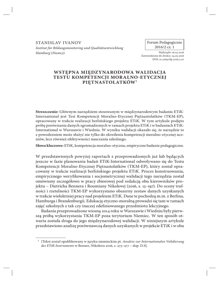 STANISLAV IVANOV Institut für Bildungsmonitoring und Qualitätsentwicklung Hamburg (Niemcy) Forum Pedagogiczne 2016/2 cz. 1 Wpłynęło: 16.05.2016 Zatwierdzono do druku: 24.05.2016 DOI: 10.21697/fp.2016.2.07 WSTĘPNA MIĘDZYNARODOWA WALIDACJA TESTU KOMPETENCJI MORALNO-ETYCZNEJ PIĘTNASTOLATKÓW1 Streszczenie: Głównym narzędziem stosowanym w międzynarodowym badaniu ETiKInternational jest Test Kompetencji Moralno-Etycznej Piętnastolatków (TKM-EP), opracowany w trakcie realizacji berlińskiego projektu ETiK. W tym artykule podjęto próbę porównania danych zgromadzonych w ramach projektu ETiK i w badaniach ETiKInternational w Warszawie i Wiedniu. W wyniku walidacji okazało się, że narzędzie to z powodzeniem może służyć nie tylko do określenia kompetencji moralno-etycznej uczniów, lecz również efektywności nauczania szkolnego. Słowa kluczowe: ETiK, kompetencja moralno-etyczna, empiryczne badanie pedagogiczne. W przedstawionych powyżej raportach z przeprowadzonych już lub będących jeszcze w fazie planowania badań ETiK-International odwoływano się do Testu Kompetencji Moralno-Etycznej Piętnastolatków (TKM-EP), który został opracowany w trakcie realizacji berlińskiego projektu ETiK. Proces konstruowania, empirycznego weryfikowania i socjometrycznej walidacji tego narzędzia został omówiony szczegółowo w pracy zbiorowej pod redakcją obu kierowników projektu – Dietricha Bennera i Roumiany Nikolovej (2016, s. 13–197). Do oceny trafności i rzetelności TKM-EP wykorzystano obszerny zestaw danych uzyskanych w trakcie wieloletniej pracy nad projektem ETiK. Dane te pochodzą m.in. z Berlina, Hamburga i Brandenburgii. Edukację etyczno-moralną prowadzi się tam w ramach zajęć szkolnych z tak czy inaczej zdefiniowanego przedmiotu lekcyjnego. Badania przeprowadzone wiosną 2014 roku w Warszawie i Wiedniu były pierwszą próbą wykorzystania TKM-EP poza terytorium Niemiec. W ten sposób otwarta została droga do jego międzynarodowej walidacji. W niniejszym artykule przedstawiono analizę porównawczą danych uzyskanych w projekcie ETiK i w obu 1 [Tekst został opublikowany w języku niemieckim pt. Ansätze zur Internationalen Validierung des ETiK-Instruments w Benner, Nikolova 2016, s. 273–277 – dop. D.S]. 118 STANISLAV IVANOV [2] pionierskich badaniach ETiK-International oraz próbę określenia na tej podstawie wartości psychometrycznej TKM-EP w perspektywie międzynarodowej. Płaszczyzna porównania Do przeprowadzenia niniejszego porównania z 6084 uczniów i uczennic, których odpowiedzi wykorzystano przy walidacji TKM-EP, wyselekcjonowano 2573 osoby. Pochodziły one z wymienionych powyżej miejsc realizacji projektu ETiK, a mianowicie z: Berlina – 1657 osób, Hamburga – 700 osób i Brandenburgii – 216 osób. Wszystkie one brały udział w zajęciach z etyki lub z ekwiwalentnego przedmiotu. W badaniu ETiK-International w Warszawie i Wiedniu z powodów, które kierownicy zespołów – Dariusz Stępkowski i Georg Ritzer – wyjaśnili w artykułach przedstawionych powyżej, przeważająca większość uczestników nie uczęszczała na lekcje etyki ani na żaden inny przedmiot szkolny zawierający podobne treści kształcenia. Ta niezaplanowana w gruncie rzeczy przeszkoda przyniosła jednak korzyść polegającą na tym, że przy okazji międzynarodowej walidacji TKM-EP sprawdzono jego przydatność do mierzenia efektywności wykorzystania czasu spędzanego przez uczniów w szkole. Zgodnie ze znaną teorią time-on-task (Walberg 1988), którą rozwija się współcześnie w badaniach nad efektywnością szkolną, należało oczekiwać, że uczniowie i uczennice, którzy uczęszczają na lekcje etyki, w badaniu za pomocą parametrycznego TKM-EP osiągną wyższe wyniki (tj. wartości punktowe) niż ich koledzy i koleżanki nieuczęszczający na zajęcia z tego przedmiotu. W tym kontekście rodzi się pytanie: Czy TKM-EP umożliwia dokonywanie rozróżnienia między obydwiema grupami uczniów? Ta kwestia zostanie rozważona poniżej wraz pytaniem o „kształt” kompetencji moralno-etycznej badanych. Charakterystyka porównywanej populacji Aby w tracie porównywania danych uzyskanych w Warszawie i Wiedniu uniknąć zniekształceń, sprawdzono najpierw, czy wspomniane powyżej dwie grupy uczniów – uczęszczający na zajęcia z etyki i nieuczęszczający na nie – wykazują podobieństwo pod względem zmiennych niezależnych. W badaniu ETiK przyjęto następujące parametry opisujące badaną populację: poziom zdolności kognitywnych, mierzony za pomocą niewerbalnego Kognitives Fähigkeitstest (KFT; Heller, Perleth 2000), deklarowaną liczbę książek znajdujących się w biblioteczce domowej i język najczęściej używany w komunikacji rodzinnej. Jak pokazano na wykresie 1, poziom zdolności kognitywnych uczestników badania niebiorących udziału w lekcjach etyki był nieco wyższy niż tych, którzy na uczęszczali na te zajęcia. Co prawda, siła efektu wyrażona wartością d-Cohena = 0,12 sygnalizuje małą siłę związku między uczęszczaniem i nieuczęszczaniem na lekcje etyki, jednak po sprawdzeniu tej wartości za pomocą statystyki t (t-Studenta) okazało się, że poziom ufności sięga aż 95 proc., co przekonuje o zajściu istotnej statystycznie zależności. [3] WSTĘPNA MIĘDZYNARODOWA WALIDACJA TESTU KOMPETENCJI… 119 Wykres 1. Zdolności kognitywne uczniów uczestniczących i nieuczestniczących w lekcjach etyki na podstawie średniej punktów KFT Źródło: opracowanie własne. Badając kontekst społeczno-kulturowy, poddano analizie dane dotyczące książek znajdujących się w gospodarstwie domowym. Również w tym przypadku okazało się, że uczniowie nieuczęszczający na etykę w szkole znajdują się w lepszej sytuacji. Jak widać na poniższym wykresie, w grupie tej odsetek młodych ludzi pochodzących z rodzin „ubogich” pod względem zasobów książkowych (<100 książek) wynosi 34 proc. i jest o pię