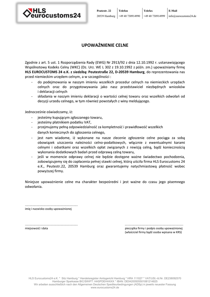Peutestr. 22 Telefon Telefax E-Mail 20539 Hamburg +49 40 730914990 +49 40 730914999 [email protected] UPOWAŻNIENIE CELNE Zgodnie z art. 5 ust. 1 Rozporządzenia Rady (EWG) Nr 2913/92 z dnia 12.10.1992 r. ustanawiającego Wspólnotowy Kodeks Celny (WKC) (Dz. Urz. WE L 302 z 19.10.1992 z późn. zm.) upoważniamy firmę HLS EUROCUSTOMS 24 e.K. z siedzibą: Peutestraße 22, D-20539 Hamburg, do reprezentowania nas przed niemieckim urzędem celnym, a w szczególności : - do podejmowania w naszym imieniu wszelkich procedur celnych na niemieckich urzędach celnych oraz do przygotowywania jako nasz przedstawiciel niezbędnych wniosków i deklaracji celnych - składania w naszym imieniu deklaracji o wartości celnej towaru oraz wszelkich odwołao od decyzji urzedu celnego, w tym również powstałych z winy meldującego. Jednocześnie oświadczamy, iż: - jesteśmy kupującym zgłaszanego towaru, - jesteśmy płatnikiem podatku VAT, - przejmujemy pełną odpowiedzialnośd za kompletnośd i prawidłowośd wszelkich danych koniecznych do zgłoszenia celnego, - jest nam wiadome, iż wykonane na nasze zlecenie zgłoszenie celne pociąga za sobą obowiązek uiszczenia należności celno-podatkowych, włącznie z ewentualnymi karami celnymi i odsetkami oraz wszelkich opłat związanych z rewizją celną, bądź koniecznością wykonania dodatkowych badao przed odprawą celną towaru, - jeśli w momencie odprawy celnej nie będzie dostępne ważne świadectwo pochodzenia, zobowiązujemy się do zapłacenia pełnej stawki celnej, którą uiściła firma HLS Eurocustoms 24 e.K., Peutestr.22, 20539 Hamburg oraz gwarantujemy natychmiastową płatnośd wobec powyższej firmy. Niniejsze upoważnienie celne ma charakter bezpośredni i jest ważne do czasu jego pisemnego odwołania. .................................................................. imię i nazwisko osoby upoważnionej .................................................................. miejsowośd i data ......................................................................... pieczątka firmy i podpis osoby upoważnionej (właściciel firmy bądź osoba wpisana w KRS) HLS Eurocustoms24 e.K. * Sitz Hamburg * Handelsregister Amtsgericht Hamburg * HRA 111027 * VAT/USt.-Id.Nr. DE238092570 Hamburger Sparkasse BIC/SWIFT: HASPDEHHXXX * IBAN: DE04200505501081214825 Wir arbeiten ausschließlich nach den Allgemeinen Deutschen Spediteurbedingungen (ADSp) in jeweils neuester Fassung www.eurocustoms24.de Peutestr. 22 Telefon Telefax E-Mail 20539 Hamburg +49 40 730914990 +49 40 730914999 [email protected] ZOLLVOLLMACHT Hiermit beauftragen wir die Firma: HLS EUROCUSTOMS24 e.K. Peutestr.22, D-20539 Hamburg, uns nach Artikel 5 des Gemeinschaftlichen Zollkodex (Verordnung EWG Nr. 2913/92 vom 12.10.1992) zu vertreten, insbesondere: - in unserem Namen Warenerklärungen für die Abfertigung zu allen Verfahrensarten bei allen Zollämtern abzugeben und alle damit in Zusammenhang stehenden Anträge, Erklärungen rechtsverbindlich auszufertigen, - Erklärung zur Ermittlung des Zollwertes zu unterzeichnen und Zollreklamationen jeglicher Art (u.a. Selbstanzeigen) durchzuführen. Gleichzeitig bestätigen wir, dass: - wir Käufer der angemeldeten Waren sind, - wir zum vollen Vorsteuerabzug berechtigt sind, - wir die volle Haftung für die Vollständigkeit und Richtigkeit sämtlicher Angaben und Dokumente, die für die Durchführung zollamtlicher Anmeldung erforderlich sind, übernehmen - uns bekannt ist, dass wir durch die Anmeldung Anmelder nach dem Zollgesetz werden und verpflichten uns zur Zahlung sämtlicher Eingangsabgaben inkl. etwaiger Zollstrafen und Säumniszuschläge - wir in voller Höhe den anfallenden Drittlandszoll, den die Firma HLS Eurocustoms24 e.K. für uns verauslagt, übernehmen und dessen unverzügliche Zahlung garantieren, sofern zum Zeitpunkt der Zollabfertigung kein gültiges Ursprungszeugnis (Präferenznachweis) vorgelegt wurde. Die erteilte Vollmacht versteht sich als direkte Vertretung und ist bis zum schriftlichen Widerruf gültig. ..................................................................... Name des Geschäftsführers ……………………………………………………… ...…………………………................................... Ort/Datum Firmenstempel/Unterschrift des Firmeninhabers bzw. einer anderen zeichnungsberechtigten Person gem. HR-Eintrag HLS Eurocustoms24 e.K. * Sitz Hamburg * Handelsregister Amtsgericht Hamburg * HRA 111027 * VAT/USt.-Id.Nr. DE238092570 Hamburger Sparkasse BIC/SWIFT: HASPDEHHXXX * IBAN: DE04200505501081214825 Wir arbeiten ausschließlich nach den Allgemeinen Deutschen Spediteurbedingungen (ADSp) in jeweils neuester Fassung www.eurocustoms24.de