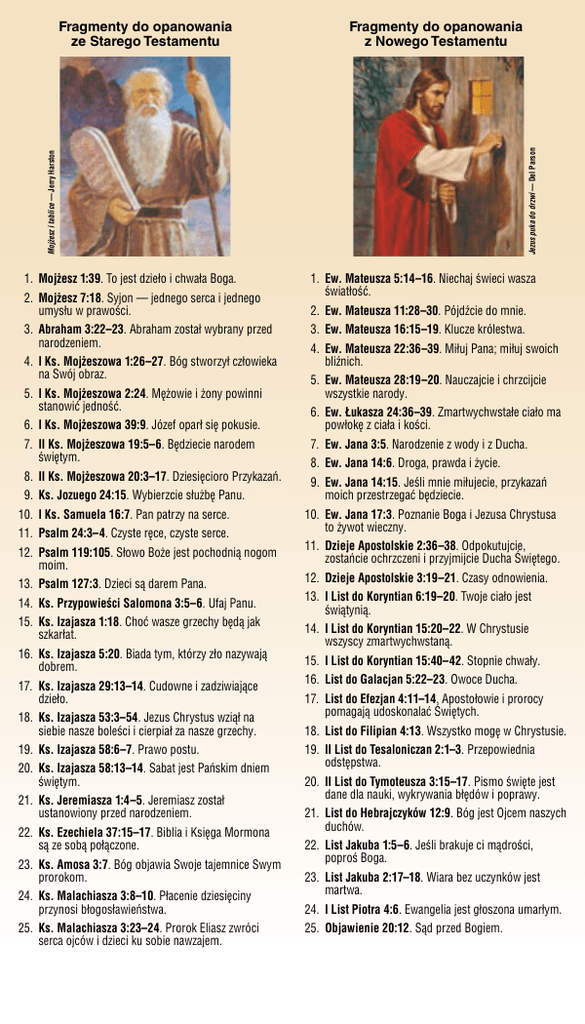 1. Mojżesz 1:39. To jest dzieło i chwała Boga. 2. Mojżesz 7:18. Syjon — jednego serca i jednego umysłu w prawości. 3. Abraham 3:22–23. Abraham został wybrany przed narodzeniem. 4. I Ks. Mojżeszowa 1:26–27. Bóg stworzył człowieka na Swój obraz. 5. I Ks. Mojżeszowa 2:24. Mężowie i żony powinni stanowić jedność. 6. I Ks. Mojżeszowa 39:9. Józef oparł się pokusie. 7. II Ks. Mojżeszowa 19:5–6. Będziecie narodem świętym. 8. II Ks. Mojżeszowa 20:3–17. Dziesięcioro Przykazań. 9. Ks. Jozuego 24:15. Wybierzcie służbę Panu. 10. I Ks. Samuela 16:7. Pan patrzy na serce. 11. Psalm 24:3–4. Czyste ręce, czyste serce. 12. Psalm 119:105. Słowo Boże jest pochodnią nogom moim. 13. Psalm 127:3. Dzieci są darem Pana. 14. Ks. Przypowieści Salomona 3:5–6. Ufaj Panu. 15. Ks. Izajasza 1:18. Choć wasze grzechy będą jak szkarłat. 16. Ks. Izajasza 5:20. Biada tym, którzy zło nazywają dobrem. 17. Ks. Izajasza 29:13–14. Cudowne i zadziwiające dzieło. 18. Ks. Izajasza 53:3–54. Jezus Chrystus wziął na siebie nasze boleści i cierpiał za nasze grzechy. 19. Ks. Izajasza 58:6–7. Prawo postu. 20. Ks. Izajasza 58:13–14. Sabat jest Pańskim dniem świętym. 21. Ks. Jeremiasza 1:4–5. Jeremiasz został ustanowiony przed narodzeniem. 22. Ks. Ezechiela 37:15–17. Biblia i Księga Mormona są ze sobą połączone. 23. Ks. Amosa 3:7. Bóg objawia Swoje tajemnice Swym prorokom. 24. Ks. Malachiasza 3:8–10. Płacenie dziesięciny przynosi błogosławieństwa. 25. Ks. Malachiasza 3:23–24. Prorok Eliasz zwróci serca ojców i dzieci ku sobie nawzajem. Fragmenty do opanowania z Nowego Testamentu Jezus puka do drzwi — Del Parson Mojżesz i tablice — Jerry Harston Fragmenty do opanowania ze Starego Testamentu 1. Ew. Mateusza 5:14–16. Niechaj świeci wasza światłość. 2. Ew. Mateusza 11:28–30. Pójdźcie do mnie. 3. Ew. Mateusza 16:15–19. Klucze królestwa. 4. Ew. Mateusza 22:36–39. Miłuj Pana; miłuj swoich bliźnich. 5. Ew. Mateusza 28:19–20. Nauczajcie i chrzcijcie wszystkie narody. 6. Ew. Łukasza 24:36–39. Zmartwychwstałe ciało ma powłokę z ciała i kości. 7. Ew. Jana 3:5. Narodzenie z wody i z Ducha. 8. Ew. Jana 14:6. Droga, prawda i życie. 9. Ew. Jana 14:15. Jeśli mnie miłujecie, przykazań moich przestrzegać będziecie. 10. Ew. Jana 17:3. Poznanie Boga i Jezusa Chrystusa to żywot wieczny. 11. Dzieje Apostolskie 2:36–38. Odpokutujcie, zostańcie ochrzczeni i przyjmijcie Ducha Świętego. 12. Dzieje Apostolskie 3:19–21. Czasy odnowienia. 13. I List do Koryntian 6:19–20. Twoje ciało jest świątynią. 14. I List do Koryntian 15:20–22. W Chrystusie wszyscy zmartwychwstaną. 15. I List do Koryntian 15:40–42. Stopnie chwały. 16. List do Galacjan 5:22–23. Owoce Ducha. 17. List do Efezjan 4:11–14. Apostołowie i prorocy pomagają udoskonalać Świętych. 18. List do Filipian 4:13. Wszystko mogę w Chrystusie. 19. II List do Tesaloniczan 2:1–3. Przepowiednia odstępstwa. 20. II List do Tymoteusza 3:15–17. Pismo święte jest dane dla nauki, wykrywania błędów i poprawy. 21. List do Hebrajczyków 12:9. Bóg jest Ojcem naszych duchów. 22. List Jakuba 1:5–6. Jeśli brakuje ci mądrości, poproś Boga. 23. List Jakuba 2:17–18. Wiara bez uczynków jest martwa. 24. I List Piotra 4:6. Ewangelia jest głoszona umarłym. 25. Objawienie 20:12. Sąd przed Bogiem. Fragmenty do opanowania z Księgi Mormona Mormon streszcza płyty — Tom Lovell Brat Józef — David Lindsley; Złote płyty; Świątynia Nauvoo Illinois — John Luke Fragmenty do opanowania z Nauk i Przymierzy 1. 1 Nefi 3:7. Pójdę i uczynię. 2. 2 Nefi 2:25. Upadek Adama nastąpił, aby ludzie mogli przyjść na świat. 3. 2 Nefi 2:27. Wolno nam dokonywać wyborów. 4. 2 Nefi 9:28–29. Zdobywanie wiedzy jest dobre, jeśli słuchamy rad Boga. 5. 2 Nefi 25:23, 26. Dzięki łasce zostaniemy zbawieni. 6. 2 Nefi 28:7–9. Nie możemy usprawiedliwiać żadnego rodzaju grzechu. 7. 2 Nefi 31:19–20. Wytrwaj do końca. 8. 2 Nefi 32:3. Napawaj się słowami Chrystusa. 9. 2 Nefi 32:8–9. Musisz się zawsze modlić. 10. Mosjasz 2:17. Służba bliźnim jest służbą Bogu. 11. Mosjasz 3:19. Naturalny człowiek jest wrogiem Boga. 12. Mosjasz 4:30. Pilnuj swych myśli, słów i uczynków. 13. Alma 7:11–13. Jezus Chrystus pokonał grzech i śmierć. 14. Alma 32:21. Wiara nie jest doskonałą wiedzą. 15. Alma 37:35. W młodości naucz się przestrzegać przykazań. 16. Alma 39:9. Nie dopuszczaj się więcej rozpusty. 17. Alma 41:10. Czynienie zła nigdy nie było szczęściem. 18. Helaman 5:12. Buduj swoją opokę na Chrystusie. 19. 3 Nefi 12:48. Bądź doskonały. 20. 3 Nefi 18:15, 20–21. Potrzebujesz czuwać i modlić się bezustannie. 21. Eter 12:6. Świadectwo przychodzi po próbie wiary. 22. Eter 12:27. To, co słabe, stanie się mocne. 23. Moroni 7:41. Pokładaj nadzieję w Zadośćuczynieniu Chrystusa. 24. Moroni 7:45, 47–48. Miłość jest cierpliwa. 25. Moroni 10:4–5. Duch Święty objawia prawdę. 1. Józef Smith — Historia 1:15–20. Pierwsza Wizja. 2. NiP 1:37–38. Wszystkie słowa Jezusa Chrystusa się wypełnią. 3. NiP 6:36. Radź się Chrystusa w każdej myśli. 4. NiP 8:2–3. Objawienie przychodzi do umysłu i serca. 5. NiP 10:5. Módl się zawsze. 6. NiP 13:1. Kapłaństwo Aarona zostało przywrócone. 7. NiP 18:10–11. Wielka jest wartość dusz. 8. NiP 18:15–16. Wielka jest radość z przyprowadzania dusz do Jezusa Chrystusa. 9. NiP 19:16–19. Jezus Chrystus cierpiał za nas wszystkich. 10. NiP 19:23. Naśladujcie przykład Zbawiciela i słuchajcie Jego słów. 11. NiP 25:13. Dotrzymuj swoich przymierzy. 12. NiP 46:33. Stale postępujcie w cnocie i świętości. 13. NiP 58:27. Bądźcie gorliwie zaangażowani w dobrą sprawę. 14. NiP 58:42–43. Aby odpokutować, musimy wyznać nasze grzechy i wyrzec się ich. 15. NiP 64:9–11. Powinniśmy wybaczać wszystkim ludziom. 16. NiP 76:22–24. Jezus Chrystus żyje. 17. NiP 76:40–41. 