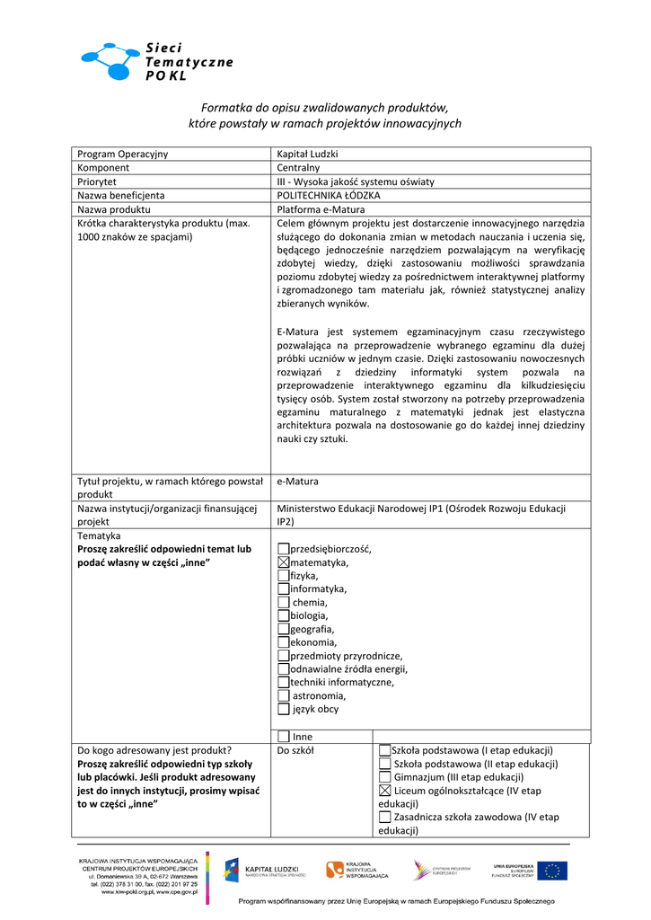 Formatka do opisu zwalidowanych produktów, które powstały w ramach projektów innowacyjnych Program Operacyjny Komponent Priorytet Nazwa beneficjenta Nazwa produktu Krótka charakterystyka produktu (max. 1000 znaków ze spacjami) Kapitał Ludzki Centralny III - Wysoka jakość systemu oświaty POLITECHNIKA ŁÓDZKA Platforma e-Matura Celem głównym projektu jest dostarczenie innowacyjnego narzędzia służącego do dokonania zmian w metodach nauczania i uczenia się, będącego jednocześnie narzędziem pozwalającym na weryfikację zdobytej wiedzy, dzięki zastosowaniu możliwości sprawdzania poziomu zdobytej wiedzy za pośrednictwem interaktywnej platformy i zgromadzonego tam materiału jak, również statystycznej analizy zbieranych wyników. E-Matura jest systemem egzaminacyjnym czasu rzeczywistego pozwalająca na przeprowadzenie wybranego egzaminu dla dużej próbki uczniów w jednym czasie. Dzięki zastosowaniu nowoczesnych rozwiązań z dziedziny informatyki system pozwala na przeprowadzenie interaktywnego egzaminu dla kilkudziesięciu tysięcy osób. System został stworzony na potrzeby przeprowadzenia egzaminu maturalnego z matematyki jednak jest elastyczna architektura pozwala na dostosowanie go do każdej innej dziedziny nauki czy sztuki. Tytuł projektu, w ramach którego powstał produkt Nazwa instytucji/organizacji finansującej projekt Tematyka Proszę zakreślić odpowiedni temat lub podać własny w części „inne” Do kogo adresowany jest produkt? Proszę zakreślić odpowiedni typ szkoły lub placówki. Jeśli produkt adresowany jest do innych instytucji, prosimy wpisać to w części „inne” e-Matura Ministerstwo Edukacji Narodowej IP1 (Ośrodek Rozwoju Edukacji IP2) przedsiębiorczość, matematyka, fizyka, informatyka, chemia, biologia, geografia, ekonomia, przedmioty przyrodnicze, odnawialne źródła energii, techniki informatyczne, astronomia, język obcy Inne Do szkół Szkoła podstawowa (I etap edukacji) Szkoła podstawowa (II etap edukacji) Gimnazjum (III etap edukacji) Liceum ogólnokształcące (IV etap edukacji) Zasadnicza szkoła zawodowa (IV etap edukacji) Technikum (IV etap edukacji) Szkoła policealna (IV etap edukacji) Do placówek Inne Jeśli wybrano szkołę: do jakiej grupy uczniów kierowany jest produkt? Jakiego typu zajęć docelowo dotyczy produkt? CKU CKP PDN ODiDZ Produkt finalny projektu z powodzeniem może być stosowany na wszystkich wymienionych etapach edukacji (może poza szkołą podstawową – etap I) jako narzędzie wspomagające sprawdzanie wiedzy, jak również, jako narzędzie wspomagające pracę samokształceniową ucznia. Może być także wykorzystywany przez placówki takie jak CKU Pierwszoplanowym przeznaczeniem/celem naszego produktu jest jego wdrożenie w systemie egzaminów państwowych – w szczególności - egzamin maturalny z matematyki na poziomie podstawowym tudzież egzaminy zawodowe Wszystkich Mających trudności w nauce Zainteresowanych tematyką Chcących rozwijać uzdolnienia Zainteresowanych wyborem kierunku kształcenia i zawodu/planujących przyszłą karierę zawodową (dotyczy: uczniów gimnazjum i szkół ponadgimnazjalnych) Formy szkolne Zajęcia obowiązkowe: Przedmioty ogólnokształcące Przedmioty zawodowe Dodatkowe zajęcia wprowadzone do szkolnego planu nauczania Przedmioty uzupełniające (dotyczy: gimnazjum i szkół ponadgimnazjalnych) Formy pozaszkolne Dodatkowe zajęcia rozwijające zainteresowania i uzdolnienia uczniów, w tym: Edukacyjne, dla których nie została ustalona podstawa programowa, a program został włączony do szkolnego zestawu programów nauczania Edukacyjne, które mogą być wprowadzone do szkolnego programu nauczania Kwalifikacyjne kursy zawodowe Kursy umiejętności zawodowych Kursy kompetencji ogólnych Inne Praca samodzielna Możliwość korzystania z bazy zadań z 10 działów matematyki w celu samodzielnej pracy prowadzącej do wyrównywania lub podniesienia poziomu wiedzy z matematyki Czy wykorzystanie produktu wymaga zastosowania nowoczesnych technologii informacyjno-komunikacyjnych? Jeśli tak, to jakich. Sprzęt: Komputera stacjonarnego/komputera przenośnego/ (1:1). Prosimy określić minimalne parametry techniczne wyszczególnionych narzędzi. 1. Architektura X86 lub X64: procesor powyżej 500 MHz, minimum 128 MB pamięci RAM 2. Mac OS 10.4.8+ (PowerPC) - PowerPC G4, procesor minimum 800 MHz, 128 MB pamięci RAM 3. Mac OS 10.4.8+ (chipset firmy Intel) - procesor Intel Core Duo 1.83 GHz lub lepszy, z minimum 128-MB pamięci RAM Rzutnika Tablicy interaktywnej Dostępu do sieci Internet lub Intranet o min. szybkości łącza przy pracy z całą grupą 1 Mbit/s Serwera zewnętrznego lub wewnętrznego w szkole, na którym będą utrzymywane treści Produktu Inne Jednostka serwerowa: Klaster serwerów bazodanowych Klaster serwerów aplikacyjnych Oprogramowanie: Serwisu WWW. Jeśli tak, prosimy o określenie licencji na kody źródłowe serwisu wraz z opisem technologii użytej do jego budowy. Technologia Silverlight 5.0/ASP.NET 4.5 – technologie użyte do stworzenia aplikacji dostępnej z poziomu przeglądarki www Baza danych Microsoft SQL Server 2008 R2 – System Zarządzania Bazą Danych w celu przechowywania danych Uczniów, jak również danych umożliwiających przeprowadzanie egzaminów (pytania, odpowiedzi, wyniki). Systemu operacyjnego niezbędnego do korzystania z Produktu dla komputera/tabletu/telefonu. Jeśli tak, prosimy o określenie ich licencji. Komputery klienckie: 1. System operacyjny Windows 2000 SP4 / Windows XP SP2 / Windows XP SP3 / Windows Vista /Windows 7 / Windows Server 2003 / Windows Server 2008: architektura X86 lub X64: procesor powyżej 500 MHz, minimum 128 MB pamięci RAM 2. System operacyjny musi być zaopatrzony w jedną z wymienionych przeglądarek Internetowych(sugerujemy pobranie i instalacje najnowszych wersji): • Windows Internet Explorer 9 • Windows Internet Explorer 8 • Firefox 3 • Firefox 4 • Google Chr
