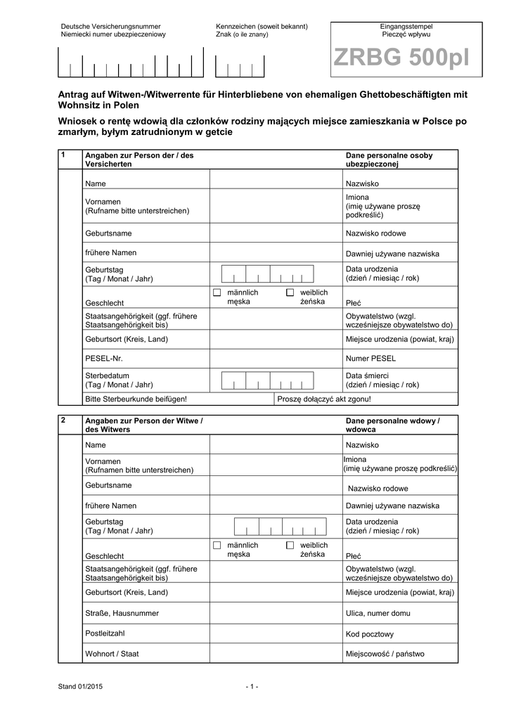 Deutsche Versicherungsnummer Niemiecki numer ubezpieczeniowy Kennzeichen (soweit bekannt) Znak (o ile znany) Eingangsstempel Pieczęć wpływu ZRBG 500pl Antrag auf Witwen-/Witwerrente für Hinterbliebene von ehemaligen Ghettobeschäftigten mit Wohnsitz in Polen Wniosek o rentę wdowią dla członków rodziny mających miejsce zamieszkania w Polsce po zmarłym, byłym zatrudnionym w getcie 1 Angaben zur Person der / des Versicherten Dane personalne osoby ubezpieczonej Name Nazwisko Vornamen (Rufname bitte unterstreichen) Imiona (imię używane proszę podkreślić) Geburtsname Nazwisko rodowe frühere Namen Dawniej używane nazwiska Geburtstag (Tag / Monat / Jahr) Data urodzenia (dzień / miesiąc / rok) Geschlecht männlich męska Płeć Staatsangehörigkeit (ggf. frühere Staatsangehörigkeit bis) Obywatelstwo (wzgl. wcześniejsze obywatelstwo do) Geburtsort (Kreis, Land) Miejsce urodzenia (powiat, kraj) PESEL-Nr. Numer PESEL Sterbedatum (Tag / Monat / Jahr) Data śmierci (dzień / miesiąc / rok) Proszę dołączyć akt zgonu! Bitte Sterbeurkunde beifügen! 2 weiblich żeńska Angaben zur Person der Witwe / des Witwers Dane personalne wdowy / wdowca Name Nazwisko Imiona (imię używane proszę podkreślić) Vornamen (Rufnamen bitte unterstreichen) Geburtsname Nazwisko rodowe frühere Namen Dawniej używane nazwiska Geburtstag (Tag / Monat / Jahr) Data urodzenia (dzień / miesiąc / rok) Geschlecht männlich męska weiblich żeńska Płeć Staatsangehörigkeit (ggf. frühere Staatsangehörigkeit bis) Obywatelstwo (wzgl. wcześniejsze obywatelstwo do) Geburtsort (Kreis, Land) Miejsce urodzenia (powiat, kraj) Straße, Hausnummer Ulica, numer domu Postleitzahl Kod pocztowy Wohnort / Staat Miejscowość / państwo Stand 01/2015 -1- telefonisch tagsüber zu erreichen (Angabe freiwillig) Dostępny/a pod telefonem (dane dobrowolne) Telefax, E-Mail (Angabe freiwillig) fax, e-mail (dane dobrowolne) Czy był/a Pan/i ubezpieczony/a w niemieckim ustawowym ubezpieczeniu emerytalnorentowym? Waren Sie in der deutschengesetzlichen Rentenversicherung versichert? ja / tak nein / nie Versicherungsträger Instytucja ubezpieczeniowa Wurde eine Versicherungsnummer vergeben? ja / tak Czy nadano numer ubezpieczeniowy? nein / nie Versicherungsnummer der / des Hinterbliebenen Numer ubezpieczeniowy członka rodziny data zawarcia związku małżeńskiego z osobą ubezpieczoną (dzień / miesiąc / rok) Czy małżeństwo to trwało do śmierci osoby ubezpieczonej? Tag der Eheschließung mit der / dem Versicherten (Tag / Monat / Jahr) Bestand diese Ehe bis zum Tod der / des Versicherten? ja / tak nein / nie Hat die Witwe / der Witwer nach dem Tod des / der Versicherten wieder geheiratet? ja / tak nein / nie Czy wdowiec / wdowa zawarł/a nowe małżeństwo po śmierci osoby ubezpieczonej? Ponowne małżeństwo zawarto dnia (dzień / miesiąc / rok) Wiederheirat am (Tag / Monat / Jahr) Haben Sie sich seit dem 31.12.1990 ununterbrochen in Polen aufgehalten? Czy przebywał/a Pan/Pani od dnia 31.12.1990 r. nieprzerwanie w Polsce? ja / tak nein / a) b) c) Ich habe mich zu folgenden Zeiten im Ausland aufgehalten: Zeitraum vom – bis Tag / Monat / Jahr – Tag / Monat / Jahr / in Zeitraum vom – bis Tag / Monat / Jahr – Tag / Monat / Jahr / in Zeitraum vom – bis Tag / Monat / Jahr – Tag / Monat / Jahr / in Stand 01/2015 / / / – – – / / / / Przebywałem/am za granicą w podanych poniżej okresach: w okresie od - do dzień / miesiąc / rok – dzień / miesiąc / rok / w w okresie od – do dzień / miesiąc / rok – dzień / miesiąc / rok / w w okresie od - do dzień / miesiąc / rok – dzień / miesiąc / rok w -2- 3 Antragstellung durch andere Personen Vollmacht oder Beschluss des Gerichts bitte beifügen. Złożenie wniosku przez inne osoby Proszę dołączyć pełnomocnictwo lub decyzję sądu. Der Antrag wird in Vertretung gestellt von Wniosek złożono w zastępstwie Name Nazwisko Vorname Imiona Dienststelle (ggf. Aktenzeichen) urząd (wzgl. znak sprawy) in der Eigenschaft als w charakterze Gesetzlicher Vertreter prawnego przedstawiciela Vormund opiekuna dla nieletnich Betreuer opiekuna dla dorosłych pełnomocnika Bevollmächtigter 4 4.1 4.2 Straße, Hausnummer Ulica, numer domu Postleitzahl Kod pocztowy Wohnort / Staat Miejscowość / państwo telefonisch tagsüber zu erreichen (Angabe freiwillig) Dostępny/a pod telefonem (dane dobrowolne) Telefax, E-Mail (Angabe freiwillig) fax, e-mail (dane dobrowolne) Verfolgteneigenschaft der / des Versicherten Bitte fügen Sie alle vorhandenen Unterlagen bei! War die / der Versicherte Angehörige(r) des Judentums? Cechy prześladowania osoby ubezpieczonej Proszę dołączyć wszystkie posiadane dokumenty! Czy osoba ubezpieczona była narodowości żydowskiej? ja / tak nein / nie War die / der Versicherte als Verfolgte(r) im Sinne des § 1 Bundesentschädigungsgesetzes (BEG) anerkannt durch z. B. Entschädigungsbehörde, Jewish Claims Conference, Bundesministerium für Finanzen? ja / tak Czy osoba ubezpieczona była uznaną osobą prześladowaną w myśl § 1 ustawy federalnej o odszkodowaniach (BEG) przez np. Urząd ds. Odszkodowań, Jewish Claims Conference, Federalne Ministerstwo Finansów Entschädigungsbehörde / Urząd ds Odszkodowań Aktenzeichen Znak sprawy nein / nie Stand 01/2015 -3- 5 5.1 a) b) c) 5.2 a) b) c) Angaben zur Ghetto-Arbeit Bitte fügen Sie alle vorhandenen Unterlagen bei In welchen Ghettos hielt sich die / der Versicherte zwangsweise auf? Dane dot. pracy w getcie Proszę dołączyć wszystkie posiadane dokumenty! W których gettach przymusowo przebywała osoba ubezpieczona? Ort, Bezirk, Gebiet, miejscowość, powiat, rejon, Land Zeitraum von – bis Monat / Jahr – Monat / Jahr kraj okres od - do miesiąc / rok – miesiąc / rok / – / Ort, Bezirk, Gebiet, miejscowość, powiat, rejon Land Zeitraum von – bis Monat / Jahr – Monat / Jahr kraj okres od - do miesiąc / rok – miesiąc / rok / – / Ort, Bezirk, Gebiet, miejscowość,