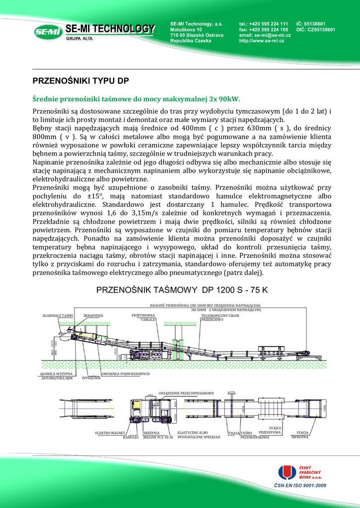 SE-MI Technology, a.s. Matuškova 10 710 00 Slezská Ostrava Republika Czeska tel.: +420 595 224 111 fax: +420 595 224 105 email: [email protected] http://www.se-mi.cz IČ: 65138601 DIČ: CZ65138601 PRZENOŚNIKI TYPU DP Średnie przenośniki taśmowe do mocy maksymalnej 3x 90kW. Przenośniki są dostosowane szczególnie do tras przy wydobyciu tymczasowym (do 1 do 2 lat) i to limituje ich prosty montaż i demontaż oraz małe wymiary stacji napędzających. Bębny stacji napędzających mają średnice od 400mm ( c ) przez 630mm ( s ), do średnicy 800mm ( v ). Są w całości metalowe albo mogą być pogumowane a na zamówienie klienta również wyposażone w powłoki ceramiczne zapewniające lepszy współczynnik tarcia między bębnem a powierzchnią taśmy, szczególnie w trudniejszych warunkach pracy. Napinanie przenośnika zależnie od jego długości odbywa się albo mechanicznie albo stosuje się stację napinającą z mechanicznym napinaniem albo wykorzystuje się napinanie obciążnikowe, elektrohydrauliczne albo powietrzne. Przenośniki mogą być uzupełnione o zasobniki taśmy. Przenośniki można użytkować przy pochyleniu do ±15°, mają natomiast standardowo hamulce elektromagnetyczne albo elektrohydrauliczne. Standardowo jest dostarczany 1 hamulec. Prędkość transportowa przenośników wynosi 1,6 do 3,15m/s zależnie od konkretnych wymagań i przeznaczenia. Przekładnie są chłodzone powietrzem i mają dwie prędkości, silniki są również chłodzone powietrzem. Przenośniki są wyposażone w czujniki do pomiaru temperatury bębnów stacji napędzających. Ponadto na zamówienie klienta można przenośniki doposażyć w czujniki temperatury bębna napinającego i wysypowego, układ do kontroli przesunięcia taśmy, przekroczenia naciągu taśmy, obrotów stacji napinającej i inne. Przenośniki można stosować tylko z przyciskami do rozruchu i zatrzymania, standardowo oferujemy też automatykę pracy przenośnika taśmowego elektrycznego albo pneumatycznego (patrz dalej). PRZENOŚNIK TAŚMOWY DP 1200 S - 75 K DŁUGOŚĆ PRZENOŚNIKA (DO 300M BEZ URZĄDZENIA NAPINAJĄCEGO, DO 500M Z URZĄDZENIEM NAPINAJĄCYM) ZGARNIACZ TAŚMY GŁOWICA WYSYPNA AUTOMATYKA MJM ZKRAPIENIE WYSIĘGNIK PRZETWORNA TABLICA TELESKOPICZNY CZŁON PRZEJŚCIOWY OBUDOWA PODWIESZOWYCH URZĄDZENIE PRZECIWPOZAROWE ELEKTRO MAGNET HAMULEC SKRZYNIA BIEGÓW PCE 30 SE ELASTYCZNE ALBO HYDRAULICZNE SPRZȨGŁO STAJCA PRZESYPOWA TRASA TAŚMA PRZENOŚNIKOWA STACJA ZWROTNA ČSN EN ISO 9001:2009 Typ Max. transportowana ilość przy prędkości 2,5 m/s, dla węgla Max. transportowana ilość przy prędkości 4 m/s, dla węgla Max. moc zainstalowana Średnica bębnów napędzających Średnica bębna napinającego i bębna wysypowego Typ przekładni DP 800 DP 1000 DP 1200 510 t/godz. 835 t/godz. 1200 t/godz. 820 t/godz. 1330 t/godz. 1920 t/godz. 2x 55kW 400mm i 630mm 3x 90kW 3x 90kW 630mm i 800mm 315, 500 i 630mm EOPS 75P, EOPS 75K 315mm 315 a 500mm RBV 30, PCE 55 SE PCE 55 SE, EOPS 75P, EOPS 75K Elastyczne podwójne Szczękowy Na zapytanie Typ sprzęgła Hamulec Blokada ruchu wstecz Naprężanie Zasobnik taśmy Rolki górne Rolki dolne Typ trasy Dopuszczalne nachylenie 400, 630 i 800mm 89 x 290 89 x 450 DPTL 800 TAK TAK 89 x 360 89 x 530 DPTL 1000 +18°/ -12° 108 x 465 108 x 700 DPTS 1200