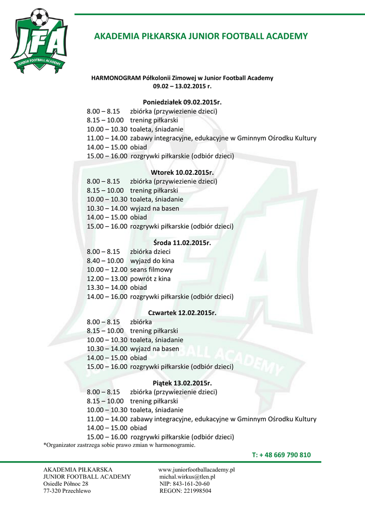 AKADEMIA PIŁKARSKA JUNIOR FOOTBALL ACADEMY HARMONOGRAM Półkolonii Zimowej w Junior Football Academy 09.02 – 13.02.2015 r. 8.00 – 8.15 8.15 – 10.00 10.00 – 10.30 11.00 – 14.00 14.00 – 15.00 15.00 – 16.00 Poniedziałek 09.02.2015r. zbiórka (przywiezienie dzieci) trening piłkarski toaleta, śniadanie zabawy integracyjne, edukacyjne w Gminnym Ośrodku Kultury obiad rozgrywki piłkarskie (odbiór dzieci) 8.00 – 8.15 8.15 – 10.00 10.00 – 10.30 10.30 – 14.00 14.00 – 15.00 15.00 – 16.00 Wtorek 10.02.2015r. zbiórka (przywiezienie dzieci) trening piłkarski toaleta, śniadanie wyjazd na basen obiad rozgrywki piłkarskie (odbiór dzieci) 8.00 – 8.15 8.40 – 10.00 10.00 – 12.00 12.00 – 13.00 13.30 – 14.00 14.00 – 16.00 Środa 11.02.2015r. zbiórka dzieci wyjazd do kina seans filmowy powrót z kina obiad rozgrywki piłkarskie (odbiór dzieci) 8.00 – 8.15 8.15 – 10.00 10.00 – 10.30 10.30 – 14.00 14.00 – 15.00 15.00 – 16.00 Czwartek 12.02.2015r. zbiórka trening piłkarski toaleta, śniadanie wyjazd na basen obiad rozgrywki piłkarskie (odbiór dzieci) 8.00 – 8.15 8.15 – 10.00 10.00 – 10.30 11.00 – 14.00 14.00 – 15.00 15.00 – 16.00 Piątek 13.02.2015r. zbiórka (przywiezienie dzieci) trening piłkarski toaleta, śniadanie zabawy integracyjne, edukacyjne w Gminnym Ośrodku Kultury obiad rozgrywki piłkarskie (odbiór dzieci) *Organizator zastrzega sobie prawo zmian w harmonogramie. T: + 48 669 790 810 AKADEMIA PIŁKARSKA JUNIOR FOOTBALL ACADEMY Osiedle Północ 28 77-320 Przechlewo www.juniorfootballacademy.pl [email protected] NIP: 843-161-20-60 REGON: 221998504 AKADEMIA PIŁKARSKA JUNIOR FOOTBALL ACADEMY NIEZBĘDNIK UCZESTNIKA Półkolonii Zimowej w Junior Football Academy 09.02 – 13.02.2015 r. 1. Ubiór sportowy na zajęcia piłkarskie: - obuwie na halę - koszulka - spodenki 2. Przybory na basen (proszę zabrać w WTOREK i CZWARTEK): - kąpielówki - klapki basenowe - ręcznik kąpielowy - przybory toaletowe (żel, szampon, itp.) 3. Wyżywienie Dzieci w ramach Półkolonii zapewnione mają dwa posiłki: - śniadanie – duża bułka + herbata - obiad – zupa + drugie danie + napój Jeśli dziecko wymaga dodatkowego posiłku proszę przygotować kanapki na czas trwania Półkolonii. Oprócz tego do dyspozycji dzieci będzie woda mineralna niegazowana. 4. Ubiór. Proszę przygotować ubiór dostosowany do panujących warunków atmosferycznych. T: + 48 669 790 810 AKADEMIA PIŁKARSKA JUNIOR FOOTBALL ACADEMY Osiedle Północ 28 77-320 Przechlewo www.juniorfootballacademy.pl [email protected] NIP: 843-161-20-60 REGON: 221998504