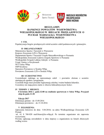 REGULAMIN RANKINGU POWIATÓW WOJEWÓDZTWA WIELKOPOLSKIEGO W BIEGACH PRZEŁAJOWYCH O PUCHAR MARSZAŁKA WOJEWÓDZTWA WIELKOPOLSKIEGO I CEL Popularyzacja biegów przełajowych wśród uczniów szkół podstawowych i gimnazjów. II ORGANIZATORZY Ministerstwo Sportu i Turystyki w Warszawie Krajowe Zrzeszenie LZS w Warszawie Departament Sportu i Turystyki Urzędu Marszałkowskiego w Poznaniu Wielkopolskie Zrzeszenie Ludowe Zespoły Sportowe w Poznaniu Wielkopolski Związek Lekkiej Atletyki w Poznaniu Urząd Gminy w Krzykosach WTT Solec Wlkp. OSP Krzykosy Starostwo Powiatowe w Środzie Wlkp. Powiatowe Zrzeszenie LZS w Środzie Wlkp. III UCZESTNICTWO Uczestnikami rankingu są reprezentacje szkół i powiatów złożone z uczniów startujących zgodnie z programem. Uczestnik biegu musi posiadać legitymację szkolną i ważne badania lekarskie. Uczestnicy nie mają prawa startu w obuwiu lekkoatletycznym /kolce/. IV TERMIN I MIEJSCE. 8 kwietnia 2016 r. godz.12:00 na stadionie sportowym w Solcu Wlkp. Przyjazd ekip do godz.11:30 Edycja 2017 Eliminacje gminne - do 15.09.2016 Eliminacje powiatowe - do 15.10.2016 V ZGŁOSZENIA Zgłoszenia ilościowe do dnia 5.04.2016r. na adres Wielkopolskiego Zrzeszenia LZS Poznań tel. 61 8 760-020 mail:[email protected]. Po terminie organizator nie zapewnia wyżywienia. Powiaty zgłaszają zawodników w dniu imprezy u organizatora na listach zbiorczych według wzoru: Powiat........................................ L.p. Imię i nazwisko Data urodzenia Szkoła Powiat Uczestnik posiada kartę startową wg wzoru o wymiarach 10cm na 15cm. Imię i nazwisko Rocznik Powiat Szkoła Dystans VI PROGRAM ZAWODÓW 8 kwietnia 2016r. Godz. 12,00 Solec Wlkp. Rocznik 2005 2004 2003 2002 2001 dziewczęta 800m, dziewczęta 800m, dziewczęta 800m, dziewczęta 1000m, dziewczęta 1000m, chłopcy 1000m chłopcy 1000m chłopcy 1000m chłopcy 1500m chłopcy 1500m VII PUNKTACJA 1 Indywidualna Lok. 1 Pkt. 9 2-3 4-7 8-13 14-21 22-33 34-50 51-80 7 6 5 4 3 2 1 2. Szkoły/Gimnazja Na punktację szkoły składa się suma 5 najlepszych wyników uzyskanych przez zawodników bez względu na kategorie wiekowe. W przypadku równej liczby punktów uzyskanych przez szkoły o kolejności decyduje wyższe miejsca zawodników. 3. Powiatów Na punktację powiatu składa się suma 30 najlepszych wyników uzyskanych przez zawodników bez względu na kategorie wiekowe. W przypadku równej liczby punktów uzyskanych przez powiaty o kolejności decydują wyższe miejsca zawodników; VIII NAGRODY 1. Indywidualne Za miejsca od I do III w każdym biegu medale Za miejsca od I do VI w każdym biegu dyplomy i nagrody rzeczowe lub statuetki 2. Szkoły/Gimnazja Za miejsca od I do VI puchary 3. Powiaty Za I –VI miejsce Puchar Marszałka Województwa Wielkopolskiego IX.ZASADY FINANSOWANIA Koszty dojazdów na zawody i organizacji zawodów szkolnych, gminnych i powiatowych pokrywają zainteresowane szkoły, gminy i powiaty. Koszty organizacyjne zawodów wojewódzkich i nagród pokrywają organizatorzy. X UWAGI KOŃCOWE Za aktualne badania lekarskie odpowiedzialni są kierownicy ekip. Wszelkie sprawy sporne i nie ujęte w niniejszym regulaminie rozstrzyga komisja odwoławcza. Uczestnicy imprezy, członkowie LZS, objęci są ubezpieczeniem zbiorowym zawartym przez Wielkopolskie Zrzeszenie Ludowe Zespoły Sportowe w Poznaniu