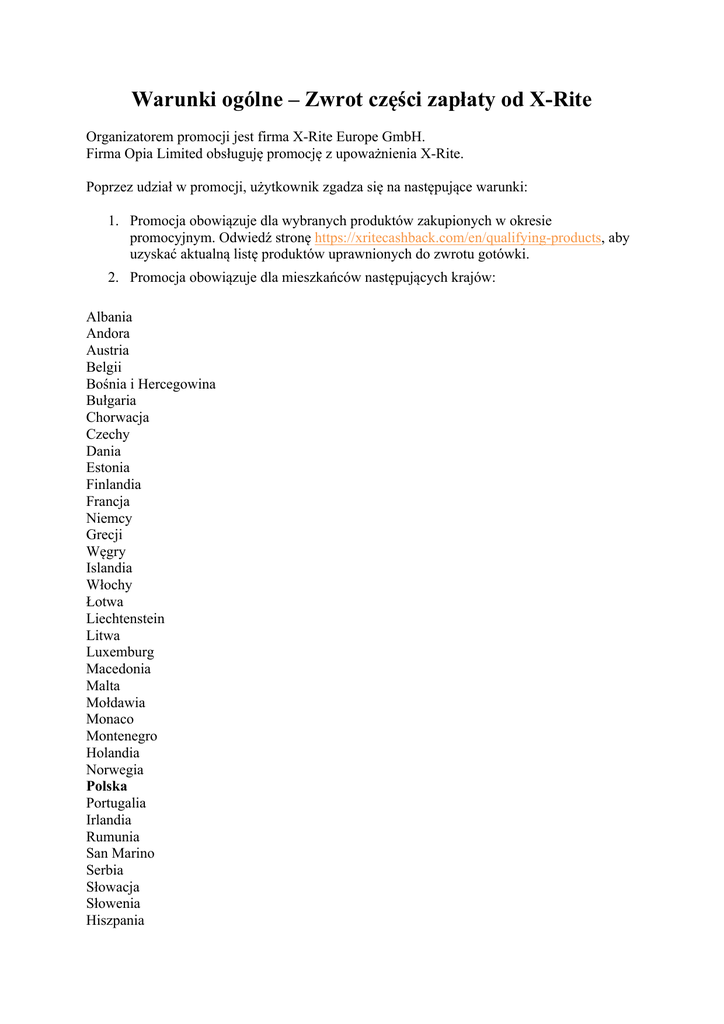 Warunki ogólne – Zwrot części zapłaty od X-Rite Organizatorem promocji jest firma X-Rite Europe GmbH. Firma Opia Limited obsługuję promocję z upoważnienia X-Rite. Poprzez udział w promocji, użytkownik zgadza się na następujące warunki: 1. Promocja obowiązuje dla wybranych produktów zakupionych w okresie promocyjnym. Odwiedź stronę https://xritecashback.com/en/qualifying-products, aby uzyskać aktualną listę produktów uprawnionych do zwrotu gotówki. 2. Promocja obowiązuje dla mieszkańców następujących krajów: Albania Andora Austria Belgii Bośnia i Hercegowina Bułgaria Chorwacja Czechy Dania Estonia Finlandia Francja Niemcy Grecji Węgry Islandia Włochy Łotwa Liechtenstein Litwa Luxemburg Macedonia Malta Mołdawia Monaco Montenegro Holandia Norwegia Polska Portugalia Irlandia Rumunia San Marino Serbia Słowacja Słowenia Hiszpania Szwecja Szwajcaria Wielka Brytania Watykan 3. Zgłoszenie udziału w promocji odbywa się przez stronę internetową (https://xritecashback.com) wyłącznie w języku angielskim, francuskim, hiszpańskim, włoskim lub niemieckim. Oferta nie obowiązuje dla pracowników, przedstawicieli, dystrybutorów i sprzedawców X-Rite, handlowców uczestniczących lub kogokolwiek związanego ze sprzedażą produktów X-Rite. 4. Aplikacje o zwrot części zapłaty mogą zostać złożone wyłącznie przez klientów końcowych. Sprzedawcy nie mogą składać wniosków w imieniu swoich klientów. Klienci mogą zwrócić się po zwrot gotówki wyłącznie do X-Rite, sprzedawcy produktów X-Rite nie są odpowiedzialni za zwrot gotówki, ani za przetwarzanie i weryfikacje wniosków o zwrot części zapłaty. 5. Promocja obowiązuje w odniesieniu do określonych produktów kwalifikujących, które zostały nabyte od autoryzowanego dystrybutora lub sprzedawcy X-Rite w okresie trwania promocji. Promocja jest ważna tylko dla klientów końcowych oraz pierwszych nabywców towarów; roszczenia zakupionych produktów, które zostaną odsprzedane lub wynajmowane osobom trzecim, nie kwalifikują się do tej promocji. 6. Klient może zgłosić maksymalnie 25 wniosków o zwrot części zapłaty w czasie trwania promocji. 7. Wszystkie instrukcje stanowią część warunków promocji. Zwrot części zapłaty będzie wypłacony jedynie po spełnieniu przez uczestnika wszystkich warunków. Wypełniając aplikację uczestnicy potwierdzają swoją zgodę na warunki promocji. Zwrot produktu X-Rite do sprzedawcy po zgłoszeniu udziału w promocji dyskwalifikuje użytkownika z otrzymania zwrotu części zapłaty. W przypadku produktu wadliwego lub podlegającego wymianie podczas przetwarzania zgłoszenia promocyjnego oryginalne zgłoszenie zostanie anulowane i konieczne będzie ponowne jego złożenie. Jeżeli którykolwiek produkt zostanie zwrócony do sprzedawcy po zwrocie zapłaty X-Rite zastrzega sobie prawo do odzyskania zwrotu zapłaty od uczestnika. Klienci z Unii Europejskiej nie posiadający konta bankowego w walutach EURO lub GBP otrzymają kwotę PLN odpowiadającą przeliczeniu wartości z EURO lub GBP. W przypadkach takich mogą pojawić się opłaty banku przyjmującego zwrot, a wartość kwoty zależna jest od kursu wymiany walut obowiązującego w banku i tabeli opłat i prowizji. 8. Zwrot części zapłaty nie może być udzielony na rzecz uczestnika, który: • • • • • nie nabył uprawnionych produktów X-Rite w okresie promocyjnym i / lub nie wypełnił wniosku i / lub nie dostarczył dowodu zakupu i / lub wymaganego potwierdzenia posiadania produktu, jaki określono w formularzu zgłoszenia udziału i / lub nie złożył roszczenia poprzez stronę internetową (https://xritecashback.com), lub / i na adres podany w formularzu zgłoszenia roszczenia w terminie 45 dni od daty zakupu i / lub nie wywiązał się z dowolnego z warunków przedstawionych na stronie https://xritecashback.com 9. X-Rite zastrzega sobie prawo do dyskwalifikacji zgłoszenia niekompletnego, zmienianego lub nieczytelnego. X-Rite nie ponosi odpowiedzialności za zgłoszenia, które zostały zagubione lub nie zostały dostarczone oraz dostarczone za późno, są uszkodzone, nieprawidłowe, opóźnione lub niewystarczające. Data lub potwierdzenie nadania nie będzie uznawane jako otrzymanie zgłoszenia lub data doręczenia. 10. X-Rite nie ponosi odpowiedzialności za jakiekolwiek awarie techniczne, sprzętu, oprogramowania, serwerów, stron internetowych lub inne awarie lub szkody jakiegokolwiek rodzaju do tego stopnia, że uniemożliwiają uczestnikowi lub w inny sposób utrudniają udział w promocji. Dowód przesłania zgłoszenia nie zostanie zaakceptowany jako potwierdzenie udziału. 11. X-Rite zastrzega sobie prawo do kontroli wszystkich wniosków w celu weryfikacji, że warunki promocji zostały spełnione i może zażądać przedstawienia dodatkowych informacji oraz dokumentów towarzyszących. 12. Wszystkie dokumenty złożone w związku z promocją stają się własnością X-Rite i nie będą zwracane. Składanie fałszywych, nieprawidłowych dokumentów, mylących lub oszustwo może skutkować dyskwalifikacją z tej i przyszłych promocji X-Rite i może być traktowane jako próba wyłudzenia. 13. Decyzja X-Rite w odniesieniu do każdego i wszystkich aspektów promocji będzie ostateczna i wiążąca. 14. X-Rite zastrzega sobie prawo do zmiany lub odwołania warunków tej oferty bez uprzedzenia. 15. Uczestnicy dostarczający niekompletny formularz wniosku zostaną powiadomieni za pośrednictwem poczty elektronicznej i będą mieli możliwość dostarczenia wymaganych elementów w ciągu siedmiu dni. Jeśli uczestnik nadal nie spełni warunków, wniosek o zwrot części zapłaty zostanie odrzucony. 16. Adres korespondencyjny dotyczący promocji – X-Rite Cashback, PO Box 487, GATESHEAD, United Kingdom, NE8 9BQ. Adres służy do wysyłania wniosków i korespondencji związanej z promocją. Procedura zgłoszenia udziału w promocji 17. Aby skorzystać z promocji