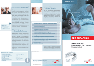 Dobrze spać Czy Ty lub Twój Moje zdrowie jest zagrożone? Do grupy ryzyka zaliczają się szczególnie mężczyźni pomiędzy 40 a 60 rokiem życia oraz kobiety po menopauzie. O zagrożeniu zdrowia przez chrapanie możemy mówić, wtedy kiedy dochodzi do bezdechu. Drogi oddechowe są wtedy zablokowane i w związku z tym, tlen czasowo nie jest doprowadzany do płuc oraz do mózgu. Taka sytuacja trwa aż do momentu kiedy mózg zareaguje automatycznie poprzez reakcję obudzenia: szczęki się zamykają, język wysuwa do przodu i gardło ponownie jest drożne. Taki cykl powtarza się w nocy ponad 50 razy na godzinę. Na bezdech według szacunku cierpi ok 2 milionów Niemców. A ilu Polaków...? Partner chrapie? Jeśli tak, porozmawiaj niezwłocznie ze swoim lekarzem dentystą lub ortodontą. On chętnie Ci doradzi. Już przed wizytą przygotuj sobie odpowiedzi na poniższe pytania. Ułatwi to leczenie i identyfikację zaburzeń – czy cierpisz na „łagodne” czy „niebezpieczne” chrapanie. ... chrapanie może wywoływać choroby ... chrapanie męczy tak nie 1. Czy chrapiesz każdej nocy – również wtedy, gdy nie spożywałeś alkoholu? 2. Czy to przeszkadza Twojej/Twojemu partnerowi/partnerce? 3. Czy cierpisz na bezdech senny? 4. Czy rano czujesz się osłabiony i zmęczony? Od zmęczenia do uszkodzeń serca 5. Czy budzisz się codziennie z bólem głowy? 6. Czy Twoja wydajność jest ograniczona? 7. Czy bywasz bez przyczyny zmęczony w ciągu dnia? Bezdech senny prowadzi do masowych zaburzeń snu i przez to często jest przyczyną ciągłego zmęczenia podczas dnia, problemów związanych z układem krążenia, podwyższonego ryzyka zawałowego i udarowego oraz wielu innych schorzeń. Zasadniczo można stwierdzić, iż u osób cierpiących na bezdech senny, które poddały się odpowiedniemu leczeniu, nie stwierdzono skróconej przeciętnej długości życia. problemy z otoczeniem chroniczne zaburzenia snu poranny ból głowy depresje zmęczenie dzienne i zaburzenia w koncentracji • impotencje 10. Czy szybko męczysz się podczas prowadzenia samochodu? 11. Czy masz problem z długą koncentracją? 12. Czy masz nadciśnienie tętnicze i czy bierzesz odpowiednie lekarstwa? • • • • • BEZ CHRAPANIA 13. Czy bierzesz regularnie środki nasenne? 14. Czy masz nadwagę? 15. Czy cierpisz na impotencje? Jeżeli nie jesteś w stanie sam odpowiedzieć na wszystkie pytania, porozmawiaj ze swoim Partnerem/Partnerką życiowym. On/Ona wie coś na ten temat. Gabinet lekarski: Bezdech senny może wywoływać: • • • • • 8. Czy łatwo usypiasz przy oglądaniu telewizji, podczas czytania itp. 9. Czy zasypiasz w kinie i teatrze? nadciśnienie tętnicze palpitacje serca udar zawał serca krótszą przeciętną długość życia Chcemy, abyś dobrze spał! SCHEU-DENTAL GmbH · www.tap-schiene.de PL 91.01/5.000/03/09 G REF 0165.10 Tak nie musi być! Nasze aparaty TAP® pomogą Ci natychmiast! Co to jest chrapanie? TAP®– proste i szybkie rozwiązanie. Chrapanie dla większości z nas jest po prostu oznaką głębokiego snu. Dla wielu innych jest groźnym zakłóceniem ogólnej ciszy w nocy lub nawet zaburzeniem snu, które zagraża zdrowiu. Ludzie, którzy chrapią, są wprawdzie często samotni, ale nie sami. 50 30 20 10 skłonność do chrapaania 40 60 % mężczyzn oraz 40 % kobiet powyżej 60 roku życia oraz 10 % mężczyzn i 5 % kobiet w wieku do 30 lat chrapie. Wiele z tych osób nawet o tym nie wie. wiek 10 20 30 40 50 60 70 80 Skłonność do chrapania Badania naukowe wykazały 96%-ową skuteczność aparatów TAP®.* (* CHEST 116:1511-1518, Dez.99, J.Pancer et al. “Evaluation of Variable Mandibular...”) Kobiety Mężczyźni Jak powstaje chrapanie? Obojętnie czy chrapanie zagraża Twoim kontaktom, Twojemu zdrowiu albo całemu życiu, najprostszym sposobem przeciwdziałania są aparaty TAP®. Te łagodne aparaty zostały wykonane z akrylu i używane są tylko podczas snu. Zadaniem ich jest utrzymanie żuchwy w przodzie i udrożnienie tym samym dróg oddechowych. Twój lekarz dentysta wykona indywidualny aparat bez żadnych ingerencji operacyjnych i uwolni Cię natychmiast od problemów związanych z chrapaniem. Szyna górna (szczęka) ze śrubą regulacyjną Klucz do indywidualnej regulacji aparatu. Aparaty TAP®: ... są wykonywane indywidualnie dla Ciebie, Podczas snu, poprzez odprężenie podniebienia i języka, zawężają się w sposób naturalny drogi oddechowe. Dlatego podczas oddychania pojawia się wibracja miękkich tkanek w gardle, która wywołuje znane odgłosy chrapania. elementy funkcjonalne, wykonane z biokompatybilnych materiałów nie zawierających niklu. ... możesz regulować je samodzielnie, Szyna dolna (żuchwa) z zaczepem ... są proste w obsłudze i przyjemne w użytkowaniu, ... natychmiast po założeniu troszczą się o Twoje zdrowie i spokojny sen. TAP®– Twój pomocnik, nie tylko przy problemach zdrowotnych. Aparaty TAP® pomogą Ci pozbyć się Wskazówki do redukcji chrapania. Podstawowe środki zapobiegawcze, których należy przestrzegać: Pozycja żuchwy w stanie spoczynku powoduje cofanie się języka (kolor czerwony) do gardła. Drogi oddechowe zostają wtedy zawężone lub całkowicie zablokowane. Aparat TAP® utrzymuje żuchwę wysuniętą do przodu i tym samym drogi oddechowe pozostają otwarte. • żadnego alkoholu i obfitych posilków przed snem • w przypadku nadwagi: należy schudnąć • unikać spania na plecach • spać z podwyższonym tulowiem • nie brać lekarstw, które oddzialywują na oddychanie • przewietrzyć pomieszczenie przed snem uporczywego chrapania oraz związanych z nim problemów zdrowotnych i kłopotów w relacjach z innymi osobami. Nieważne czy chrapiesz Ty czy Twoja Partnerka/ Twój Partner - po prostu zapytaj swojego lekarza dentystę. Na pewno chętnie Ci doradzi. Wiele relacji cierpi z powodu chrapania. Szyny TAP blokują chrapanie.