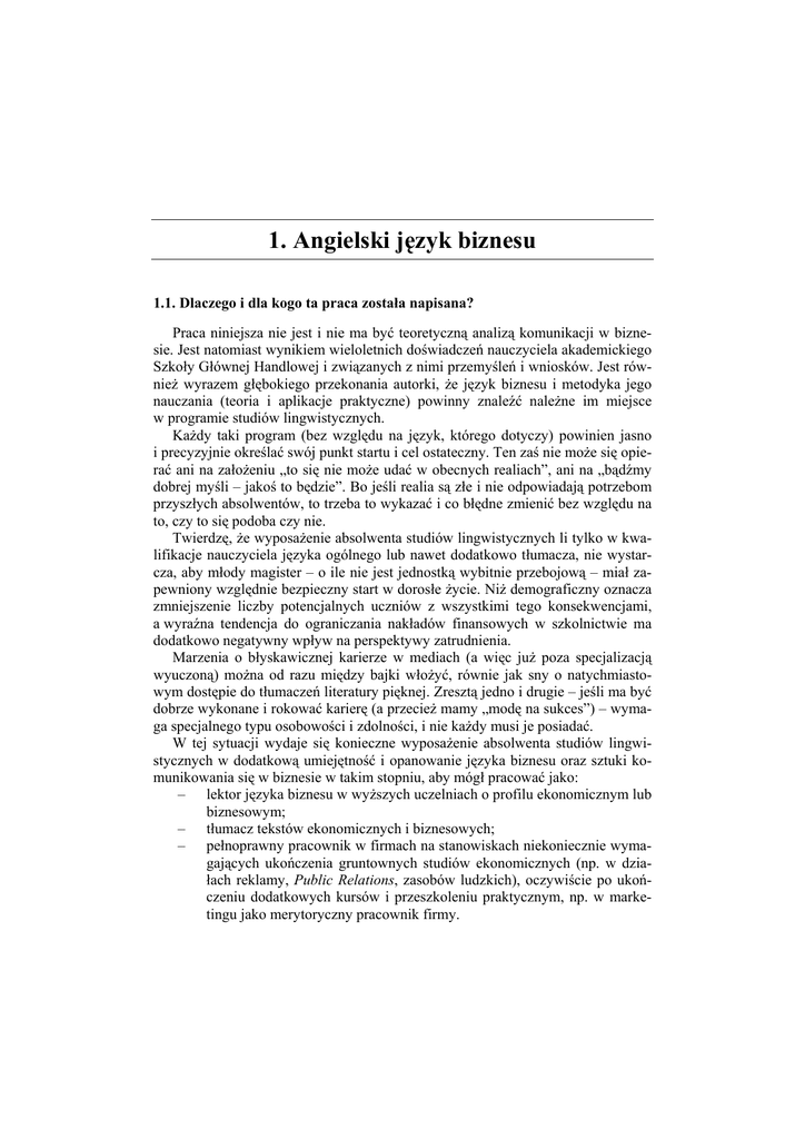 1. Angielski język biznesu 1.1. Dlaczego i dla kogo ta praca została napisana? Praca niniejsza nie jest i nie ma być teoretyczną analizą komunikacji w biznesie. Jest natomiast wynikiem wieloletnich doświadczeń nauczyciela akademickiego Szkoły Głównej Handlowej i związanych z nimi przemyśleń i wniosków. Jest również wyrazem głębokiego przekonania autorki, że język biznesu i metodyka jego nauczania (teoria i aplikacje praktyczne) powinny znaleźć należne im miejsce w programie studiów lingwistycznych. Każdy taki program (bez względu na język, którego dotyczy) powinien jasno i precyzyjnie określać swój punkt startu i cel ostateczny. Ten zaś nie może się opierać ani na założeniu „to się nie może udać w obecnych realiach”, ani na „bądźmy dobrej myśli – jakoś to będzie”. Bo jeśli realia są złe i nie odpowiadają potrzebom przyszłych absolwentów, to trzeba to wykazać i co błędne zmienić bez względu na to, czy to się podoba czy nie. Twierdzę, że wyposażenie absolwenta studiów lingwistycznych li tylko w kwalifikacje nauczyciela języka ogólnego lub nawet dodatkowo tłumacza, nie wystarcza, aby młody magister – o ile nie jest jednostką wybitnie przebojową – miał zapewniony względnie bezpieczny start w dorosłe życie. Niż demograficzny oznacza zmniejszenie liczby potencjalnych uczniów z wszystkimi tego konsekwencjami, a wyraźna tendencja do ograniczania nakładów finansowych w szkolnictwie ma dodatkowo negatywny wpływ na perspektywy zatrudnienia. Marzenia o błyskawicznej karierze w mediach (a więc już poza specjalizacją wyuczoną) można od razu między bajki włożyć, równie jak sny o natychmiastowym dostępie do tłumaczeń literatury pięknej. Zresztą jedno i drugie – jeśli ma być dobrze wykonane i rokować karierę (a przecież mamy „modę na sukces”) – wymaga specjalnego typu osobowości i zdolności, i nie każdy musi je posiadać. W tej sytuacji wydaje się konieczne wyposażenie absolwenta studiów lingwistycznych w dodatkową umiejętność i opanowanie języka biznesu oraz sztuki komunikowania się w biznesie w takim stopniu, aby mógł pracować jako: – lektor języka biznesu w wyższych uczelniach o profilu ekonomicznym lub biznesowym; – tłumacz tekstów ekonomicznych i biznesowych; – pełnoprawny pracownik w firmach na stanowiskach niekoniecznie wymagających ukończenia gruntownych studiów ekonomicznych (np. w działach reklamy, Public Relations, zasobów ludzkich), oczywiście po ukończeniu dodatkowych kursów i przeszkoleniu praktycznym, np. w marketingu jako merytoryczny pracownik firmy. „Head hunterzy” na studenckich giełdach pracy, z którymi nieraz rozmawiałam w Szkole Głównej Handlowej w Warszawie, i menedżerowie dużych korporacji międzynarodowych też potwierdzali przytoczone powyżej argumenty, podkreślając, że nieraz lepiej jest zatrudnić lingwistę z bardzo dobrą znajomością języków – ogólnego i biznesowego – i przyuczyć go do pracy w określonym dziale firmy, niż przyjąć absolwenta studiów ekonomicznych bez znajomości języka obcego ogólnego i specjalistycznego (biznesowego). Jeżeli chodzi o potrzebę profesjonalnego przygotowania przyszłych lektorów języka biznesu to jest ona niezaprzeczalna. Mogę to z całą odpowiedzialnością stwierdzić, gdyż przez wiele lat zatrudniałam młodych lektorów w SGH i w prywatnych Wyższych Szkołach Biznesu, i wiem jak bardzo zagubiony czuje się taki młody człowiek, gdy program i hospitanci wymagają realizacji treści biznesowych, i jak wiele musi się nauczyć bez względu na to, jakie inne obowiązki postawiła przed nim dorosłość. A krytykują go na początku wszyscy – oprócz bezpośrednich zwierzchników po (a raczej przede wszystkim) ich studentów, którzy nieraz zadają podchwytliwe pytania, dotyczące nietypowych treści nauczanych terminów. I wtedy następuje rozpaczliwa „wielka improwizacja”, przyjmowana nieraz gromkim śmiechem, albo pada stwierdzenie „jestem filologiem, nie muszę się na tym znać”, które z reguły jest bardzo nieżyczliwie przyjmowane, i trudno się temu dziwić. W tym miejscu trzeba wyraźnie podkreślić, że nie wymagam, żeby lektorzy języka specjalistycznego uczyli teorii ekonomii i biznesu. Ale znajomość elementarnej wiedzy profesjonalnej jest w tym zawodzie niezbędna. I to powinny im zapewnić wykłady i ćwiczenia (w języku obcym) już na studiach. Należy również dodać, że postulowana w niniejszej pracy potrzeba wprowadzenia języka biznesu do programu studiów lingwistycznych nie jest tylko moim pomysłem na uszczęśliwienie studentów. Wcześniej zapytaliśmy studentów I roku anglistyki Wyższej Szkoły Umiejętności w Kielcach, jak zapatrują się na proponowaną ofertę nauczania języka biznesu w takim zakresie, aby na zakończenie nauki mogli przystąpić do egzaminu London Chamber of Commerce and Industry I lub II stopnia. Założenie jest śmiałe, ale realne, zważywszy ich stopień znajomości angielskiego języka ogólnego, a ponieważ liczba chętnych wyniosła 95,8% ogółu, ofertę tę realizujemy z ich pełnym i świadomym przyzwoleniem. Popatrzmy teraz na ten postulat nie z pozycji dobra przyszłego absolwenta, lecz jego użyteczności dla wizerunku firm polskich. Jakkolwiek patetycznie to brzmi, to dobry pracownik językowy (np. w agencji PR), kompetentny tłumacz tekstów pisanych i ustnych (na konferencjach i podczas negocjacji), profesjonalnie wyszkolony lektor języka biznesu (który przygotowuje w tym zakresie przyszłych pracowników firm i instytucji) – wszyscy oni mają bezpośredni lub pośredni wpływ na image naszego biznesu. W tym rozdziale będę się zajmować sprawami pozornie oczywistymi. Bo choć są oczywiste nie wszyscy je za takie uważają, i choć w teorii nikt (albo raczej niewiele osób) nie zaprzecza istnieniu języków specjalistycznych, to w praktyce bar8 dzo silne związki