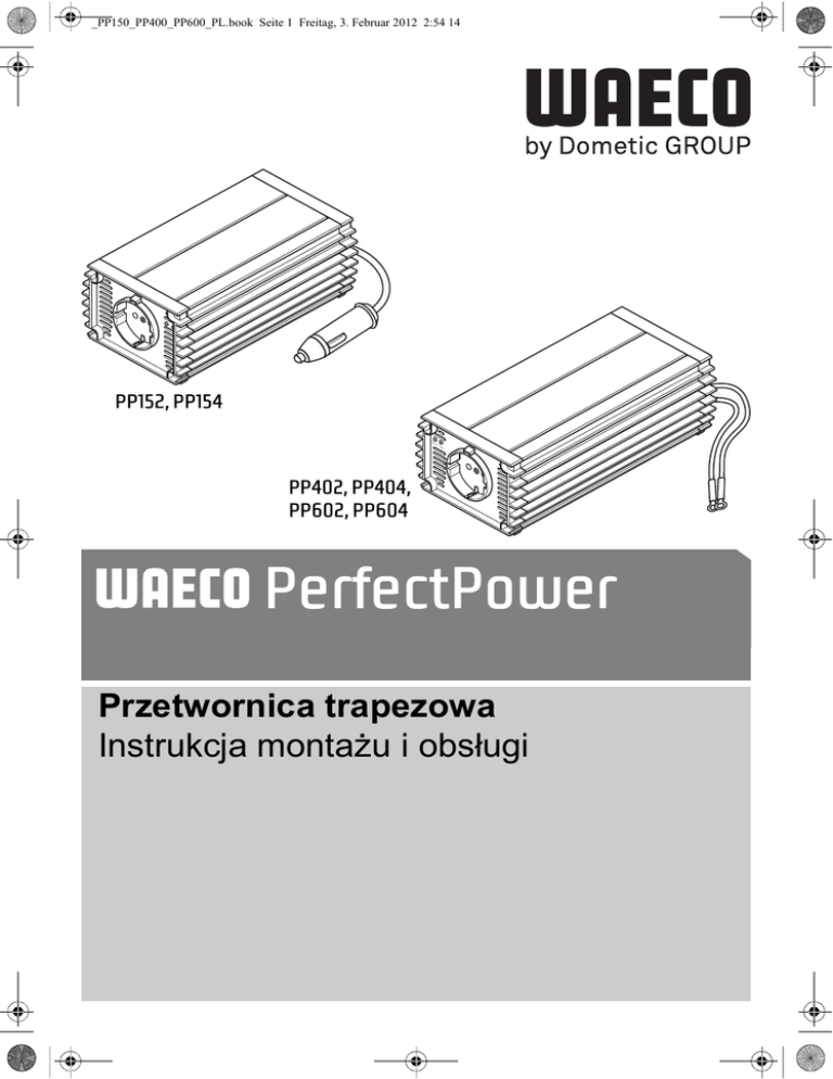 _PP150_PP400_PP600_PL.book Seite 1 Freitag, 3. Februar 2012 2:54 14 PP152, PP154 PO WE R FA UL T PP402, PP404, PP602, PP604 PerfectPower Przetwornica trapezowa Instrukcja montażu i obsługi _PP150_PP400_PP600_PL.book Seite 2 Freitag, 3. Februar 2012 2:54 14 PerfectPower 1 PP152, PP154 4 1 2 5 3 PP402, PP404, PP602, PP604 PO WE 3 R FA ULT 5 2 1 2 4 _PP150_PP400_PP600_PL.book Seite 3 Freitag, 3. Februar 2012 2:54 14 PerfectPower 2 2 1 ON OFF REMO. PP152, PP154 DC INPUT GROUND REMOTE AB 4 FUSE 3 2 1 ON OFF REMO. PP402, PP404 DC INPUT REMOTE AB 4 GROUND FUSE 3 2 1 ON OFF REMO. PP602, PP604 DC INPUT REMOTE 4 AB GROUND FUSE 3 3 _PP150_PP400_PP600_PL.book Seite 4 Freitag, 3. Februar 2012 2:54 14 PerfectPower 3 4 RE VE E RS PO RIT LA Y 25 cm A IS CH ASS P B 25 cm 5 2. 1. 4 _PP150_PP400_PP600_PL.book Seite 5 Freitag, 3. Februar 2012 2:54 14 PerfectPower Przed instalacją i uruchomieniem urządzenia należy uważnie przeczytać niniejszą instrukcję. Instrukcję należy zachować. W razie odsprzedaży urządzenia należy ją przekazać kolejnemu nabywcy. Spis treści 1 Uwagi dotyczące korzystania z instrukcji. . . . . . . . . . . . . . . . . . . . . . 6 2 Ogólne zasady bezpieczeństwa . . . . . . . . . . . . . . . . . . . . . . . . . . . . 6 3 Wersje urządzenia . . . . . . . . . . . . . . . . . . . . . . . . . . . . . . . . . . . . . . . 9 4 Użytkowanie zgodne z przeznaczeniem . . . . . . . . . . . . . . . . . . . . . . 9 5 Opis techniczny . . . . . . . . . . . . . . . . . . . . . . . . . . . . . . . . . . . . . . . . 10 6 Podłączenie przetwornicy . . . . . . . . . . . . . . . . . . . . . . . . . . . . . . . . 11 7 Użycie przetwornicy . . . . . . . . . . . . . . . . . . . . . . . . . . . . . . . . . . . . . 13 8 Wymiana bezpiecznika . . . . . . . . . . . . . . . . . . . . . . . . . . . . . . . . . . 14 9 Pielęgnacja i czyszczenie przetwornicy . . . . . . . . . . . . . . . . . . . . . . 14 10 Usuwanie usterek . . . . . . . . . . . . . . . . . . . . . . . . . . . . . . . . . . . . . . 15 11 Gwarancja . . . . . . . . . . . . . . . . . . . . . . . . . . . . . . . . . . . . . . . . . . . . 16 12 Utylizacja . . . . . . . . . . . . . . . . . . . . . . . . . . . . . . . . . . . . . . . . . . . . . 16 13 Dane techniczne . . . . . . . . . . . . . . . . . . . . . . . . . . . . . . . . . . . . . . . 17 5 _PP150_PP400_PP600_PL.book Seite 6 Freitag, 3. Februar 2012 2:54 14 Uwagi dotyczące korzystania z instrukcji PerfectPower 1 Uwagi dotyczące korzystania z instrukcji a e Uwaga! Wskazówka dot. bezpieczeństwa: Nieprzestrzeganie może spowodować szkody materialne i zakłócenia w pracy urządzenia. I Uwaga! Wskazówka bezpieczeństwa, która informuje o zagrożeniach związanych z prądem lub napięciem elektrycznym: Nieprzestrzeganie może spowodować zagrożenie dla ludzi, szkody materialne i zakłócenia w pracy urządzenia. Wskazówka Informacje uzupełniające dot. obsługi urządzenia. ➤ Obsługa: Ten symbol wskazuje, że użytkownik musi podjąć jakieś działanie. Wymagane działania są opisywane krok po kroku. ✓ Ten symbol opisuje wynik działania. Należy stosować się również do przedstawionych poniżej wskazówek bezpieczeństwa. 2 Ogólne zasady bezpieczeństwa W następujących przypadkach producent nie ponosi odpowiedzialności cywilnej za szkody: powstałymi w trakcie montażu lub podłączania uszkodzeniem produktu w sposób mechaniczny lub spowodowany przeciążeniami elektrycznymi zmianami dokonanymi w produkcie bez wyraźnej zgody producenta użytkowaniem w celach innych niż opisane w niniejszej instrukcji 6 _PP150_PP400_PP600_PL.book Seite 7 Freitag, 3. Februar 2012 2:54 14 PerfectPower 2.1 Ogólne zasady bezpieczeństwa Ogólne bezpieczeństwo Urządzenie należy wykorzystywać zgodnie z jego przeznaczeniem. Zabronione jest użytkowanie urządzania w wilgotnym lub mokrym otoczeniu. Konserwacji i napraw urządzenia mogą dokonywać tylko wykwalifikowane osoby, które zapoznały się ze związanymi z tym zagrożeniami lub stosownymi przepisami. 2.2 Bezpieczeństwo podczas instalacji urządzenia e Uwaga – zagrożenie życia! Do przetwornicy można podłączać tylko jeden odbiornik. Podłączenie dwóch lub większej liczby odbiorników może doprowadzić do zwarcia. Należy zapewnić bezpieczną pozycję! Urządzenie musi być ustawione i przymocowane w taki sposób, aby nie mogło się przewrócić lub upaść. Urządzenie powinno być niedostępne dla dzieci. Mogą zaistnieć zagrożenia niezauważone przez dzieci! Zabronione jest trzymanie urządzenia w pobliżu źródła ciepła (promieni słonecznych, ogrzewania itd.). W ten sposób uniknie się jego dodatkowego nagrzania. Przewody elektryczne Jeżeli przewody są przeprowadzane przez blaszane ściany lub ściany o ostrych krawędziach, należy użyć przepustów przewodów. Nie należy układać luźnych albo mocno zgiętych przewodów na materiałach przewodzących prąd (metal). Nie należy ciągnąć za przewody. Nie należy układać przewodów sieciowych 230 V i przewodów prądu stałego 12/24 V w tym samym kanale. Należy dobrze przymocować przewody. Przewody należy układać tak, aby uniknąć potykania się o nie i ich uszkodzenia. 7 _PP150_PP400_PP600_PL.book Seite 8 Freitag, 3. Februar 2012 2:54 14 Ogólne zasady bezpieczeństwa PerfectPower 2.3 Bezpieczeństwo podczas eksploatacji urządzenia e Uwaga! Należy przestrzegać podstawowych zasad bezpieczeństwa obowiązujących przy używaniu urządzeń elektrycznych w celu ochrony przed: – porażeniem prądem – pożarem – obrażeniami ciała Nie należy użytkować urządzenia w pobliżu gazu lub materiałów palnych; temperatura powierzchni, do której mocuje się urządzenie nie może przekraczać 60 °C. Zabronione jest użytkowanie urządzenia z uszkodzoną obudową lub przewodami. Należy uważać, aby wloty i wyloty powietrza urządzenia nie były zasłonięte. Urządzeniu należy zapewnić dobrą wentylację. Nie należy łączyć wyjśc