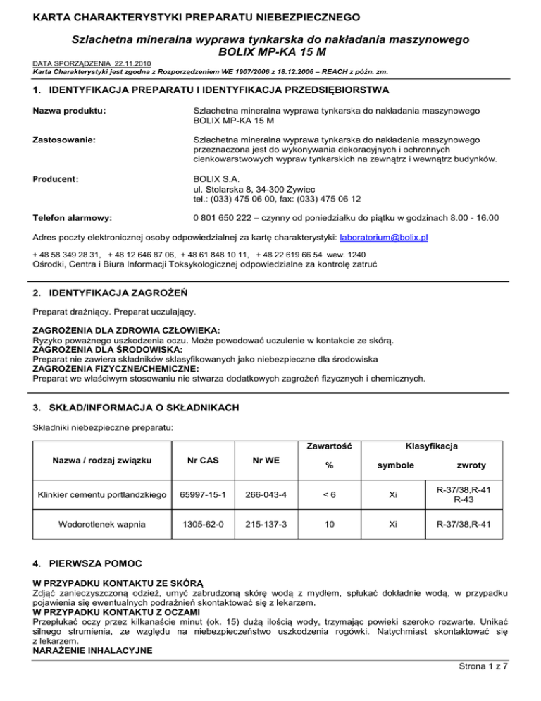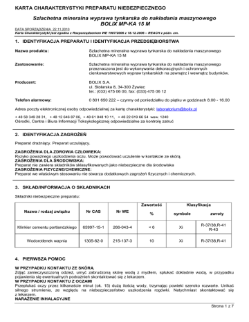 KARTA CHARAKTERYSTYKI PREPARATU NIEBEZPIECZNEGO Szlachetna mineralna wyprawa tynkarska do nakładania maszynowego BOLIX MP-KA 15 M DATA SPORZĄDZENIA 22.11.2010 Karta Charakterystyki jest zgodna z Rozporządzeniem WE 1907/2006 z 18.12.2006 – REACH z późn. zm. 1. IDENTYFIKACJA PREPARATU I IDENTYFIKACJA PRZEDSIĘBIORSTWA Nazwa produktu: Szlachetna mineralna wyprawa tynkarska do nakładania maszynowego BOLIX MP-KA 15 M Zastosowanie: Szlachetna mineralna wyprawa tynkarska do nakładania maszynowego przeznaczona jest do wykonywania dekoracyjnych i ochronnych cienkowarstwowych wypraw tynkarskich na zewnątrz i wewnątrz budynków. Producent: BOLIX S.A. ul. Stolarska 8, 34-300 Żywiec tel.: (033) 475 06 00, fax: (033) 475 06 12 Telefon alarmowy: 0 801 650 222 – czynny od poniedziałku do piątku w godzinach 8.00 - 16.00 Adres poczty elektronicznej osoby odpowiedzialnej za kartę charakterystyki: [email protected] + 48 58 349 28 31, + 48 12 646 87 06, + 48 61 848 10 11, + 48 22 619 66 54 wew. 1240 Ośrodki, Centra i Biura Informacji Toksykologicznej odpowiedzialne za kontrolę zatruć 2. IDENTYFIKACJA ZAGROŻEŃ Preparat drażniący. Preparat uczulający. ZAGROŻENIA DLA ZDROWIA CZŁOWIEKA: Ryzyko poważnego uszkodzenia oczu. Może powodować uczulenie w kontakcie ze skórą. ZAGROŻENIA DLA ŚRODOWISKA: Preparat nie zawiera składników sklasyfikowanych jako niebezpieczne dla środowiska ZAGROŻENIA FIZYCZNE/CHEMICZNE: Preparat we właściwym stosowaniu nie stwarza dodatkowych zagrożeń fizycznych i chemicznych. 3. SKŁAD/INFORMACJA O SKŁADNIKACH Składniki niebezpieczne preparatu: Zawartość Nazwa / rodzaj związku Nr CAS Nr WE Klinkier cementu portlandzkiego 65997-15-1 Wodorotlenek wapnia 1305-62-0 Klasyfikacja % symbole zwroty 266-043-4 <6 Xi R-37/38,R-41 R-43 215-137-3 10 Xi R-37/38,R-41 4. PIERWSZA POMOC W PRZYPADKU KONTAKTU ZE SKÓRĄ Zdjąć zanieczyszczoną odzież, umyć zabrudzoną skórę wodą z mydłem, spłukać dokładnie wodą, w przypadku pojawienia się ewentualnych podrażnień skontaktować się z lekarzem. W PRZYPADKU KONTAKTU Z OCZAMI Przepłukać oczy przez kilkanaście minut (ok. 15) dużą ilością wody, trzymając powieki szeroko rozwarte. Unikać silnego strumienia, ze względu na niebezpieczeństwo uszkodzenia rogówki. Natychmiast skontaktować się z lekarzem. NARAŻENIE INHALACYJNE Strona 1 z 7 KARTA CHARAKTERYSTYKI PREPARATU NIEBEZPIECZNEGO Szlachetna mineralna wyprawa tynkarska do nakładania maszynowego BOLIX MP-KA 15 M DATA SPORZĄDZENIA 22.11.2010 Karta Charakterystyki jest zgodna z Rozporządzeniem WE 1907/2006 z 18.12.2006 – REACH z późn. zm. W razie zawrotów głowy lub nudności wyprowadzić poszkodowanego na świeże powietrze, w razie braku szybkiej poprawy zasięgnąć porady lekarza. W PRZYPADKU POŁKNIĘCIA Nie wywoływać wymiotów, wypłukać usta dużą ilością wody, natychmiast skonsultować się z lekarzem. Nigdy nie podawać niczego doustnie osobie nieprzytomnej. 5. POSTĘPOWANIE W PRZYPADKU POŻARU PODSTAWOWE ZASADY POSTĘPOWANIA Opakowany produkt znajdujący się w strefie pożaru chłodzić rozproszonym strumieniem wody, o ile jest to możliwe usunąć ze strefy zagrożenia. Nie należy przebywać w strefie pożaru bez odpowiedniego ubrania odpornego na działanie chemikaliów oraz aparatu do oddychania z niezależnym obiegiem powietrza. Nie dopuszczać do przedostania się wody gaśniczej do wód powierzchniowych, gruntowych i kanalizacji. ZALECANE ŚRODKI GAŚNICZE Piana alkoholoodporna lub suche proszki gaśnicze, dwutlenek węgla (gaśnica śniegowa), piasek lub ziemia, mgła wodna. Stosować metody gaśnicze odpowiednie do warunków otoczenia. NIEODPOWIEDNIE ŚRODKI GAŚNICZE Silny strumień wody. Środki ochrony indywidualnej dla strażaków: w przypadku pożaru w zamkniętym pomieszczeniu należy stosować odzież ochronną i aparat oddechowy na sprężone powietrze. 6. POSTĘPOWANIE W PRZYPADKU NIEZAMIERZONEGO UWOLNIENIA DO ŚRODOWISKA Zawiadomić o awarii odpowiednie służby. Usunąć z obszaru zagrożenia osoby niebiorące udziału w likwidacji awarii. INDYWIDUALNE ŚRODKI OSTROŻNOŚCI Zadbać o wystarczające wietrzenie, usunąć potencjalne źródła zapłonu, stosować rękawice ochronne wykonane z gumy naturalnej lub PVA, stosować obuwie oraz ubranie ochronne. OCHRONA ŚRODOWISKA Zapobiegać rozprzestrzenianiu się oraz przedostaniu do kanalizacji i zbiorników wodnych, poinformować władze lokalne w przypadku niemożności zapewnienia ochrony. METODY USUWANIA ZANIECZYSZCZEŃ Usuwać poprzez zebranie mechaniczne do odpowiednio oznakowanych pojemników w celu utylizacji zgodnie z obowiązującymi przepisami. Punkt 13 karty. 7. POSTĘPOWANIE Z PREPARATEM I JEGO MAGAZYNOWANIE POSTĘPOWANIE Z PREPARATEM Stosować w pomieszczeniach dobrze wentylowanych. Unikać kontaktu z oczami. Unikać przedłużonego lub powtarzającego się kontaktu ze skórą. Unikać podwyższonej temperatury, gorących powierzchni i otwartego ognia. Unikać wdychania pyłów produktu. MAGAZYNOWANIE Przechowywać w chłodnym, suchym, dobrze wentylowanym pomieszczeniu, w prawidłowo oznakowanym szczelnie zamkniętym oryginalnym pojemniku. Unikać bezpośredniego działania promieni słonecznych, gorących powierzchni, otwartego ognia i źródeł ciepła. 8. KONTROLA NARAŻENIA I ŚRODKI OCHRONY INDYWIDUALNEJ Normy ekspozycji dla zagrożeń zawodowych zgodnie z Rozporządzeniem Ministra Pracy i Polityki Społecznej w sprawie najwyższych dopuszczalnych stężeń i natężeń czynników szkodliwych dla zdrowia w środowisku pracy z dnia 29 listopada 2002 r. (Dz.U. Nr 217, poz. 1833 z późn. zm.). W preparacie występują następujące składniki dla których obowiązują normy ekspozycji. Strona 2 z 7 KARTA CHARAKTERYSTYKI PREPARATU NIEBEZPIECZNEGO Szlachetna mineralna wyprawa tynkarska do nakładania maszynowego BOLIX MP-KA 15 M DATA SPORZĄDZENIA 22.11.2010 Karta Charakterystyki jest zgodna z Rozporządzeniem WE 1907/2006 z 18.12.2006 – R