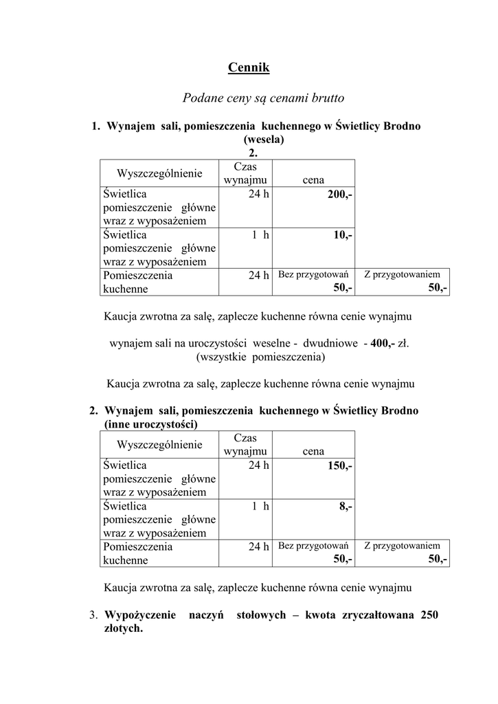 Cennik Podane ceny są cenami brutto 1. Wynajem sali, pomieszczenia kuchennego w Świetlicy Brodno (wesela) 2. Czas Wyszczególnienie wynajmu cena Świetlica 24 h 200,pomieszczenie główne wraz z wyposażeniem Świetlica 1 h 10,pomieszczenie główne wraz z wyposażeniem Pomieszczenia 24 h Bez przygotowań Z przygotowaniem 50,50,kuchenne Kaucja zwrotna za salę, zaplecze kuchenne równa cenie wynajmu wynajem sali na uroczystości weselne - dwudniowe - 400,- zł. (wszystkie pomieszczenia) Kaucja zwrotna za salę, zaplecze kuchenne równa cenie wynajmu 2. Wynajem sali, pomieszczenia kuchennego w Świetlicy Brodno (inne uroczystości) Czas Wyszczególnienie wynajmu cena Świetlica 24 h 150,pomieszczenie główne wraz z wyposażeniem Świetlica 1 h 8,pomieszczenie główne wraz z wyposażeniem Pomieszczenia 24 h Bez przygotowań Z przygotowaniem 50,50,kuchenne Kaucja zwrotna za salę, zaplecze kuchenne równa cenie wynajmu 3. Wypożyczenie złotych. naczyń stołowych – kwota zryczałtowana 250 Cennik Podane ceny są cenami brutto Wynajem sali, pomieszczenia kuchennego w Świetlicy Bukówek (wesela) Czas Wyszczególnienie wynajmu cena Świetlica 24 h 400,pomieszczenie główne wraz z wyposażeniem Świetlica 1 h 20,pomieszczenie główne wraz z wyposażeniem Pomieszczenia 24 h Bez przygotowań Z przygotowaniem 100,200,kuchenne Kaucja zwrotna za salę, zaplecze kuchenne równa cenie wynajmu 1) wynajem sal na uroczystości weselne - dwudniowe 1.000,- zł. (wszystkie pomieszczenia) 1 2 3 4 5 6 7 Wypożyczenie naczyń stołowych szklanki, kieliszki, literatki, szampanówki w zestawie pojedynczym talerze deserowe talerze głębokie i płytkie w zestawie miski małe półmiski małe i śledziówki półmiski i miski duże w zestawie komplet sztućców kuchennych waza stołowa łyżka wazowa Obrus - sztuka 0,10 zł. za sztukę 0,30 zł. za całość 0,50 zł. za sztukę 0,50 zł. za sztukę 1,50 zł. 0,70 zł. za sztukę 1,00 zł. za sztukę 1,50 zł. za sztukę 3,00 zł. 1,00 zł. 2,00 zł. 0,50 zł. 5 zł. Dopuszcza się możliwość negocjacji cen przy zamówieniu powyżej 20 kompletów. Wynajem sali, pomieszczenia kuchennego w Świetlicy Bukówek (inne uroczystości) Czas Wyszczególnienie wynajmu cena Świetlica 24 h 300,pomieszczenie główne wraz z wyposażeniem Świetlica 1 h 15,pomieszczenie główne wraz z wyposażeniem Pomieszczenia 24 h Bez przygotowań Z przygotowaniem 100,200,kuchenne Kaucja zwrotna za salę, zaplecze kuchenne równa cenie wynajmu 1 2 3 4 5 6 2. Wypożyczenie naczyń stołowych szklanki, kieliszki, literatki, szampanówki w zestawie pojedynczym talerze deserowe talerze głębokie i płytkie w zestawie miski małe półmiski małe i śledziówki półmiski i miski duże w zestawie komplet sztućców kuchennych waza stołowa łyżka wazowa 0,10 zł. za sztukę 0,30 zł. za całość 0,50 zł. za sztukę 0,50 zł. za sztukę 1,50 zł. 0,70 zł. za sztukę 1,00 zł. za sztukę 1,50 zł. za sztukę 3,00 zł. 1,00 zł. 2,00 zł. 0,50 zł. Dopuszcza się możliwość negocjacji cen przy zamówieniu powyżej 20 kompletów. Cennik Podane ceny są cenami brutto Wynajem sali, pomieszczenia kuchennego w Świetlicy Cesarzowice (wesela) Czas Wyszczególnienie wynajmu cena Świetlica 24 h 100,pomieszczenie główne wraz z wyposażeniem Świetlica pomieszczenie główne wraz z wyposażeniem Pomieszczenia kuchenne 1 h 5,- 24 h Bez przygotowań 0,- Z przygotowaniem 0,- Kaucja zwrotna za salę, zaplecze kuchenne równa cenie wynajmu 1) wynajem sal na uroczystości weselne - dwudniowe 200,- zł. (wszystkie pomieszczenia) Wypożyczenie naczyń stołowych 0,10 zł. za sztukę 1 szklanki, kieliszki, literatki, szampanówki w zestawie pojedynczym 0,30 zł. za całość 0,50 zł. za sztukę 2 talerze deserowe talerze głębokie i płytkie 0,50 zł. za sztukę w zestawie 1,50 zł. 0,70 zł. za sztukę 3 miski małe półmiski małe i śledziówki 1,00 zł. za sztukę półmiski i miski duże 1,50 zł. za sztukę w zestawie 3,00 zł. 1,00 zł. 4 komplet sztućców kuchennych 2,00 zł. 5 waza stołowa 0,50 zł. 6 łyżka wazowa Dopuszcza się możliwość negocjacji cen przy zamówieniu powyżej 20 kompletów. Wynajem sali, pomieszczenia kuchennego w Świetlicy Cesarzowice (inne uroczystości) Czas Wyszczególnienie wynajmu cena Świetlica 24 h 100,pomieszczenie główne wraz z wyposażeniem Świetlica 1 h 5,pomieszczenie główne wraz z wyposażeniem Pomieszczenia 24 h Bez przygotowań Z przygotowaniem 0,0,kuchenne Kaucja zwrotna za salę, zaplecze kuchenne równa cenie wynajmu 1 2 3 4 5 6 2. Wypożyczenie naczyń stołowych szklanki, kieliszki, literatki, szampanówki w zestawie pojedynczym talerze deserowe talerze głębokie i płytkie w zestawie miski małe półmiski małe i śledziówki półmiski i miski duże w zestawie komplet sztućców kuchennych waza stołowa łyżka wazowa 0,10 zł. za sztukę 0,30 zł. za całość 0,50 zł. za sztukę 0,50 zł. za sztukę 1,50 zł. 0,70 zł. za sztukę 1,00 zł. za sztukę 1,50 zł. za sztukę 3,00 zł. 1,00 zł. 2,00 zł. 0,50 zł. Dopuszcza się możliwość negocjacji cen przy zamówieniu powyżej 20 kompletów. Cennik Podane ceny są cenami brutto Wynajem sali, pomieszczenia kuchennego w Świetlicy Chwalimierz (wesela) Czas Wyszczególnienie wynajmu cena Świetlica 24 h 100,pomieszczenie główne wraz z wyposażeniem Świetlica 1 h 5,pomieszczenie główne wraz z wyposażeniem Pomieszczenia 24 h Bez przygotowań Z przygotowaniem 0,0,kuchenne Kaucja zwrotna za salę, zaplecze kuchenne równa cenie wynajmu 1) wynajem sal na uroczystości weselne - dwudniowe 200,- zł. (wszystkie pomieszczenia) Wypożyczenie naczyń stołowych szklanki, kieliszki, literatki, szampanówki 0,10 zł. za sztukę w zestawie pojedynczym 0,30 zł. za całość 0,50 zł. za sztukę 2 talerze deserowe talerze głębokie i płytkie 0,50 zł. za sztukę w zestawie 1,50 zł. 0,70 zł. za sztukę 3 miski małe półmiski małe i śledziówki 1,00 zł. za sztukę półmiski