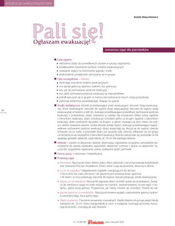 edukacja wieloobszarowa Józefa Mazurkiewicz Pali się! Ogłaszam ewakuację! scenariusz zajęć dla pięciolatków ■ Cele ogólne: ●wdrożenie dzieci do prawidłowych postaw w sytuacji zagrożenia; ● kształtowanie rozumienia symboli i znaków ewakuacyjnych; ●rozwijanie reakcji na różnorodne sygnały i znaki; ●doskonalenie umiejętności poruszania się w grupie. ■ Cele szczegółowe – dziecko: ●dostrzega znaczenie znaków ewakuacyjnych; ●zna sprzęt gaśniczy (gaśnica, hydrant, koc gaśniczy); ●wie, jak się zachowywać podczas ewakuacji; ●wie, jakie zachowania podczas ewakuacji są nieprawidłowe; ●potrafi poruszać się w grupie: w marszu bez potrącania innych, omija przeszkody; ● wykonuje polecenia prowadzącego, reaguje na sygnał. 56 ■ Środki dydaktyczne: obrazki przedstawiające znaki ewakuacyjne: kierunek drogi ewakuacyjnej, drzwi ewakuacyjne, kierunek do wyjścia drogi ewakuacyjnej, kierunek do wyjścia drogi ewakuacyjnej schodami w dół itd.; ilustracje przedstawiające prawidłowe zachowanie podczas ewakuacji z przedszkola: dzieci ustawione w rzędzie idą korytarzem blisko ściany zgodnie z kierunkiem ewakuacji; dzieci schodzą po schodach jedno za drugim zgodnie z kierunkiem ewakuacji; dzieci pochylone idą jedno za drugim, w górze unoszący się dym; dzieci na miejscu zbiórki ustawione parami, osoba dorosła składa raport; ilustracje przedstawiające nieprawidłowe zachowanie podczas ewakuacji: dzieci popychają się, tłoczą się do wyjścia; dziecko schowało się za szafą, a pozostałe dzieci już opuściły salę; dziecko odłączyło się od grupy i przemieszcza się niezgodnie z kierunkiem ewakuacji; dziecko zatrzymało się, pozostałe na nie wpadają; gwizdek, bębenek, paski bibuły ok. 10 cm dla każdego dziecka. ■ Metody: • oparte na aktywności dziecka: obserwacja, odpowiedzi na pytania, samodzielne dochodzenie do wiedzy, swobodna wypowiedź, aktywność ruchowa • oparte na aktywności nauczyciela: pogadanka, wyjaśnianie, pokaz, zadawanie pytań, pochwała. ■ Formy pracy: • zbiorowa • indywidualna. ■ Przebieg zajęć: ●Powitanie. Nauczyciel mówi: Witam dzieci, które lubią kolor czerwony/widziały kiedykolwiek wóz strażacki/chcą być strażakami. Dzieci, które czują się powitane, klaszczą w dłonie. ●Co to za zagadka? Odgadywanie zagadek nawiązujących do tematu: • Na ścianie wisi cała czerwona i do gaszenia jest przeznaczona. (gaśnica) • W dzień i w nocy połyskują, kierunek do wyjścia zawsze pokazują. (znaki ewakuacyjne) ●Spacer po przedszkolu. Nauczyciel zaprasza dzieci na krótki spacer po przedszkolu. Zachęca do zwrócenia uwagi na znaki wiszące na ścianach, zaobserwowania, ile jest wyjść z budynku, gdzie wiszą gaśnice. Przypomina, jak należy chodzić po schodach. Powrót do sali. ●Sprzęt gaśniczy w przedszkolu. Nauczyciel omawia wygląd i zastosowanie gaśnicy, hydrantu wewnętrznego, koca gaśniczego. ●Węże strażackie. Ćwiczenie sprawności manualnych. Każde dziecko otrzymuje pasek bibuły szerokości ok. 10 cm. Dzieci zwijają bibułę w rulon, a następnie, trzymając jej koniec, wyrzucają do przodu i rozwijają jak wąż strażacki. nr 7-8.154-155 lipiec-sierpień 2014 edukacja wieloobszarowa ●Do czego służą znaki ewakuacyjne? Nauczyciel pokazuje i wspólnie z dziećmi omawia obrazki przestawiające znaki ewakuacyjne. Mówi, że pokazują drogę do wyjścia ewakuacyjnego, tłumaczy, że są „świecące”, aby zawsze były dobrze widoczne. Poza tym pomagają wyjść z budynku w razie niebezpieczeństwa (np. gdy wybuchnie pożar). wydrukowane pomoce dydaktyczne (10 kart A5) prenumerata PLUS zostały dołączone do miesięcznika – szczegóły na str. 5 ! ●Co to jest ewakuacja? Nauczyciel wyjaśnia, że ewakuacja to natychmiastowe przemieszczenie ludzi z miejsca, w którym wystąpiło zagrożenie życia i zdrowia, np. wybuchł pożar. Dzieci na polecenie nauczyciela muszą szybko się ustawić w rzędzie i opuścić pomieszczenie. Mają iść blisko ściany. Przy silnym zadymieniu idą w pozycji schylonej, gdyż dym i gorące powietrze unosi się do góry, a na dole powietrze jest bardziej czyste i chłodne niż wyżej. Dzieci na miejscu zbiórki stoją ustawione parami (ilustracje). Nauczyciel rozmawia z dziećmi na temat, czego nie należy robić w czasie ewakuacji (np. nie należy się chować, nie wolno popychać innych, zatrzymywać się i zmieniać kierunku, nie wolno się wracać np. po zabawkę – ilustracje). 57 wydrukowane pomoce dydaktyczne (8 kart A4) prenumerata PLUS zostały dołączone do miesięcznika – szczegóły na str. 5 ! ●Ogłaszam ewakuację! Zabawa ruchowa z reakcją na sygnał – dzieci na sygnał dźwiękowy ( jeden długi gwizdek) ustawiają się w parach i maszerują w rytm bębenka dookoła dywanu. Na dwa krótkie gwizdki szybko ustawiają się w rzędzie blisko ściany, następnie idą jedno za drugim, trzymając się jak najbliżej ściany i omijając napotkane przeszkody (np. stoliki, krzesła). Na trzy gwizdki – wszyscy się pochylają. Na zakończenie nauczyciel udziela dzieciom pochwały za prawidłowe wykonanie ćwiczeń. ▪ scenariusz został wyróżniony w konkursie Ty opracuj scenariusz zajęć, a my... nr 7-8.154-155 Józefa Mazurkiewicz – nauczyciel dyplomowany z 38-letnim stażem. Dyrektor Przedszkola nr 10 im. Misia Uszatka w Koszalinie. Propagatorka aktywnych metod pracy z dziećmi i autorka innowacji pedagogicznych. Jej zainteresowania pedagogiczne skupiają się na kształtowaniu właściwych postaw dzieci wobec problemów bezpieczeństwa. lipiec-sierpień 2014