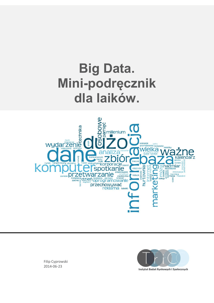 Big Data. Mini-podręcznik dla laików. Filip Cyprowski 2014-06-23 Spis treści Co to jest Big Data? .............................................................................................. 3 Kto korzysta z Big Data? ....................................................................................... 6 Big Words – kluczowe pojęcia dla Big Data ............................................................ 7 Data science ..................................................................................................... 7 Data mining ...................................................................................................... 8 Machine learning ............................................................................................... 9 MapReduce..................................................................................................... 10 Hadoop .......................................................................................................... 13 Narzędzia do analizy Big Data ............................................................................. 14 Big data w małej firmie ....................................................................................... 16 Czy naprawdę musisz? .................................................................................... 16 Nowe możliwości............................................................................................. 16 Rozwój technik analitycznych ....................................................................... 17 Rozwój infrastruktury analitycznej................................................................. 17 Rewolucja Open Source ............................................................................... 17 Zamiast podsumowania – jak zwiększyć efektywność firmy dzięki Big Data?........... 19 Co my możemy zaproponować? .......................................................................... 20 2 Co to jest Big Data? Dużo danych? Wielkie dane? Wszyscy o tym słyszymy, ale właściwie nie wiemy o czym naprawdę mowa i przede wszystkim – jakie znaczenie ma dla nas – niekoniecznie szefów Facebooka, Google i wielkich projektów naukowych (np. Herschel Space Observatory)? Big Data to przede wszystkim analizy i sposoby przetwarzania danych. Krótko mówiąc – jest to nowy sposób na wyciągnięcie z rozmaitych danych (internetowych, wewnętrznych - np. z maszyn produkcyjnych) wiedzy, która przyczyni się do poprawy funkcjonowania firmy. Z reguły zresztą chodzi o zmianę rewolucyjną, wzbicie firmy na wyższy poziom efektywności. Dlaczego jednak uznajemy, że jest to nowy sposób? W końcu analizy w firmach prowadzone są – z różnym natężeniem – od dawna. Big Data definiuje się najczęściej poprzez trzy warunki (tzw. 3V 1). Mówimy więc, że „data” jest „big”, gdy: Danych jest dużo („Volume”) – niestety brakuje odpowiedzi na pytanie, od jakiej ilości danych stwierdza się, że tak jest. Kilka gigabajtów? Terabajt? Kilka terabajtów? Kwestia ta jest, jak się okazuje, dość subiektywna. Wrócimy do tego. Dane szybko wchodzą i wychodzą („Velocity”) – czyli analizy tworzone są często w czasie rzeczywistym, są silnie zautomatyzowane (np. bez interakcji z człowiekiem pobierają niezbędne dane, przetwarzają je itd.) oraz ilość danych stale się powiększa. Dane są zróżnicowane („Variety”) – mają różne formaty (np. teksty, zdjęcia, filmy, dokumenty) i często są nieustrukturyzowane. Oznacza to, 1 Czytelnik może spotkać się również z definicją 4V, ale ów dodatkowy komponent („Value” – czyli fakt, iż z danych można wyciągnąć informację) jest stricte biznesowy i… subiektywny. Analiza bezużytecznych danych to – w kwestach technicznych – to samo, co analiza danych użytecznych. 3 że aplikacje i programy Big Data muszą być zdolne do ich przetwarzania i strukturyzowania. Co to oznacza? Wyjaśnimy w dalszych częściach miniebooka. Załóżmy więc teraz trzy autentyczne przypadki analiz i zastanówmy się, czy można je określić jako Big Data: Przypadek 1. • Mamy 3GB danych dotyczących produkcji (liczba wyprodukowanych towarów w danej godzinie). Dział analityków na bieżąco prowadzi analizy prognostyczne w celu uzyskania jak największej wydajności produkcji. Przypadek 2. • Specjalna aplikacja ściąga z portali społecznościowych wypowiedzi klientów na temat Twojej marki, a następnie analitycy czerpią z nich informacje o satysfakcji klientów. (załóżmy, że dziennie napływa ok. 100 wypowiedzi). Przypadek 3. • Firmowa aplikacja zbiera dane z czujników sensorycznych w maszynach i na bieżąco podaje niezbędne statystyki. Dane senoryczne przyrastają z dużą prędkością (np. 1GB na dzień). Przypadek 1 nie spełnia żadnego warunku Big Data – danych jest właściwie mało (choć już nie mieszczą się w arkuszu Excela), zaś analizy prowadzone są przede wszystkim przez analityków. To oni kierują zapytania do bazy danych, oni generują raporty. Przypadek 2 nie spełnia wszystkich wymagań Big Data, choć ma pewne wymagane cechy. Dane nie są silnie ustrukturyzowane („Variety”), a ich zdobywaniem i przetwarzaniem zajmuje się specjalna aplikacja („Velocity”). Żeby wydobyć z danych wiedzę konieczna jest co prawda praca analityków, ale wciąż duża część przetwarzania odbywa się automatycznie. Problemem jest jednak niewielka ilość danych. Przypadek 3 spełnia wszystkie wymagania Big Data. Dane przetwarzane są automatycznie („Velocity”), są nieustrukturyzowane („Variety” – zanim będzie je 4 można zamknąć w tabeli trzeba je „pociąć”, „posortować” itd.) oraz jest ich dużo i stale przyrastają („Volume”). Warto jednak się zastanowić, czy w kwestii analizy i potencjalnych korzyści z tych wszystkich przypadków różnią się one tak bardzo i czy różnica ta jest istotna dla menadżerów i właśc