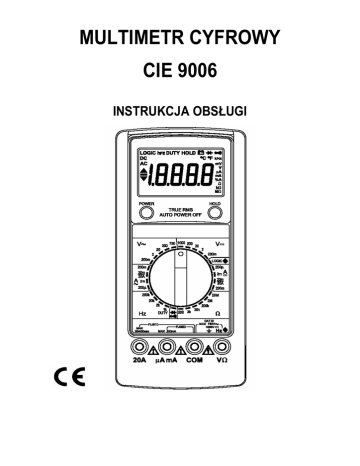 MULTIMETR CYFROWY CIE 9006 INSTRUKCJA OBSŁUGI SPIS TREŚCI WPROWADZENIE....................................................................................................... 3 ZAWARTOŚĆ ZESTAWU............................................................................................ 3 BEZPIECZEŃSTWO OBSŁUGI................................................................................... 4 OPIS PŁYTY CZOŁOWEJ MIERNIKA........................................................................ 6 POMIARY.................................................................................................................... 10 Pomiar napięcia........................................................................................................... 10 Pomiar prądu............................................................................................................... 11 Pomiar rezystancji....................................................................................................... 12 Test ciągłości............................................................................................................... 13 Test diod...................................................................................................................... 13 Test logiczny................................................................................................................13 Pomiar częstotliwości i współczynnika wypełnienia.....................................................14 SPECYFIKACJA......................................................................................................... 15 Dane ogólne................................................................................................................ 15 Dane techniczne.......................................................................................................... 15 SERWIS...................................................................................................................... 18 Wymiana baterii zasilającej......................................................................................... 18 Wymiana bezpieczników............................................................................................. 19 -2- WPROWADZENIE Poniższa instrukcja zawiera informacje i ostrzeżenia, których należy przestrzegać, aby posługiwać się miernikiem w sposób bezpieczny tak dla operatora jak i dla samego urządzenia. OSTRZEŻENIE PRZED UŻYCIEM PRZYRZĄDU NALEŻY ZAPOZNAĆ SIĘ Z PUNKTEM DOTYCZĄCYM „BEZPIECZEŃSTWA OBSŁUGI” Miernik ten jest urządzeniem przenośnym o wysokiej dokładności przeznaczonym do użytku w przemyśle elektronicznym, laboratoriach oraz serwisach. Cechują go: kompaktowe wzornictwo, zaokrąglone krawędzie dla wygodniejszego użytkowania, wzmocniona obudowa chroniąca przed udarami mechanicznymi i wysoką temperaturą. Model 9006 posiada elektroniczne zabezpieczenia wszystkich funkcji i zakresów pomiarowych. Obudowa przyrządu posiada dodatkowo zintegrowany holster chroniącym miernik przed uderzeniem. Dzięki tym wszystkim cechom model CIE 9006 jest bardzo wytrzymałym, precyzyjnym i profesjonalnym narzędziem pomiarowym. ZAWARTOŚĆ ZESTAWU Po rozpakowaniu nowego multimetru w zestawie powinny znajdować się następujące elementy: 1. Multimetr 2. Przewody pomiarowe (para: czerwony i czarny) 3. Bateria 9V (w mierniku) 4. Instrukcja obsługi w języku polskim 5. Zapasowy bezpiecznik 500mA/500V (6,3 x 32 mm, ceramiczny, szybki) Kompletność zestawu należy sprawdzić w momencie zakupu w obecności sprzedawcy. -3- BEZPIECZEŃSTWO OBSŁUGI Poniższa instrukcja obsługi zawiera informacje i ostrzeżenia, których należy przestrzegać, aby bezpiecznie posługiwać się miernikiem jednocześnie obsługując go w bezpiecznych warunkach: 1. Przed przystąpieniem do pomiarów należy dokładnie przeczytać poniższą instrukcję obsługi zwracając szczególną uwagę na OSTRZEŻENIA. 2. Przed użyciem miernika należy zawsze sprawdzić przewody pomiarowe, wtyki bananowe i sondy pomiarowe pod kątem ewentualnych zniszczeń izolacji lub odsłoniętych części metalowych. Jeżeli zostaną wykryte uszkodzenia należy je bezwzględnie usunąć przed przystąpieniem do pomiarów. 3. Aby uniknąć ryzyka pożaru lub porażenia prądem, należy chronić miernik przed bezpośrednimi promieniami słonecznymi, ekstremalnymi temperaturami, deszczem i wilgocią. Miernik przeznaczony jest do użytku wewnątrz pomieszczeń. 4. Podczas pomiarów operator nie może mieć bezpośredniego kontaktu z elementami o potencjale ziemi (np. odsłonięte metalowe rury instalacji c.o., przewody uziemienia, itp.). Należy zapewnić sobie dobrą izolację dzięki odpowiednim ubraniom roboczym, obuwiu, matom izolującym, itd. 5. Należy zachować dużą ostrożność przy pomiarze napięć przekraczających 40 VDC lub 20 VACrms. Napięcia te stanowią potencjalne zagrożenie dla człowieka. 6. W trakcie pomiarów nie wolno przekraczać maksymalnych dopuszczalnych wartości wejściowych dla każdej funkcji pomiarowej. W celu weryfikacji maksymalnych wartości patrz: SPECYFIKACJA. 7. Nie wolno dotykać odsłoniętych części przewodzących, jeżeli do mierzonego obwodu załączone jest zasilanie. 8. Miernika nie wolno używać w atmosferze grożącej wybuchem (np. w obecności gazów łatwopalnych, oparów, pyłów, itp.) 9. Przy sprawdzaniu obecności napięcia należy upewnić się, że funkcja ta działa prawidłowo (za pomocą pomiaru znanej wartości napięcia) zanim przyjmie się, że zerowy odczyt oznacza brak napięcia. 10. Wszelkie prace związane z kalibracją lub naprawą mogą być przeprowadzane tylko przez autoryzowane punkty serwisowe. -4- Miernik jest urządzeniem klasy II (podwójna izolacja), dla przepięć kat. III 1000V zgodnie z normami IEC 1010-1(EN61010-1), UL3111-1 oraz CAN-CSA C22.2 No. 1010.010-30. Stopień zanieczyszczenia 2 zgodnie z IEC-664 wewnątrz pomieszcz