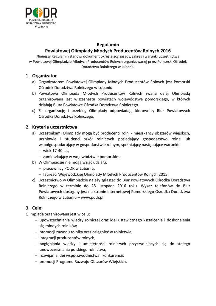 Regulamin Powiatowej Olimpiady Młodych Producentów Rolnych 2016 Niniejszy Regulamin stanowi dokument określający zasady, zakres i warunki uczestnictwa w Powiatowej Olimpiadzie Młodych Producentów Rolnych organizowanej przez Pomorski Ośrodek Doradztwa Rolniczego w Lubaniu 1. Organizator a) Organizatorem Powiatowej Olimpiady Młodych Producentów Rolnych jest Pomorski Ośrodek Doradztwa Rolniczego w Lubaniu. b) Powiatowa Olimpiada Młodych Producentów Rolnych zwana dalej Olimpiadą organizowana jest w szesnastu powiatach województwa pomorskiego, w których działają Biura Powiatowe Ośrodka Doradztwa Rolniczego. c) Za organizację i przebieg Olimpiady odpowiadają kierownicy Biur Powiatowych Ośrodka Doradztwa Rolniczego. 2. Kryteria uczestnictwa a) Uczestnikami Olimpiady mogą być producenci rolni - mieszkańcy obszarów wiejskich, uczniowie i studenci szkół rolniczych posiadający gospodarstwo rolne lub współgospodarujący w gospodarstwie rolnym, spełniający następujące warunki: wiek 17-40 lat, zamieszkujący w województwie pomorskim. b) W Olimpiadzie nie mogą wziąć udziału: pracownicy PODR w Lubaniu, laureaci Wojewódzkiej Olimpiady Młodych Producentów Rolnych 2015. c) Uczestnictwo w Olimpiadzie należy zgłaszać do Biur Powiatowych Ośrodka Doradztwa Rolniczego w terminie do 28 listopada 2016 roku. Wykaz telefonów do Biur Powiatowych dostępny jest na stronie internetowej Pomorskiego Ośrodka Doradztwa Rolniczego w Lubaniu – www.podr.pl. 3. Cele: Olimpiada organizowana jest w celu: upowszechniania wiedzy rolniczej oraz idei ustawicznego kształcenia i doskonalenia się młodych rolników, promocji zawodu rolnika oraz osiągnięć w rolnictwie, integracji producentów rolnych, pogłębiania wiedzy i umiejętności rolniczych przyczyniających się do stałego unowocześniania polskiego rolnictwa, rozwijania idei współzawodnictwa i konkurencji, promocji Programu Rozwoju Obszarów Wiejskich. 4. Czas trwania Olimpiada odbędzie się 02 grudnia 2016 roku o godzinie 10:00 w szesnastu powiatach województwa pomorskiego. Szczegółowy wykaz miejsc wraz z adresami, gdzie odbędą się Olimpiady dostępny jest na stronie internetowej Pomorskiego Ośrodka Doradztwa Rolniczego w Lubaniu - www.podr.pl. 5. Przebieg: a) Olimpiada składa się z dwóch części: I część - Test, II część - Egzamin ustny. b) Pytania będą obejmowały następujące zagadnienia: produkcja roślinna, produkcja zwierzęca, integrowana ochrona roślin, ekonomika, mechanizacja i budownictwo, bezpieczeństwo i higiena pracy, fundusze unijne (PROW na lata 2014-2020) Wspólna Polityka Rolna, przedsiębiorczość, ekologia i ochrona środowiska, odnawialne źródła energii, wiejskie gospodarstwo domowe; c) d) e) f) g) h) i) j) k) l) m) n) o) p) test obejmuje 50 pytań, czas opracowania testu - 60 minut, prawidłowa odpowiedź zawarta jest tylko w jednej z czterech odpowiedzi, za każdą prawidłową odpowiedź przyznawany będzie 1 punkt, za każdą nieprawidłową odpowiedź 0 punktów, Komisja odnotowuje kolejność oddania testów przez uczestników, w przypadku uzyskania takiej samej liczby punktów przez więcej niż jednego uczestnika, o kolejności decyduje czas oddania testu, pięciu uczestników, którzy uzyskają najwyższą liczbę punktów z testu przystępuje do II części Olimpiady - egzaminu ustnego, egzamin ustny polega na udzieleniu odpowiedzi na losowo wybrane przez uczestnika pytania przed Komisją i w obecności zaproszonych gości, każda odpowiedź oceniana jest w skali od 0 do 5 punktów, punkty z testu nie sumują się z punktami uzyskanymi z egzaminu ustnego, nie dopuszcza się miejsc „ex aeguo”, w przypadku uzyskania przez finalistów tej samej ilości punktów, komisja egzaminacyjna przeprowadza dogrywkę, Przewodniczący Komisji, po uzgodnieniu z członkami, decyduje o ilości przyznanych punktów w sposób jawny, punkty z Olimpiady nie przechodzą do Wojewódzkiej Olimpiady Młodych Producentów Rolnych, Przewodniczący Komisji sporządza protokół Olimpiady i ogłasza wyniki, q) Pięciu Laureatów Olimpiady z każdego powiatu zostaje zakwalifikowanych do Wojewódzkiej Olimpiady Młodych Producentów Rolnych, która odbędzie się 09 grudnia 2016 r. w Pomorskim Ośrodku Doradztwa Rolniczego w Lubaniu. 6. Komisja konkursowa: Skład Komisji Konkursowej zwanej dalej Komisją powołują Kierownicy Biur Powiatowych Ośrodka Doradztwa Rolniczego. W skład Komisji wchodzą specjaliści z zakresu rolnictwa. Do zadań Komisji należy między innymi: popularyzacja idei Olimpiady w środowisku, ocena testów, ocena odpowiedzi ustnych, przygotowanie protokołów, czuwanie nad prawidłowym przebiegiem Olimpiady, terminowe przekazanie do PODR w Lubaniu (Dział Metodyki Doradztwa Szkoleń i Wydawnictw) dokumentacji z przebiegu Olimpiady tj. protokół końcowy finału ustnego, listę 5 laureatów, protokół kolejności miejsc wg sumy zdobytych punktów., powołanie Komisji, dokumentację fotograficzną - 6 zdjęć z przebiegu Olimpiady. 7. Nagrody: Przewidywana pula nagród dla laureatów: I miejsce do kwoty 700 zł II miejsce do kwoty 600 zł III miejsce do kwoty 500 zł IV-V miejsce do kwoty 400 zł Dopuszcza się możliwość uhonorowania laureatów przez inne instytucje, urzędy, firmy itp. Dopuszcza się możliwość uhonorowania wybranych laureatów przez indywidualnych sponsorów. Nie przewiduje się miejsc równorzędnych. 8. Informacje dodatkowe: Przystępując do udziału w Powiatowej Olimpiadzie Młodych Producentów Rolnych uczestnicy zobowiązują się do uczestniczenia w kolejnych etapach tj. wojewódzkim, krajowym. Organizator zastrzega sobie możliwość dokonania zmian w Regulaminie Olimpiady. Organizator zastrzega sobie prawo do udostępniania i przetwarzania informacji, które są przedmiotem Olimpiady, celem realizacji procesu Olimpiady. Udział w Olimpiadzie jest równoznaczny z akceptacją Regulaminu, udostępnionego przez organizatora. Przed rozpo