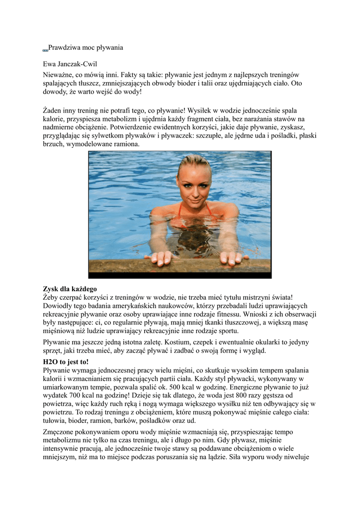 Prawdziwa moc pływania Ewa Janczak-Cwil Nieważne, co mówią inni. Fakty są takie: pływanie jest jednym z najlepszych treningów spalających tłuszcz, zmniejszających obwody bioder i talii oraz ujędrniających ciało. Oto dowody, że warto wejść do wody! Żaden inny trening nie potrafi tego, co pływanie! Wysiłek w wodzie jednocześnie spala kalorie, przyspiesza metabolizm i ujędrnia każdy fragment ciała, bez narażania stawów na nadmierne obciążenie. Potwierdzenie ewidentnych korzyści, jakie daje pływanie, zyskasz, przyglądając się sylwetkom pływaków i pływaczek: szczupłe, ale jędrne uda i pośladki, płaski brzuch, wymodelowane ramiona. Zysk dla każdego Żeby czerpać korzyści z treningów w wodzie, nie trzeba mieć tytułu mistrzyni świata! Dowiodły tego badania amerykańskich naukowców, którzy przebadali ludzi uprawiających rekreacyjnie pływanie oraz osoby uprawiające inne rodzaje fitnessu. Wnioski z ich obserwacji były następujące: ci, co regularnie pływają, mają mniej tkanki tłuszczowej, a większą masę mięśniową niż ludzie uprawiający rekreacyjnie inne rodzaje sportu. Pływanie ma jeszcze jedną istotna zaletę. Kostium, czepek i ewentualnie okularki to jedyny sprzęt, jaki trzeba mieć, aby zacząć pływać i zadbać o swoją formę i wygląd. H2O to jest to! Pływanie wymaga jednoczesnej pracy wielu mięśni, co skutkuje wysokim tempem spalania kalorii i wzmacnianiem się pracujących partii ciała. Każdy styl pływacki, wykonywany w umiarkowanym tempie, pozwala spalić ok. 500 kcal w godzinę. Energiczne pływanie to już wydatek 700 kcal na godzinę! Dzieje się tak dlatego, że woda jest 800 razy gęstsza od powietrza, więc każdy ruch ręką i nogą wymaga większego wysiłku niż ten odbywający się w powietrzu. To rodzaj treningu z obciążeniem, które muszą pokonywać mięśnie całego ciała: tułowia, bioder, ramion, barków, pośladków oraz ud. Zmęczone pokonywaniem oporu wody mięśnie wzmacniają się, przyspieszając tempo metabolizmu nie tylko na czas treningu, ale i długo po nim. Gdy pływasz, mięśnie intensywnie pracują, ale jednocześnie twoje stawy są poddawane obciążeniom o wiele mniejszym, niż ma to miejsce podczas poruszania się na lądzie. Siła wyporu wody niweluje sporą część siły grawitacji, dlatego w wodzie czujesz się lżejsza, nie dokucza ci ból kolan ani kręgosłupa. Nawet codzienne treningi pływackie nie spowodują kontuzji stawów, czego nie można wykluczyć np. przy codziennym bieganiu po asfalcie... Właśnie dlatego pływanie jest idealnym sportem, który można uprawiać całe życie i który – uwaga! – według naukowców ma działanie odmładzające organizm. Badania naukowe wykazały, że osoby latami regularnie pływające mają ciała nawet 20 lat młodsze niż wynikałoby z ich wieku metrykalnego. Ciśnienie krwi, poziom cholesterolu, sprawność serca i centralnego układu nerwowego pływaków są porównywalne do tych, jakimi mogą pochwalić się osoby dużo młodsze.