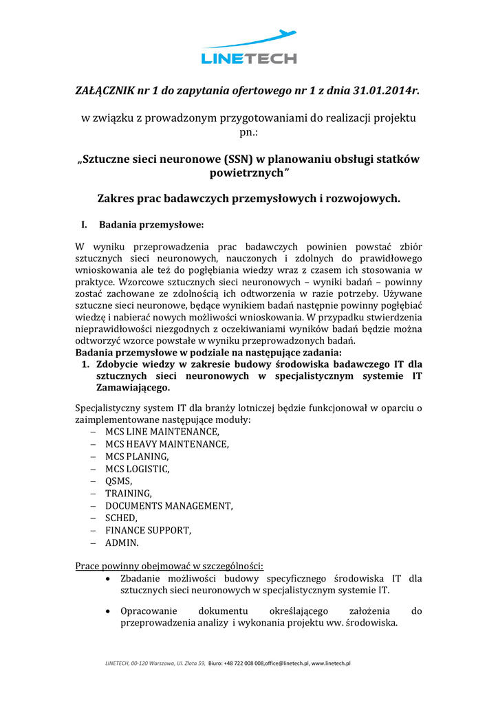 ZAŁĄCZNIK nr 1 do zapytania ofertowego nr 1 z dnia 31.01.2014r. w związku z prowadzonym przygotowaniami do realizacji projektu pn.: „Sztuczne sieci neuronowe (SSN) w planowaniu obsługi statków powietrznych” Zakres prac badawczych przemysłowych i rozwojowych. I. Badania przemysłowe: W wyniku przeprowadzenia prac badawczych powinien powstać zbiór sztucznych sieci neuronowych, nauczonych i zdolnych do prawidłowego wnioskowania ale też do pogłębiania wiedzy wraz z czasem ich stosowania w praktyce. Wzorcowe sztucznych sieci neuronowych – wyniki badań – powinny zostać zachowane ze zdolnością ich odtworzenia w razie potrzeby. Używane sztuczne sieci neuronowe, będące wynikiem badań następnie powinny pogłębiać wiedzę i nabierać nowych możliwości wnioskowania. W przypadku stwierdzenia nieprawidłowości niezgodnych z oczekiwaniami wyników badań będzie można odtworzyć wzorce powstałe w wyniku przeprowadzonych badań. Badania przemysłowe w podziale na następujące zadania: 1. Zdobycie wiedzy w zakresie budowy środowiska badawczego IT dla sztucznych sieci neuronowych w specjalistycznym systemie IT Zamawiającego. Specjalistyczny system IT dla branży lotniczej będzie funkcjonował w oparciu o zaimplementowane następujące moduły: MCS LINE MAINTENANCE, MCS HEAVY MAINTENANCE, MCS PLANING, MCS LOGISTIC, QSMS, TRAINING, DOCUMENTS MANAGEMENT, SCHED, FINANCE SUPPORT, ADMIN. Prace powinny obejmować w szczególności: Zbadanie możliwości budowy specyficznego środowiska IT dla sztucznych sieci neuronowych w specjalistycznym systemie IT. Opracowanie dokumentu określającego założenia przeprowadzenia analizy i wykonania projektu ww. środowiska. LINETECH, 00-120 Warszawa, Ul. Złota 59, Biuro: +48 722 008 008,[email protected], www.linetech.pl do Określenie wymagań związanych z szybkością przetwarzania danych biorąc pod uwagę zastosowanie wyłącznie zaawansowane środowiska programistyczne stosujące podejście obiektowe i nowoczesne interfejsy relacyjnych baz danych. Efektywnym byłoby zastosowanie natywnego połączenia relacyjnej bazy danych z możliwością sprzętowego rozdzielenia jej od serwera aplikacji środowiska informatycznego stworzonego dla prowadzenia badań w następnych zadaniach. Opracowanie założeń do określenia właściwego interfejsu graficznego użytkownika, za pomocą którego odbywać się będzie interakcja ze środowiskiem badawczym, który będzie środowiskiem naturalnym dla zespołów badawczych do prowadzenia dalszych badań i nie będzie ich ograniczał w żadnym aspekcie prowadzenia tych badań. Przewidywany okres realizacji ww. zadań (2 m-ce): maj/2014r. – czerwiec/2014r. 2. Zaprojektowanie założeń do zestawów sztucznych sieci neuronowych. Prace powinny obejmować w szczególności: Analizę wszystkich zadań jakie sztuczne sieci neuronowe będą realizować. Zaprojektowanie konstrukcji. ilości potrzebnych sieci oraz rodzajów ich W tym zadaniu badawczym, kluczowym jest ustalenie jaką topologię sztucznej sieci neuronowej i jak bardzo złożoną należy wykonać aby sieć potrafiła efektywnie realizować obliczenia. W założeniu jest powstanie rozwiązania, które uchroni sieć przed „nauką na pamięć” zadanych na wejście sieci danych wejściowych jest podawanie danych tak złożonych aby sieć nie miała możliwości uczenia się szczegółów. Ilość neuronów w skonstruowanych w tym Zadaniu sieciach powinna zdeterminować ilość scenariuszy, które będą przygotowane na etapie następnego Zadania (3). Przewidywany okres realizacji ww. zadań (2 m-ce): październik/2014r. – listopad/2014r. 3. Opracowanie modeli scenariuszy służących do nauki sztucznych sieci neuronowych. Prace powinny obejmować w szczególności: Opracowanie wielu scenariuszy zawierających stawiane zadane wraz z danymi wejściowymi oraz wynik z danymi wyjściowymi. Opracowanie powinno być prowadzone przy wykorzystaniu dwóch sposobów: a) Na podstawie danych historycznych. Z punktu widzenia badania zastosowania sztucznych sieci neuronowych do optymalizacji planowania zasobów będą wykorzystywane dane historyczne zgromadzone przez zamawiającego. LINETECH, 00-120 Warszawa, Ul. Złota 59, Biuro: +48 722 008 008,[email protected], www.linetech.pl b) Z zastosowaniem danych opracowanych specjalnie na potrzeby niniejszego zadania. W pierwszej kolejności powinny zostać zbudowane scenariusze proste, składające się z prostych danych wejściowych a rozwiązanie postawionego problemu będzie łatwe do przewidzenia bądź wyliczenia. Będą to scenariusze podstawowe, za pomocą których sieć nauczana będzie przede wszystkim dokładności wnioskowania i najlepszych podawania wyników. W następnej kolejności powinny powstać bardziej złożone scenariusze. Praca nad tymi scenariuszami będzie wymagała ogromnego skupienia na poziomie ich skomplikowania z abstrakcyjnego punktu widzenia. W ostatniej kolejności należy opracować wiele zestawów danych wejściowych konkretnego typu zadania do zrealizowania . Przewidywany okres realizacji ww. zadań (10 m-cy): grudzień/2014.r. – wrzesień/2015r. 4. Nauczanie sztucznych sieci neuronowych. Prace powinny obejmować w szczególności: Etap uczenia się kiedy to sieć gromadzi szereg informacji które mówią sieci co i w jaki sposób ma robić – uczy się. Etap działania, kiedy to w oparciu o zdobytą, na etapie nauczania, wiedzę sieć realizuje konkretne zadania – pracuje. W etapie nauczania w zastosowaniu będą miały dwa sposoby: a) Nauczanie z nauczycielem: W tym sposobie sztucznej sieci neuronowej na wejście powinny zostać podane wzorcowe sygnały wymagając takiegozadziałania sieci aby na wyjściu (wynik) dała pożądane dane. Sieć powinna w swoim dalszym życiu naśladować w swoim działaniu nauczyciela. b) Nauczania sztucznych sieci neuronowych: z nauczycielem i bez nauczyciela: Ten sposób będzie polegał na podawaniu jako wejście sieci wyłącznie