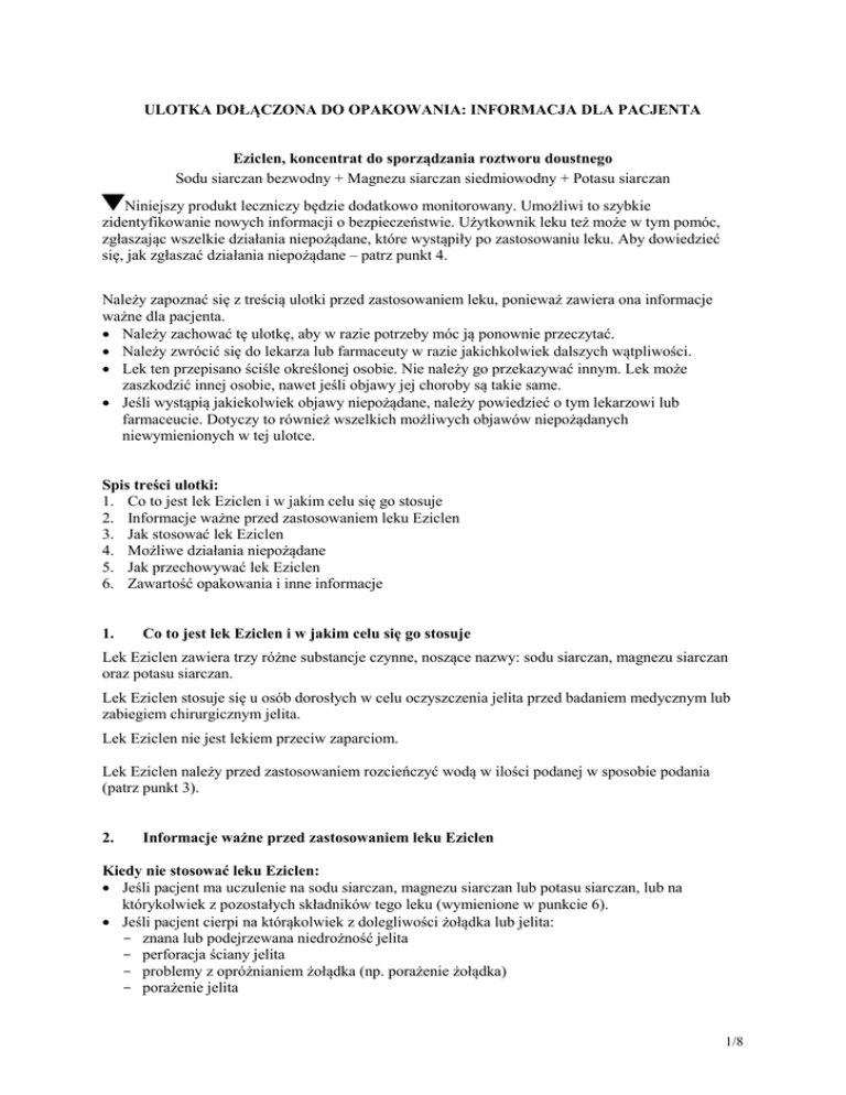 ULOTKA DOŁĄCZONA DO OPAKOWANIA: INFORMACJA DLA PACJENTA Eziclen, koncentrat do sporządzania roztworu doustnego Sodu siarczan bezwodny + Magnezu siarczan siedmiowodny + Potasu siarczan Niniejszy produkt leczniczy będzie dodatkowo monitorowany. Umożliwi to szybkie zidentyfikowanie nowych informacji o bezpieczeństwie. Użytkownik leku też może w tym pomóc, zgłaszając wszelkie działania niepożądane, które wystąpiły po zastosowaniu leku. Aby dowiedzieć się, jak zgłaszać działania niepożądane – patrz punkt 4. Należy zapoznać się z treścią ulotki przed zastosowaniem leku, ponieważ zawiera ona informacje ważne dla pacjenta. • Należy zachować tę ulotkę, aby w razie potrzeby móc ją ponownie przeczytać. • Należy zwrócić się do lekarza lub farmaceuty w razie jakichkolwiek dalszych wątpliwości. • Lek ten przepisano ściśle określonej osobie. Nie należy go przekazywać innym. Lek może zaszkodzić innej osobie, nawet jeśli objawy jej choroby są takie same. • Jeśli wystąpią jakiekolwiek objawy niepożądane, należy powiedzieć o tym lekarzowi lub farmaceucie. Dotyczy to również wszelkich możliwych objawów niepożądanych niewymienionych w tej ulotce. Spis treści ulotki: 1. Co to jest lek Eziclen i w jakim celu się go stosuje 2. Informacje ważne przed zastosowaniem leku Eziclen 3. Jak stosować lek Eziclen 4. Możliwe działania niepożądane 5. Jak przechowywać lek Eziclen 6. Zawartość opakowania i inne informacje 1. Co to jest lek Eziclen i w jakim celu się go stosuje Lek Eziclen zawiera trzy różne substancje czynne, noszące nazwy: sodu siarczan, magnezu siarczan oraz potasu siarczan. Lek Eziclen stosuje się u osób dorosłych w celu oczyszczenia jelita przed badaniem medycznym lub zabiegiem chirurgicznym jelita. Lek Eziclen nie jest lekiem przeciw zaparciom. Lek Eziclen należy przed zastosowaniem rozcieńczyć wodą w ilości podanej w sposobie podania (patrz punkt 3). 2. Informacje ważne przed zastosowaniem leku Eziclen Kiedy nie stosować leku Eziclen: • Jeśli pacjent ma uczulenie na sodu siarczan, magnezu siarczan lub potasu siarczan, lub na którykolwiek z pozostałych składników tego leku (wymienione w punkcie 6). • Jeśli pacjent cierpi na którąkolwiek z dolegliwości żołądka lub jelita: - znana lub podejrzewana niedrożność jelita - perforacja ściany jelita - problemy z opróżnianiem żołądka (np. porażenie żołądka) - porażenie jelita 1/8 • • • • • - toksyczne zapalenie jelita grubego lub zespół toksycznego rozszerzenia okrężnicy - obfite wymioty Jeśli pacjent jest ciężko odwodniony Jeśli pacjent cierpi na ciężką chorobę serca (zastoinowa niewydolność krążenia) Jeśli pacjent ma wodobrzusze Jeśli pacjent cierpi na ciężką chorobę nerek (ciężka niewydolność nerek) Jeśli pacjent cierpi na czynną chorobę zapalną jelita (np. choroba Crohna, wrzodziejące zapalenie jelita grubego) W przypadku wątpliwości należy zwrócić się do lekarza prowadzącego przed zastosowaniem leku Eziclen. Ostrzeżenia i środki ostrożności Przed rozpoczęciem stosowania leku Eziclen należy zwrócić się do lekarza, jeśli: • Pacjent jest odwodniony (objawy mogą obejmować suchość w ustach, uczucie pragnienia, bóle głowy, zawroty głowy, oddawanie moczu rzadziej niż zwykle, skrajne zmęczenie, kołatania serca oraz splątanie) • Kiedykolwiek występowały nieprawidłowe stężenia sodu lub potasu we krwi. • Występuje choroba serca Lek Eziclen może wpływać na rytm pracy serca ze względu na zmianę stężenia soli we krwi. Może zaistnieć konieczność monitorowania pacjenta w czasie leczenia • Występuje choroba nerek • Występuje choroba wątroby • Występuje problem z „kwasem moczowym” (dna lub inna choroba) • Występują problemy z połykaniem • Występuje „refluks”, gdy kwas z żołądka ulega zarzuceniu do przełyku • Pacjent jest fizycznie wątły lub słabego zdrowia • Występuje ograniczenie pracy części lub całego jelita (osłabiona perystaltyka) • W wywiadzie stwierdzono stany zdrowotne lub zabiegi chirurgiczne na przewodzie pokarmowym, predysponujące do osłabienia perystaltyki przewodu pokarmowego. Jeżeli pacjent jest osłabiony lub w podeszłym wieku (w wieku 65 lat lub więcej), cierpi na ciężką chorobę nerek, wątroby lub serca lub jeżeli występuje ryzyko zmian poziomu soli w organizmie (zaburzenia elektrolitowe) lekarz może zalecić szczególną obserwację pacjenta przed oraz po badaniu lub zabiegu. Pacjent powinien zwrócić szczególną uwagę na zalecenia wymienione w tej części ulotki jak również w części „Inne leki i lek Eziclen” oraz „Jak stosować lek Eziclen”. Jeżeli u pacjenta występują ciężkie wymioty lub odczuwa objawy odwodnienia (np. suchość w ustach, uczucie pragnienia) po przyjęciu tego leku, należy powiadomić lekarza, który zaleci zastosowanie środków nawadniających. Jeśli którykolwiek z powyższych punktów dotyczy pacjenta (lub w przypadku braku pewności), przed zastosowaniem leku Eziclen należy zwrócić się do lekarza prowadzącego. Po przyjęciu leku występować będzie częste oddawanie luźnych stolców. Jest to normalne i wskazuje na skuteczne działanie leku. Należy przebywać w okolicy toalety do czasu ustąpienia działania leku. Należy ściśle przestrzegać zaleceń i przyjmować tyle wody lub czystych płynów, ile potrzeba, aby nie ulec odwodnieniu. Dzieci i młodzież Lek Eziclen nie jest przeznaczony do stosowania u pacjentów w wieku poniżej 18 lat. Nie określono bezpieczeństwa i skuteczności tego leku w tej grupie pacjentów. 2/8 Inne leki i lek Eziclen Należy powiedzieć lekarzowi lub farmaceucie o wszystkich lekach stosowanych obecnie lub ostatnio, a także o lekach, które pacjent planuje przyjmować. Dotyczy to również leków dostępnych bez recepty oraz preparatów ziołowych. Jeśli pacjent przyjmuje jakiekolwiek inne leki, 