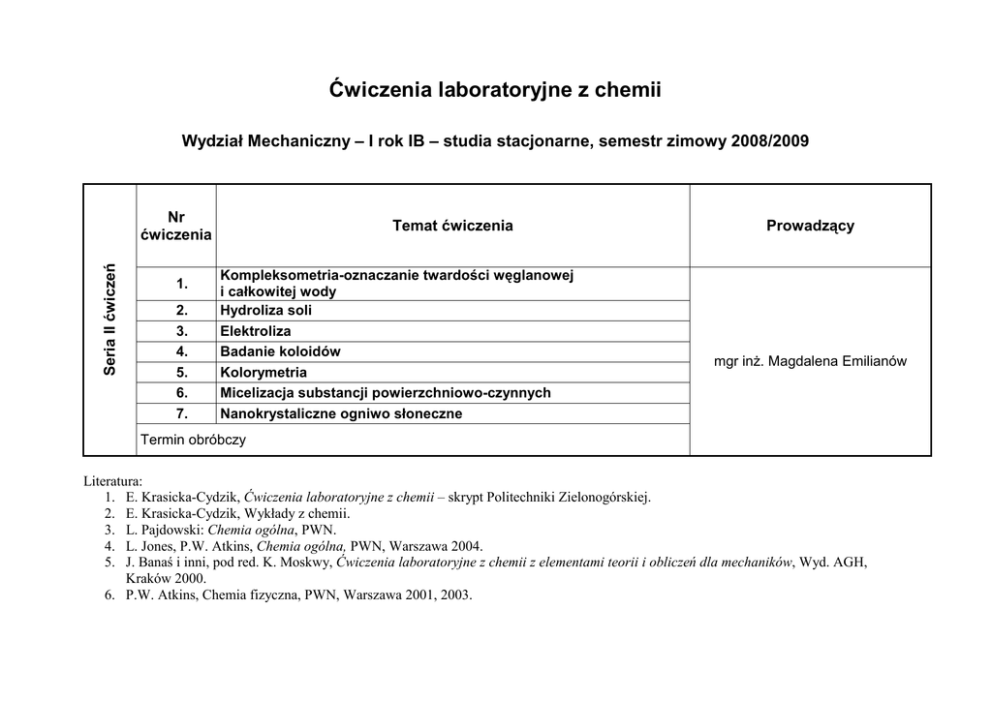 Ćwiczenia laboratoryjne z chemii Wydział Mechaniczny – I rok IB – studia stacjonarne, semestr zimowy 2008/2009 Seria II ćwiczeń Nr ćwiczenia 1. 2. 3. 4. 5. 6. 7. Temat ćwiczenia Kompleksometria-oznaczanie twardości węglanowej i całkowitej wody Hydroliza soli Elektroliza Badanie koloidów Kolorymetria Micelizacja substancji powierzchniowo-czynnych Nanokrystaliczne ogniwo słoneczne Prowadzący mgr inż. Magdalena Emilianów Termin obróbczy Literatura: 1. E. Krasicka-Cydzik, Ćwiczenia laboratoryjne z chemii – skrypt Politechniki Zielonogórskiej. 2. E. Krasicka-Cydzik, Wykłady z chemii. 3. L. Pajdowski: Chemia ogólna, PWN. 4. L. Jones, P.W. Atkins, Chemia ogólna, PWN, Warszawa 2004. 5. J. Banaś i inni, pod red. K. Moskwy, Ćwiczenia laboratoryjne z chemii z elementami teorii i obliczeń dla mechaników, Wyd. AGH, Kraków 2000. 6. P.W. Atkins, Chemia fizyczna, PWN, Warszawa 2001, 2003.