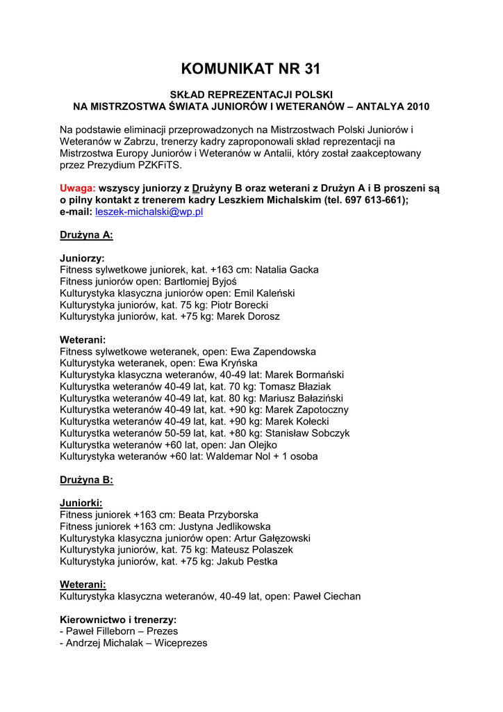 KOMUNIKAT NR 31 SKŁAD REPREZENTACJI POLSKI NA MISTRZOSTWA ŚWIATA JUNIORÓW I WETERANÓW – ANTALYA 2010 Na podstawie eliminacji przeprowadzonych na Mistrzostwach Polski Juniorów i Weteranów w Zabrzu, trenerzy kadry zaproponowali skład reprezentacji na Mistrzostwa Europy Juniorów i Weteranów w Antalii, który został zaakceptowany przez Prezydium PZKFiTS. Uwaga: wszyscy juniorzy z Drużyny B oraz weterani z Drużyn A i B proszeni są o pilny kontakt z trenerem kadry Leszkiem Michalskim (tel. 697 613-661); e-mail: [email protected] Drużyna A: Juniorzy: Fitness sylwetkowe juniorek, kat. +163 cm: Natalia Gacka Fitness juniorów open: Bartłomiej Byjoś Kulturystyka klasyczna juniorów open: Emil Kaleński Kulturystyka juniorów, kat. 75 kg: Piotr Borecki Kulturystyka juniorów, kat. +75 kg: Marek Dorosz Weterani: Fitness sylwetkowe weteranek, open: Ewa Zapendowska Kulturystyka weteranek, open: Ewa Kryńska Kulturystyka klasyczna weteranów, 40-49 lat: Marek Bormański Kulturystka weteranów 40-49 lat, kat. 70 kg: Tomasz Błaziak Kulturystka weteranów 40-49 lat, kat. 80 kg: Mariusz Bałaziński Kulturystka weteranów 40-49 lat, kat. +90 kg: Marek Zapotoczny Kulturystka weteranów 40-49 lat, kat. +90 kg: Marek Kołecki Kulturystka weteranów 50-59 lat, kat. +80 kg: Stanisław Sobczyk Kulturystka weteranów +60 lat, open: Jan Olejko Kulturystyka weteranów +60 lat: Waldemar Nol + 1 osoba Drużyna B: Juniorki: Fitness juniorek +163 cm: Beata Przyborska Fitness juniorek +163 cm: Justyna Jedlikowska Kulturystyka klasyczna juniorów open: Artur Gałęzowski Kulturystyka juniorów, kat. 75 kg: Mateusz Polaszek Kulturystyka juniorów, kat. +75 kg: Jakub Pestka Weterani: Kulturystyka klasyczna weteranów, 40-49 lat, open: Paweł Ciechan Kierownictwo i trenerzy: - Paweł Filleborn – Prezes - Andrzej Michalak – Wiceprezes - Leszek Michalski – Trener Koszty udziału juniorów z Drużyny A w całości pokrywa PZKFiTS. Weterani z Drużyny A sami pokrywają koszty swojego udziału. Wynoszą one: - wpisowe: 200 EUR - transport: lotnisko-hotel-lotnisko: 50 EUR - dodatkowy nocleg: 50 EUR - bilet lotniczy: koszt zostanie podany później (orientacyjnie 2000 zl) Trzeba być też przygotowanym na zwrotny depozyt hotelowy w wysokości 100 EUR. Juniorzy i weterani w Drużynie B pokrywają następujące koszty: - pakiet pobytowy i wpisowe: 400 EUR - bilet lotniczy: koszt zostanie podany później (orientacyjnie 2000 zl) - dodatkowy nocleg: 50 EUR - transport lokalny: 50 EUR - zwrotny depozyt hotelowy w wysokości 100 EUR. Informacje o przelotach zostaną podane w późniejszym terminie Skrócony program Mistrzostw: 10.12.2010 (piątek): - przyloty - 16:30 – Narada Techniczna - 18:00 – Weryfikacja 11.12.2010 (sobota): - 10:00 – Półfinały – część przedpołudniowa - 15:00 – Półfinały – część popołudniowa 12.12.2010 (niedziela): - 15:00 – Finały - 21:00 – Bankiet 13.12.2010 (poniedziałek): - Odloty mgr inż. Andrzej Michalak Wiceprezes PZKFiTS