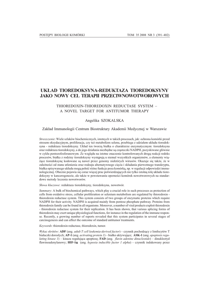 uk£ad tioredoksyna-reduktaza tioredoksyny jako nowy cel terapii
