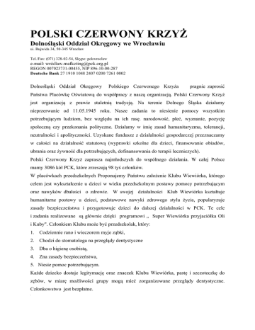 POLSKI CZERWONY KRZYŻ Dolnośląski Oddział Okręgowy we Wrocławiu ui. Bujwida 34, 50-345 Wrocław Tel./Fax: (071) 328-02-54, Skype: pckwroclaw e-mail: wróć[email protected] REGON 007023731-00455, NIP 896-10-00-287 Deutsche Bank 27 1910 1048 2407 0200 7261 0002 Dolnośląski Oddział Okręgowy Polskiego Czerwonego Krzyża pragnie zaprosić Państwa Placówkę Oświatową do współpracy z naszą organizacją. Polski Czerwony Krzyż jest organizacją z prawie stuletnią tradycją. Na terenie Dolnego Śląska działamy nieprzerwanie od 11.05.1945 roku. Nasze zadania to niesienie pomocy wszystkim potrzebującym ludziom, bez względu na ich rasę. narodowość, płeć, wyznanie, pozycję społeczną czy przekonania polityczne. Działamy w imię zasad humanitaryzmu, tolerancji, neutralności i apolityczności. Uzyskane fundusze z działalności gospodarczej przeznaczamy w całości na działalność statutową (wyprawki szkolne dla dzieci, finansowanie obiadów, ubrania oraz żywność dla potrzebujących, dofinansowania do terapii leczniczych). Polski Czerwony Krzyż zaprasza najmłodszych do wspólnego działania. W całej Polsce mamy 3086 kół PCK, które zrzeszają 98 tyś członków. W placówkach przedszkolnych Proponujemy Państwu założenie Klubu Wiewiórka, którego celem jest wykształcenie u dzieci w wieku przedszkolnym postawy pomocy potrzebującym oraz nawyków dbałości o zdrowie. W swojej działalności Klub Wiewiórka kształtuje humanitarne postawy u dzieci, podstawowe nawyki zdrowego stylu życia, popularyzuje zasady bezpieczeństwa i przygotowuje dzieci do dalszej działalności w PCK. Te cele i zadania realizowane są głównie dzięki programowi „ Super Wiewiórka przyjaciółka Oli i Kuby". Członkiem Klubu może być przedszkolak, który: 1. Codziennie rano i wieczorem myje ząbki, 2. Chodzi do stomatologa na przeglądy dentystyczne 3. Dba o higienę osobistą, 4. Zna zasady bezpieczeństwa, 5. Niesie pomoc potrzebującym. Każde dziecko dostaje legitymację oraz znaczek Klubu Wiewiórka, pastę i szczoteczkę do zębów, w miarę możliwości grupy mogą mieć zorganizowane przeglądy dentystyczne. Członkowstwo jest bezpłatne. \
