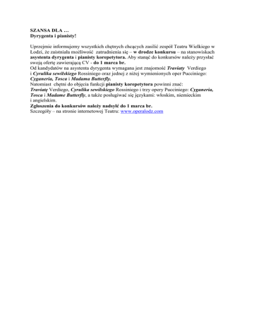 SZANSA DLA … Dyrygenta i pianisty! Uprzejmie informujemy wszystkich chętnych chcących zasilić zespół Teatru Wielkiego w Łodzi, że zaistniała możliwość zatrudnienia się – w drodze konkursu – na stanowiskach asystenta dyrygenta i pianisty korepetytora. Aby stanąć do konkursów należy przysłać swoją ofertę zawierającą CV - do 1 marca br. Od kandydatów na asystenta dyrygenta wymagana jest znajomość Traviaty Verdiego i Cyrulika sewilskiego Rossiniego oraz jednej z niżej wymienionych oper Pucciniego: Cyganeria, Tosca i Madama Butterfly. Natomiast chętni do objęcia funkcji pianisty korepetytora powinni znać: Traviatę Verdiego, Cyrulika sewilskiego Rossiniego i trzy opery Pucciniego: Cyganeria, Tosca i Madame Butterfly, a także posługiwać się językami: włoskim, niemieckim i angielskim. Zgłoszenia do konkursów należy nadsyłć do 1 marca br. Szczegóły – na stronie internetowej Teatru: www.operalodz.com