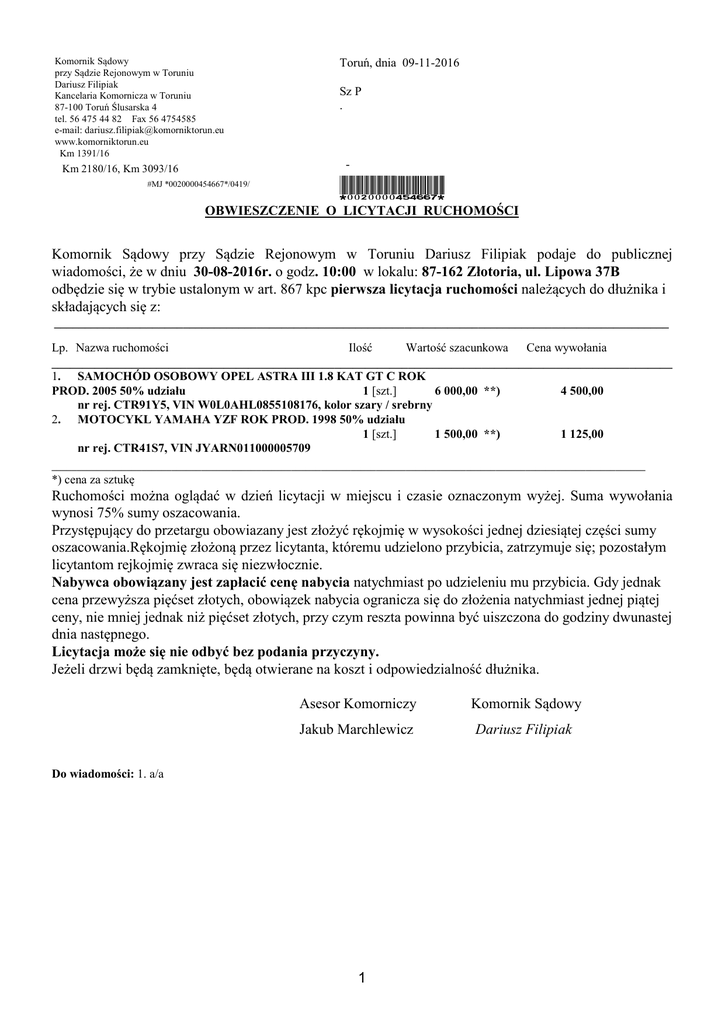 1 Komornik Sądowy przy Sądzie Rejonowym w