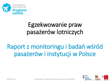 Egzekwowanie praw pasażerów lotniczych Raport z monitoringu i badań wśród pasażerów i instytucji w Polsce 2015-04-16 Konferencja "Prawa Pasażerów Lotniczych w Praktyce" System ochrony pasażerów w środkach transportu na terenie UE • Prawo do niedyskryminacji w dostępie do transportu • Prawo do mobilności: dostęp i pomoc pasażerom niepełnosprawnych oraz pasażerom o ograniczonej sprawności ruchowej bez dodatkowych kosztów • Prawo do informacji przed zakupem biletu oraz na różnych etapach podróży, w szczególności w przypadku jej zakłócenia • Prawo do rezygnacji z podróży (zwrot pełnego kosztu biletu), jeżeli nie odbywa się ona zgodnie z planem 2015-04-16 Konferencja "Prawa Pasażerów Lotniczych w Praktyce" System ochrony pasażerów w środkach transportu na terenie UE • Prawo do wykonania umowy transportowej w przypadku zakłócenia podróży (zmiana planu podróży i zmiana rezerwacji) • Prawo do uzyskania pomocy w przypadku dużego opóźnienia rozpoczęcia podróży lub w punktach przesiadkowych • Prawo do odszkodowania na określonych warunkach • Prawo do odpowiedzialności przewoźników w odniesieniu do pasażerów i ich bagażu 2015-04-16 Konferencja "Prawa Pasażerów Lotniczych w Praktyce" System ochrony pasażerów w środkach transportu na terenie UE • Prawo do szybko działającego i dostępnego systemu rozpatrywania skarg • Prawo do pełnego stosowania i skutecznego egzekwowania prawa UE • Prawo do bezpieczeństwa i ochrony, w tym zarówno bezpieczeństwa technicznego sprzętu transportowego i fizycznego bezpieczeństwa pasażerów • Prawo do minimalnych norm w zakresie jakości usługi, komfortu, ochrony środowiska i dostępności 2015-04-16 Konferencja "Prawa Pasażerów Lotniczych w Praktyce" System ochrony pasażerów w środkach transportu na terenie UE Jak działa system ochrony praw pasażerów lotniczych w praktyce? 2015-04-16 Konferencja "Prawa Pasażerów Lotniczych w Praktyce" Monitoring egzekwowania praw pasażerów lotniczych w Polsce • Analiza prawa i orzecznictwa sądowego • Badania ankietowe wśród grupy 500 pasażerów • Sprawy (reklamacje i skargi) zgłoszone przez pasażerów za pomocą systemu internetowego do ekspertów Stowarzyszenia Praw Pasażerów „Przyjazne Latanie” • Badania kwestionariuszowe wśród instytucji publicznych i prywatnych (grupa ponad 400 podmiotów) • Kwiecień 2014 – marzec 2015 2015-04-16 Konferencja "Prawa Pasażerów Lotniczych w Praktyce" Analiza prawa i orzecznictwa sądowego • Obowiązek informowania pasażerów o ich prawach przez przewoźnika • Nadzwyczajne okoliczności upoważniające do zwolnienia przewoźnika z odpowiedzialności • Usterka techniczna a odszkodowanie za naruszenie praw pasażera • Wysokość kar za naruszenie praw pasażerów • Spór kompetencyjny sądów i instytucji oraz różna praktyka orzecznicza • Naprzemienność drogi postępowania: przed sądami powszechnymi lub przed Prezesem Urzędu Lotnictwa Cywilnego 2015-04-16 Konferencja "Prawa Pasażerów Lotniczych w Praktyce" Badanie wśród 500 pasażerów • Miejsce: pociągi Szybkiej Kolei Miejskiej (SKM) na trasie Warszawa Centralna/Śródmieście-Warszawa Lotnisko Chopina oraz teren Portu Lotniczego „Katowice-Pyrzowice” • Termin: lipiec – sierpień 2014 • 26% respondentów podróżuje rzadko, tj. raz w roku lub rzadziej • 51% respondentów podróżuje okazjonalnie, tj. kilka razy w roku • 23% respondentów podróżuje często, tj. kilka razy w miesiącu 2015-04-16 Konferencja "Prawa Pasażerów Lotniczych w Praktyce" Rodzaje zakłóceń podróży, których doświadczyli respondenci • 62% - opóźnienie lotu • 30% - problemy z bagażem • 18% - odwołanie lotu • 17% - niezadowalający poziom obsługi podczas lotu, w tym jakość posiłków • 17% - niezadowalający poziom obsługi podczas kontroli bezpieczeństwa • 17% - brak informacji i opieki na lotnisku 2015-04-16 Konferencja "Prawa Pasażerów Lotniczych w Praktyce" Reklamacje pasażerskie i spory z przewoźnikami • 16% respondentów dochodziło swoich praw • 80% respondentów nie składało reklamacji • Czasochłonność procesu - 64% • Nieznajomość praw - 37% • Brak wiedzy nt możliwości składania reklamacji – 34% • 72% respondentów preferuje polubowne rozwiązanie sporu • 7% respondentów zwracała się do instytucji o pomoc 2015-04-16 Konferencja "Prawa Pasażerów Lotniczych w Praktyce" Reklamacje i skargi pasażerskie skierowane do Przyjaznego Latania Internetowy system zgłaszania spraw do monitoringu 2015-04-16 Konferencja "Prawa Pasażerów Lotniczych w Praktyce" Reklamacje i skargi pasażerskie skierowane do Przyjaznego Latania • • • • • • • Sprawy dotyczyły 16 przewoźników lotniczych 80% spraw: opóźniony, odwołany lot, zniszczony bagaż 38% linii nie odpowiedziało na reklamacje 19% linii nie przyjęło reklamacji w języku polskim 19% linii odsyłało pasażerów do formularzy Odpowiedź na reklamacje w ciągu 1-3 tygodni Częste naruszenie prawa do informacji i/lub opieki podczas zakłócenia w podróży lotniczej • Nadzwyczajne okoliczności - najczęstszy powód odmowy uznania reklamacji i wypłaty odszkodowania • 25% przewoźników wyraziło gotowość zaoferowania formy zadośćuczynienia „w geście dobrej woli” celem osiągnięcia porozumienia z pasażerem 2015-04-16 Konferencja "Prawa Pasażerów Lotniczych w Praktyce" Badania wśród instytucji udzielających pomocy pasażerom • Urząd Ochrony Konkurencji i Konsumentów (UOKiK) • Komisja Ochrony Praw Pasażerów / Urząd Lotnictwa Cywilnego (ULC) • Europejskie Centrum Konsumenckie (ECK) • Wojewódzkie i terenowe inspekcje handlowe • Miejscy i powiatowi rzecznicy praw konsumenta • Organizacje konsumenckie • Przewoźnicy lotniczy • Porty lotnicze • Biura podróży • Firmy odszkodowawcze i kancelarie prawne 2015-04-16 Konferencja "Prawa Pasażerów Lotn