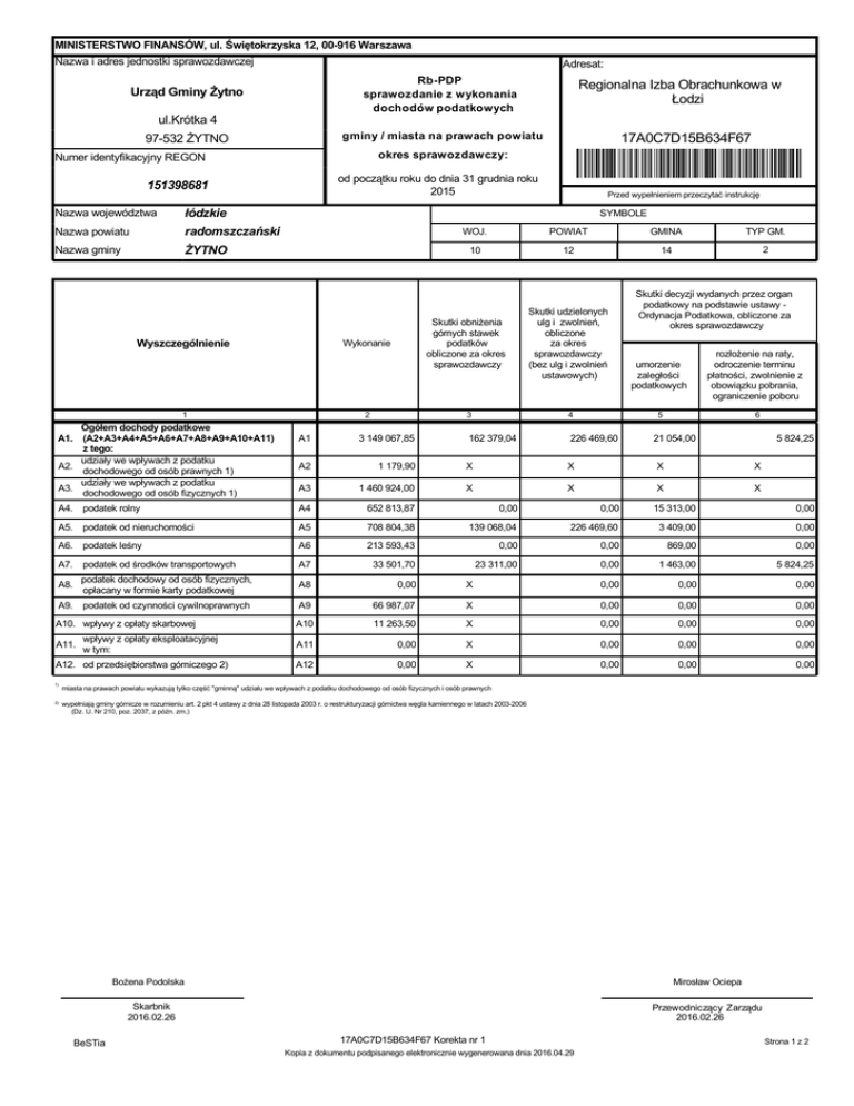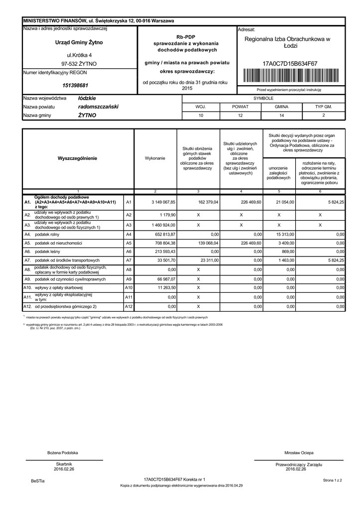 MINISTERSTWO FINANSÓW, ul. Świętokrzyska 12, 00-916 Warszawa Nazwa i adres jednostki sprawozdawczej Rb-PDP spraw ozdanie z w ykonania dochodów podatkow ych Urząd Gminy Żytno ul.Krótka 4 od początku roku do dnia 31 grudnia roku 2015 151398681 łódzkie Nazwa gminy ŻYTNO radomszczański 1 2 podatek rolny A6. podatek leśny A7. A8. A9. podatek od nieruchomości podatek od środków transportowych podatek dochodowy od osób fizycznych, opłacany w formie karty podatkowej podatek od czynności cywilnoprawnych Skutki obniżenia górnych stawek podatków obliczone za okres sprawozdawczy TYP GM. 2 14 Skutki udzielonych ulg i zwolnień, obliczone za okres sprawozdawczy (bez ulg i zwolnień ustawowych) 3 4 162 379,04 226 469,60 Skutki decyzji wydanych przez organ podatkowy na podstawie ustawy Ordynacja Podatkowa, obliczone za okres sprawozdawczy umorzenie zaległości podatkowych 5 rozłożenie na raty, odroczenie terminu płatności, zwolnienie z obowiązku pobrania, ograniczenie poboru 6 A2 1 179,90 X X X X A3 1 460 924,00 X X X X A5 708 804,38 A4 A6 A7 A8 652 813,87 213 593,43 33 501,70 A12 0,00 0,00 869,00 1 463,00 5 824,25 0,00 0,00 0,00 X X X 0,00 0,00 0,00 0,00 3 409,00 0,00 0,00 X 0,00 15 313,00 23 311,00 0,00 11 263,50 A11 0,00 5 824,25 226 469,60 X 66 987,07 0,00 21 054,00 139 068,04 0,00 A9 A12. od przedsiębiorstwa górniczego 2) 2) 12 GMINA 3 149 067,85 A10 1) SYMBOLE A1 A10. wpływy z opłaty skarbowej wpływy z opłaty eksploatacyjnej A11. w tym: Przed wypełnieniem przeczytać instrukcję POWIAT 10 Wykonanie A4. A5. WOJ. Wyszczególnienie Ogółem dochody podatkowe A1. (A2+A3+A4+A5+A6+A7+A8+A9+A10+A11) z tego: udziały we wpływach z podatku A2. dochodowego od osób prawnych 1) udziały we wpływach z podatku A3. dochodowego od osób fizycznych 1) 17A0C7D15B634F67 okres spraw ozdaw czy: Numer identyfikacyjny REGON Nazwa powiatu Regionalna Izba Obrachunkowa w Łodzi gminy / miasta na praw ach pow iatu 97-532 ŻYTNO Nazwa województwa Adresat: 0,00 0,00 0,00 0,00 0,00 0,00 0,00 0,00 0,00 0,00 miasta na prawach powiatu wykazują tylko część "gminną" udziału we wpływach z podatku dochodowego od osób fizycznych i osób prawnych wypełniają gminy górnicze w rozumieniu art. 2 pkt 4 ustawy z dnia 28 listopada 2003 r. o restrukturyzacji górnictwa węgla kamiennego w latach 2003-2006 (Dz. U. Nr 210, poz. 2037, z późn. zm.) Bożena Podolska Mirosław Ociepa Skarbnik 2016.02.26 BeSTia Przewodniczący Zarządu 2016.02.26 17A0C7D15B634F67 Korekta nr 1 Kopia z dokumentu podpisanego elektronicznie wygenerowana dnia 2016.04.29 Strona 1 z 2 UZASADNIENIE KOREKTY nieterminowe przekazanie sprawozdań Ministerstwa Finansów oraz Urzędów Skarbowych Bożena Podolska Mirosław Ociepa 2016.02.26 Przewodniczący Zarządu 2016.02.26 Skarbnik BeSTia 17A0C7D15B634F67 Korekta nr 1 Kopia z dokumentu podpisanego elektronicznie wygenerowana dnia 2016.04.29 Strona 2 z 2