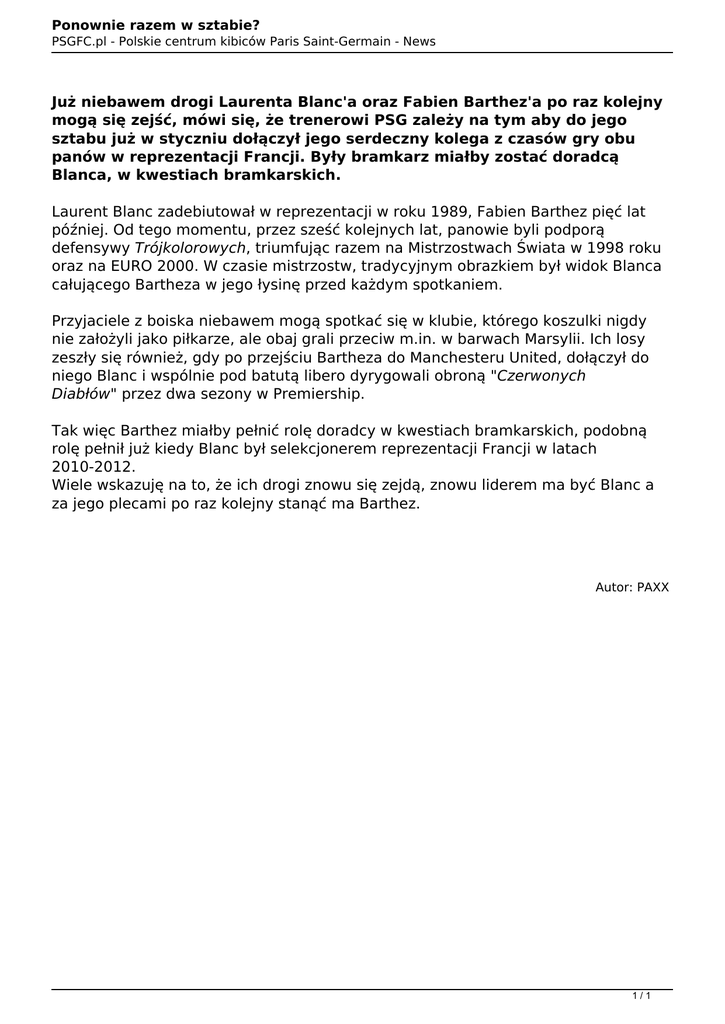 Ponownie razem w sztabie? PSGFC.pl - Polskie centrum kibiców Paris Saint-Germain - News Już niebawem drogi Laurenta Blanc'a oraz Fabien Barthez'a po raz kolejny mogą się zejść, mówi się, że trenerowi PSG zależy na tym aby do jego sztabu już w styczniu dołączył jego serdeczny kolega z czasów gry obu panów w reprezentacji Francji. Były bramkarz miałby zostać doradcą Blanca, w kwestiach bramkarskich. Laurent Blanc zadebiutował w reprezentacji w roku 1989, Fabien Barthez pięć lat później. Od tego momentu, przez sześć kolejnych lat, panowie byli podporą defensywy Trójkolorowych, triumfując razem na Mistrzostwach Świata w 1998 roku oraz na EURO 2000. W czasie mistrzostw, tradycyjnym obrazkiem był widok Blanca całującego Bartheza w jego łysinę przed każdym spotkaniem. Przyjaciele z boiska niebawem mogą spotkać się w klubie, którego koszulki nigdy nie założyli jako piłkarze, ale obaj grali przeciw m.in. w barwach Marsylii. Ich losy zeszły się również, gdy po przejściu Bartheza do Manchesteru United, dołączył do niego Blanc i wspólnie pod batutą libero dyrygowali obroną "Czerwonych Diabłów" przez dwa sezony w Premiership. Tak więc Barthez miałby pełnić rolę doradcy w kwestiach bramkarskich, podobną rolę pełnił już kiedy Blanc był selekcjonerem reprezentacji Francji w latach 2010-2012. Wiele wskazuję na to, że ich drogi znowu się zejdą, znowu liderem ma być Blanc a za jego plecami po raz kolejny stanąć ma Barthez. Autor: PAXX 1/1 Powered by TCPDF (www.tcpdf.org)