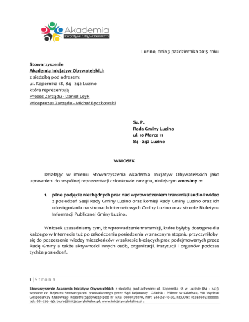 Luzino, dnia 3 października 2015 roku Stowarzyszenie Akademia Inicjatyw Obywatelskich z siedzibą pod adresem: ul. Kopernika 18, 84 - 242 Luzino które reprezentują Prezes Zarządu - Daniel Leyk Wiceprezes Zarządu - Michał Byczkowski Sz. P. Rada Gminy Luzino ul. 10 Marca 11 84 - 242 Luzino WNIOSEK Działając w imieniu Stowarzyszenia Akademia Inicjatyw Obywatelskich jako uprawnieni do wspólnej reprezentacji członkowie zarządu, niniejszym wnosimy o: 1. pilne podjęcie niezbędnych prac nad wprowadzeniem transmisji audio i wideo z posiedzeń Sesji Rady Gminy Luzino oraz komisji Rady Gminy Luzino oraz ich udostępniania na stronach internetowych Gminy Luzino oraz stronie Biuletynu Informacji Publicznej Gminy Luzino. Wniosek uzasadniamy tym, iż wprowadzenie transmisji, które byłyby dostępne dla każdego w Internecie tuż po zakończeniu posiedzenia w znacznym stopniu przyczyniłoby się do poszerzenia wiedzy mieszkańców w zakresie bieżących prac podejmowanych przez Radę Gminy a także aktywności innych osób, organizacji, instytucji i organów podczas tychże posiedzeń. 1|Strona Stowarzyszenie Akademia Inicjatyw Obywatelskich z siedzibą pod adresem: ul. Kopernika 18 w Luzinie (84 - 242), wpisane do Rejestru Stowarzyszeń prowadzonego przez Sąd Rejonowy Gdańsk - Północ w Gdańsku, VIII Wydział Gospodarczy Krajowego Rejestru Sądowego pod nr KRS: 0000572070, NIP: 588-241-10-20, REGON: 36230605200000, tel.: 881-229-196, [email protected], www.inicjatywylokalne.pl . Oczywistym bowiem jest, o czym Szanowni Radni z pewnością wiedzą, że znakomita większość mieszkańców z czysto obiektywnych powodów, np. z uwagi na obowiązki zawodowe czy rodzinne, wiek, stan zdrowia lub brak czasu spowodowany innymi okolicznościami, nie ma możliwości uczestniczenia w posiedzeniach Rady Gminy, a co za tym idzie, bieżącego śledzenia prac tegoż organu i obiektywnej oceny podejmowanych przez niego działań. Oczywistym jest także to, o czym Szanowni Radni z pewnością także wiedzą, że tego stanu rzeczy nie zmienia publikacja protokołów z posiedzeń Rady Gminy, które ograniczają się jedynie do ogólnych stwierdzeń i wniosków osób biorących udział w posiedzeniach oraz obligatoryjnych sformułowań używanych przez prowadzącego posiedzenia, które w konsekwencji niejednokrotnie niewiele mają wspólnego z rzeczywistym przebiegiem posiedzenia. Powyższe powoduje, iż czytelnik protokołu najzwyczajniej odczytuje wyrywkowy przebieg wydarzeń co oczywiście wpływa na to, że jego wiedza o przebiegu posiedzenia jest nie tyle znikoma ale obarczona poważnym błędem. Powyższe powoduje, że mieszkańcy nie mają dostatecznej wiedzy na temat rzeczywistego przebiegu prac w Radzie Gminy, zarówno organu jako takiego ale także poszczególnych radnych. Wprowadzenie transmisji i ich publikacja w Internecie z pewnością wpłynie na poprawę tychże negatywnych konsekwencji, a ponadto w sposób oczywisty wpłynie na jakość prowadzonych posiedzeń, w tym na wartość merytoryczną wypowiedzi i przygotowanie do posiedzeń, a w dalszej kolejności przygotowanie do pracy na rzecz lokalnego samorządu poszczególnych radnych i innych osób uczestniczących w pracach Rady. Mając powyższe na względzie wniosek należy uznać za konieczny i w pełni uzasadniony. Uprzejmie prosimy o bieżące informowanie Stowarzyszenia o postępach w przedmiocie załatwienia niniejszego wniosku a także o wszystkich podejmowanych działaniach w sprawie zmian w obecnie obowiązujących przepisach dotyczących tychże kwestii. 2|Strona Stowarzyszenie Akademia Inicjatyw Obywatelskich z siedzibą pod adresem: ul. Kopernika 18 w Luzinie (84 - 242), wpisane do Rejestru Stowarzyszeń prowadzonego przez Sąd Rejonowy Gdańsk - Północ w Gdańsku, VIII Wydział Gospodarczy Krajowego Rejestru Sądowego pod nr KRS: 0000572070, NIP: 588-241-10-20, REGON: 36230605200000, tel.: 881-229-196, [email protected], www.inicjatywylokalne.pl . Z poważaniem, Daniel Leyk Prezes Zarządu Michał Byczkowski Wiceprezes Zarządu W załączeniu: 1. wydruk z KRS. 3|Strona Stowarzyszenie Akademia Inicjatyw Obywatelskich z siedzibą pod adresem: ul. Kopernika 18 w Luzinie (84 - 242), wpisane do Rejestru Stowarzyszeń prowadzonego przez Sąd Rejonowy Gdańsk - Północ w Gdańsku, VIII Wydział Gospodarczy Krajowego Rejestru Sądowego pod nr KRS: 0000572070, NIP: 588-241-10-20, REGON: 36230605200000, tel.: 881-229-196, [email protected], www.inicjatywylokalne.pl .