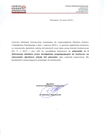 1 Dokumenty Komentarz CEA na podstawie załącznika nr 2 do rozporządzenia MiniL.p. stra Kultury i Dziedzictwa Narodowego w sprawie regulaminu konkursu na stanowisko dyrektora szkoły lub placówki oraz trybu pracy komisji konkursowej (Dz. U. z 2013 r. poz. 832 tj.) NAUCZYCIEL 1. 2. uzasadnienie przystąpienia do konkursu, postulowana objętość tekstu do 5 stron maszynopisu; koncepcja funkcjonowania i rozwoju szkoły lub placówki; kopia dowodu osobistego lub innego dokumentu potwierdzającego tożsamość oraz poświadczającego obywatelstwo kandydata, poświadczona przez kandydata „za zgodność z oryginałem”; 3. życiorys z opisem przebiegu pracy zawodowej; 4. dokumenty potwierdzające posiadanie wymaganego stażu pra- co najmniej pięcioletni staż pracy pedagogicznej na cy, określone w przepisach w sprawie wymagań, jakim powinna stanowisku nauczyciela lub pięcioletni staż pracy dyodpowiadać osoba zajmująca stanowisko dyrektora oraz inne daktycznej na stanowisku nauczyciela akademickiego; stanowisko kierownicze w poszczególnych typach publicznych szkół i rodzajach publicznych placówek (Dz. U. z 2009 r. Nr 184, poz. 1436), w oryginale lub poświadczone przez kandydata „za zgodność z oryginałem” kopie dokumentów; 2 5. dokumenty potwierdzające posiadanie wymaganego wykształcenia i kwalifikacji, określone w przepisach w sprawie wymagań, jakim powinna odpowiadać osoba zajmująca stanowisko dyrektora oraz inne stanowisko kierownicze w poszczególnych typach publicznych szkół i rodzajach publicznych placówek (Dz. U. z 2009 r. Nr 184, poz. 1436), w oryginale lub poświadczone przez kandydata „za zgodność z oryginałem” kopie dokumentów; 1. dyplom ukończenia studiów magisterskich oraz potwierdzenie posiadania przygotowania pedagogicznego (jeżeli nie wynika to z dyplomu), uprawniających do zajmowania stanowiska nauczyciela w danej szkole; Patrz: rozporządzenie Ministra Kultury z dnia 20 maja 2014 r. w sprawie szczegółowych kwalifikacji wymaganych od nauczycieli szkół artystycznych, placówek kształcenia artystycznego i placówek doskonalenia nauczycieli (Dz. U. z 2014 r. poz. 784) w przypadku kandydata na stanowisko dyrektora placówki (bursy): a) dyplom ukończenia studiów magisterskich na kierunku pedagogika w specjalności odpowiadającej rodzajowi prowadzonych zajęć lub b) dyplom ukończenia studiów pierwszego stopnia lub studiów wyższych zawodowych na kierunku pedagogika w specjalności odpowiadającej rodzajowi prowadzonych zajęć c) dyplom ukończenia zakładu kształcenia nauczycieli w specjalności odpowiadającej rodzajowi prowadzonych zajęć lub w innej specjalności oraz potwierdzenie ukończenia kurs kwalifikacyjny w zakresie rodzaju prowadzonych zajęć oraz potwierdzenie posiadania przygotowania pedagogicznego --------------------------------------------------------------2. dyplom ukończenia studiów wyższych lub studiów podyplomowych z zakresu zarządzania albo świadectwo ukończenia kursu kwalifikacyjnego z zakresu zarządzania oświatą, prowadzonego zgodnie z przepisami w sprawie placówek doskonalenia nauczycieli; 3 6. akt nadania stopnia nauczyciela mianowanego lub dyplomowanego, w oryginale lub poświadczona przez kandydata „za zgodność z oryginałem” kopia dokumentu; 7. karta oceny pracy lub oceny dorobku zawodowego - w przypadku nauczycieli i nauczycieli akademickich, w oryginale lub poświadczona przez kandydata „za zgodność z oryginałem” kopia dokumentu; 8. 9. ocenę pracy, co najmniej dobrą, uzyskaną w okresie ostatnich pięciu lat pracy lub pozytywną ocenę dorobku zawodowego w okresie ostatniego roku albo pozytywną ocenę pracy w okresie ostatnich czterech lat pracy w szkole wyższej – w przypadku nauczyciela akademickiego o której mowa w § 1 pkt 4 rozporządzenia Ministra Edukacji Narodowej z dnia 27 października 2009 r. w sprawie wymagań, jakim powinna odpowiadać osoba zajmująca stanowisko dyrektora oraz inne stanowisko kierownicze w poszczególnych typach publicznych szkół i rodzajach publicznych placówek (Dz. U. z 2009 r. Nr 184, poz. 1436); zaświadczenie lekarskie o braku przeciwwskazań zdrowotnych wskazanie w rozporządzeniu kwalifikacji lekarza wydajądo wykonywania pracy na stanowisku kierowniczym; cego zaświadczenie o braku przeciwwskazań zdrowotnych do wykonywania pracy na stanowisku kierowniczym przekraczałoby zakres upoważnienia ustawowego. Kwalifikacje określa § 7 rozporządzenia Ministra Zdrowia i Opieki Społecznej z dnia 30 maja 1996 r. w sprawie przeprowadzenia badań lekarskich pracowników, zakresu profilaktycznej opieki zdrowotnej nad pracownikami oraz orzeczeń lekarskich wydawanych do celów przewidzianych w Kodeksie pracy (Dz. U. z 1996 r. Nr 69, poz. 332 z późn. zm.) czyniąc uprawnionymi do wydawania ww. zaświadczenia wszystkich lekarzy uprawnionych do wykonywania badań profilaktycznych (powyższa uwaga znajduje się w Ocenie skutków regulacji do projektu rozporządzenia MEN w sprawie wymagań, jakim powinna odpowiadać osoba zajmująca stanowisko dyrektora oraz inne stanowisko kierownicze w poszczególnych typach publicznych szkół i rodzajach publicznych placówek); oświadczenie, że przeciwko kandydatowi nie toczy się postępowanie o przestępstwo ścigane z oskarżenia publicznego lub postępowanie dyscyplinarne; 4 10. oświadczenie, że kandydat nie był skazany prawomocnym wy11. 12. 13. 14. rokiem za umyślne przestępstwo lub umyślne przestępstwo skarbowe; oświadczenie, że kandydat nie był karany karą dyscyplinarną, o której mowa w art. 76 ust. 1 ustawy z dnia 26 stycznia 1982 r. - Karta Nauczyciela (Dz. U. z 2006 r. Nr 97, poz. 674, z późn. zm.) lub w art. 140 ust. 1 ustawy z dnia 27 lipca 2005 r. - Prawo o szkolnictwie wyższym (Dz. U. z 2012 r. poz. 572, z późn. zm.) - w przypadku nauczyciela i nauczyciela akademickiego oświadczenie, że kandydat nie był karany zakazem pełnienia funkcji związanych z dysponowan