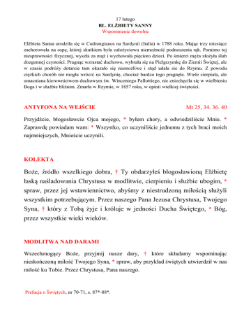 17 lutego BŁ. ELŻBIETY SANNY Wspomnienie dowolne Elżbieta Sanna urodziła się w Codrongianos na Sardynii (Italia) w 1788 roku. Mając trzy miesiące zachorowała na ospę, której skutkiem była całożyciowa niemożność podnoszenia rąk. Pomimo tej niesprawności fizycznej, wyszła za mąż i wychowała pięcioro dzieci. Po śmierci męża złożyła ślub dozgonnej czystości. Pragnąc wzrastać duchowo, wybrała się na Pielgrzymkę do Ziemii Świętej, ale w czasie podróży dotarcie tam okazało się niemożliwe i stąd udała sie do Rzymu. Z powodu ciężkich chorób nie mogła wrócić na Sardynię, chociaż bardzo tego pragnęła. Wiele cierpiała, ale umacniana kierownictwem duchowym św. Wincentego Pallottiego, nie zniechęciła się w wielbieniu Boga i w służbie bliźnim. Zmarła w Rzymie, w 1857 roku, w opinii wielkiej świętości. ANTYFONA NA WEJŚCIE Mt 25, 34. 36. 40 Przyjdźcie, błogosławcie Ojca mojego, * byłem chory, a odwiedziliście Mnie. * Zaprawdę powiadam wam: * Wszystko, co uczyniliście jednemu z tych braci moich najmniejszych, Mnieście uczynili. KOLEKTA Boże, źródło wszelkiego dobra, † Ty obdarzyłeś błogosławioną Elżbietę łaską naśladowania Chrystusa w modlitwie, cierpieniu i służbie ubogim, * spraw, przez jej wstawiennictwo, abyśmy z niestrudzoną miłością służyli wszystkim potrzebującym. Przez naszego Pana Jezusa Chrystusa, Twojego Syna, † który z Tobą żyje i króluje w jedności Ducha Świętego, * Bóg, przez wszystkie wieki wieków. MODLITWA NAD DARAMI Wszechmogący Boże, przyjmij nasze dary, † które składamy wspominając nieskończoną miłość Twojego Syna, * spraw, aby przykład świętych utwierdził w nas miłość ku Tobie. Przez Chrystusa, Pana naszego. Prefacja o Świętych, nr 70-71, s. 87*-88*. ANTYFONA NA KOMUNIĘ J 13, 35 Po tym wszyscy poznają, że jesteście moimi uczniami, * jeśli będziecie się wzajemnie miłowali. MODLITWA PO KOMUNII Boże, Ty na posiliłeś Najświętszym Sakramentem, † spraw, abyśmy naśladowali przykład błogosławionej Elżbiety, * która gorliwie czciła Ciebie i służyła Twojemu ludowi z ogromną miłością. Przez Chrystusa, Pana naszego. Kolekta własna zatwierdzona przez Kongregację Kultu Bożego i Dyscypliny Sakramentów dnia 17 stycznia 2017r. Prot. N. 631/16. Pozostałe teksty z formularza mszalnego wspólnego o świętych, którzy pełnili dzieła miłosierdzia MR s. 57’’-58’’. LITURGIA SŁOWA Czytanie z dnia lub z tekstów wspólnych o świętych LM t. VI. Czytanie pierwsze: Tb 12,6-13 LM t. VI, s. 195* albo 1 J 3,14-18 LM t. VI, s. 234*. Pslam responsoryjny: Ps 112(111), 1b-2.3-4.5-6.7-8.9 (R. por. 1b) LM t. VI s. 234*. Śpiew przed Ewangelią: Mt 5,3 LM, t. VI, s. 253*, 258*. Ewangelia: Mk 9,34-37 LM t. VI, s. 252* lub Mt 5,13-16 LM t. VI, s. 239* albo Łk 6,27-38 LM t. VI, s. 256* PIERWSZE CZYTANIE Tb 12, 6-13 Dobra jest szczera modlitwa z postem i miłosierdzie połączone ze sprawiedliwością Czytanie z Księgi Tobiasza Anioł powiedział do Tobiasza i jego syna: «Uwielbiajcie Boga i wysławiajcie Go przed wszystkimi żyjącymi za dobrodziejstwa, jakie wam wyświadczył, aby było uwielbione i wsławione Jego imię. Rozgłaszajcie wobec wszystkich ludzi słowa Boże, jak na to zasługują, i nie ociągajcie się z wyrażaniem Mu wdzięczności. Ukrywać tajemnice królewskie jest rzeczą piękną, ale godną pochwały jest ujawniać i wysławiać dzieła Boże. Czyńcie dobrze, a zło was nie spotka. Lepsza jest szczera modlitwa i miłosierdzie połączone ze sprawiedliwością aniżeli bogactwo pochodzące z nieprawości. Lepiej jest dawać jałmużnę aniżeli gromadzić złoto. Jałmużna uwalnia od śmierci i oczyszcza z wszelkiego grzechu. Ci, którzy dają jałmużnę, nasycą się życiem. Ci, którzy popełniają grzech i nieprawość, są wrogami własnej duszy. Odkryję przed wami całą prawdę, nie ukrywając niczego. Już was pouczyłem i powiedziałem: Piękną jest rzeczą zachowywać tajemnicę królewską, ale godną wszelkiej pochwały ujawniać dzieła Boże. A teraz: gdy ty i Sara modliliście się, ja przypomniałem wasze błagania przed majestatem Pańskim; tak samo, gdy chowałeś zmarłych. A kiedy nie wahałeś się wstawać i opuszczać swojego posiłku, i iść, by pochować zmarłego, ja zostałem posłany, aby cię wypróbować». Oto słowo Boże. Albo: PIERWSZE CZYTANIE 1 J 3, 14-18 Powinniśmy oddać życie za braci Czytanie z Pierwszego Listu Świętego Jana Apostoła Najmilsi: My wiemy, że przeszliśmy ze śmierci do życia, bo miłujemy braci, kto zaś nie miłuje, trwa w śmierci. Każdy, kto nienawidzi swego brata, jest zabójcą, a wiecie, że żaden zabójca nie nosi w sobie życia wiecznego. Po tym poznaliśmy miłość, że On oddał za nas życie swoje. My także winniśmy oddać życie za braci. Jeśliby ktoś posiadał na świecie majątek i widział, że brat jego cierpi niedostatek, a zamknął przed nim swe serce, jak może trwać w nim miłość Boga? Dzieci, nie miłujmy słowem i językiem, ale czynem i prawdą. Oto słowo Boże. PSALM RESPONSORYJNY Ps 112 (111), 1b-2. 3-4. 5-6. 7-8. 9 (R.: por. 1b) Refren: Błogosławiony ten, kto służy Panu. Błogosławiony człowiek, który służy Panu * i wielką radość znajduje w Jego przykazaniach. Potomstwo jego będzie potężne na ziemi, * dostąpi błogosławieństwa pokolenie prawych. Refren. Dobrobyt i bogactwo będą w jego domu, * a jego sprawiedliwość będzie trwała zawsze. On wschodzi w ciemnościach jak światło dla prawych, * łagodny, miłosierny i sprawiedliwy. Refren. Dobrze się wiedzie człowiekowi, który z litości pożycza * i swoimi sprawami zarządza uczciwie. Sprawiedliwy nigdy się nie zachwieje * i pozostanie w wiecznej pamięci. Refren. Nie przelęknie się złej nowiny, * jego mocne serce zaufało Panu. Jego wierne serce lękać się nie będzie * i spojrzy z wysoka na swych przeciwników. Refren. Rozdaje i obda