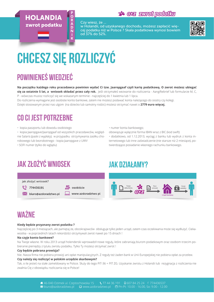 HOLANDIA zwrot podatku P O R A D N I K Czy wiesz, że ... w Holandii, od uzyskanego dochodu, możesz zapłacić więcej podatku niż w Polsce ? Skala podatkowa wynosi bowiem od 37% do 52%. Chcesz się rozliczyć POWINIENEŚ WIEDZIEĆ ę cz on ba str Zogą u dr Na początku każdego roku pracodawca powinien wydać Ci tzw. Jaaropgaaf czyli kartę podatkową. O zwrot możesz ubiegać się za ostatnie 5 lat, a wniosek składać przez cały rok. Jeśli otrzymałeś wezwanie do rozliczenia - Aangiftebrief lub formularze M, C, P - wówczas musisz rozliczyć się we wskazanym terminie - najczęściej do 1 kwietnia lub 1 lipca. Do rozliczenia wymagane jest osobiste konto bankowe, zatem nie możesz podawać konta należącego do siostry czy kolegi. Dzięki stosowanym przez nas ulgom (na dziecko lub samotny rodzic) możesz otrzymać nawet o 2779 euro więcej. cO CI JEST POTRZEBNE • kopia paszportu lub dowodu osobistego • kopia Jaaropgave/Jaaropgaaf od wszystkich pracodawców, względnie Salaris (paski z wypłaty); w przypadku otrzymywania zasiłku chorobowego lub bezrobotnego - kopia Jaaropgave z UWV • SOFI numer (tylko do wglądu) • numer konta bankowego; obowiązuje wyłącznie forma IBAN wraz z BIC (kod swift) • dodatkowo, od 1.12.2013, wyciąg z banku lub wydruk z konta internetowego lub inne zaświadczenie (nie starsze niż 2 miesiące), potwierdzające posiadanie własnego rachunku bankowego. Jak złożyć wniosek Jak działamy? òçÄ~ÅòI=à~ âáÉ=íç=éêçëíÉ= > WAŻNE Kiedy będzie przyznany zwrot podatku ? Najczęściej po 3 miesiącach, ale pamiętaj że, obcokrajowców obsługuje tylko jeden urząd, zatem czas oczekiwania może się wydłużyć. Ciekawostka - w poprzednich latach rekordziści otrzymywali zwrot nawet po 15 dniach ! Na czyje konto bankowe? Na Twoje własne. W roku 2013 urząd holenderski wprowadził nowe reguły, które zabraniają biurom podatkowym oraz osobom trzecim pobieranie pieniędzy z tytułu zwrotu podatku. Tylko Ty możesz otrzymać zwrot ! Czy będzie pobrana prowizja? Nie. Nasza firma nie pobiera prowizji ani opłat manipulacyjnych. Z reguły też żaden bank w Unii Europejskiej nie pobiera opłat za przelew. Czy należy się rozliczyć w polskim urzędzie skarbowym? Tak, o ile jesteś na stałe zameldowany w Polsce. Służy do tego PIT-36 + PIT ZG. Uzyskanie zwrotu z Holandii lub rezygnacja z rozliczenia nie zwalnia Cię z obowiązku rozliczania się w Polsce! 46-040 Ozimek ul. Częstochowska 15 77 44 36 191 607 84 25 24 f 774436537 [email protected] www.azdoradztwo.pl Pn-Pt: 10.00 - 16.00, So: 9.00 - 12.00 HOLANDIA zwrot podatku P O R A D N I K Czy wiesz, dlaczego w Holandii nie ma w oknach firanek ? Przejawem wojny religijnej między protestantami a katolikami był „podatek od firanek”. Król skutecznie obciążał nim katolików, którzy firanki wieszali. Skutkiem podatku jest tradycja nie wieszania zasłon w holenderskich domach . ROZLICZYŁEś SIĘ powinieneś wiedzieć Po wysłaniu wniosku, w różnych odstępach czasu otrzymasz z urzędu niebieskie koperty, a w nich istotne informacje lub formularze. Może być ich więcej niż wskazane trzy poniżej, dlatego nie lekceważ żadnej korespondencji. Zrób skan lub kopię i odeślij do nas. Dokumenty, które możesz otrzymać dr ę cz on ba str Zogą u Voorlopige (aanslag) - decyzja bevestiging rekeningnummer Decyzja o przyznaniu podatku. Sprawdź czy w zaznaczonym miejscu, kwota zwrotu (Te otvangen) jest zgodna z wyliczeniem. Voorlopige Aanslag (decyzja tymczasowa) po weryfikacji przechodzi w decyzję ostateczną - Aanslag. Potwierdzenie rachunku bankowego - służy do rejestracji konta. Sprawdź czy w zaznaczonym miejscu numer konta jest taki, jak podawałeś. Jeśli jest poprawny, na 2-giej stronie podpisz się i odeślij na adres podany w nagłówku. opgaaf rekeningnummer Potwierdzenie rachunku bankowego - tzw. zwrotka. Otrzymasz je wtedy, gdy urząd nie posiada Twojego konta. Wypełnij drugą stronę formularza podając dane banku, podpisz się i odeślij na adres podany w nagłówku. Przykładowe sytuacje 1) Otrzymałem za mały zwrot. Na reakcję (odwołanie) masz tylko 6 tygodni od daty wydanej decyzji ! Obowiązuje data widniejąca u góry Aanslag’u a nie data otrzymania samej decyzji. W tym czasie urząd musi otrzymać zażalenie – inaczej odrzuci wszelkie skargi czy inne pisma. 2) Dostałem Aanslag, ale nie mam pieniędzy na koncie. Pieniądze powinny wpłynąć na konto w okresie 1-6 tygodni. Jeśli po tym czasie nie otrzymałeś przelewu, zgłoś się do nas - sprawdzimy czy wszystko jest w porządku. Pamiętaj o Aanslagu - zrób skan lub kopię. 3) Nic nie otrzymałem z Holandii. Skontaktuj się z nami mailem lub telefoniczne - a my bezpłatnie napiszemy do urzędu pismo ponaglające. 4) Otrzymałem formularz M-biljet/P-biljet. Prawdopodobnie byłeś zameldowany w Holandii i obowiązuje Cię inny sposób rozliczenia. Wcześniejszy wniosek nie może zostać zrealizowany, dlatego dostarcz nam otrzymany formularz. Więcej INFORMACJI Jeśli chcesz uzyskać informacji na własną rękę, możesz skorzystać z infolinii Belastingdienst wybierając nr +31 55 5385385, od poniedziałku do czwartku w godz. 8.00 – 20.00 oraz w piątki w godz. 8.00-17.00. Rozmowy prowadzone są w jęz. niderlandzkim, niemieckim i angielskim. Możesz też poszukać informacji na www.azdoradztwo.pl, zapytać mailem [email protected] lub przez facebook.com/mojerozliczenie. 46-040 Ozimek ul. Częstochowska 15 77 44 36 191 607 84 25 24 f 774436537 [email protected] www.azdoradztwo.pl Pn-Pt: 10.00 - 16.00, So: 9.00 - 12.00