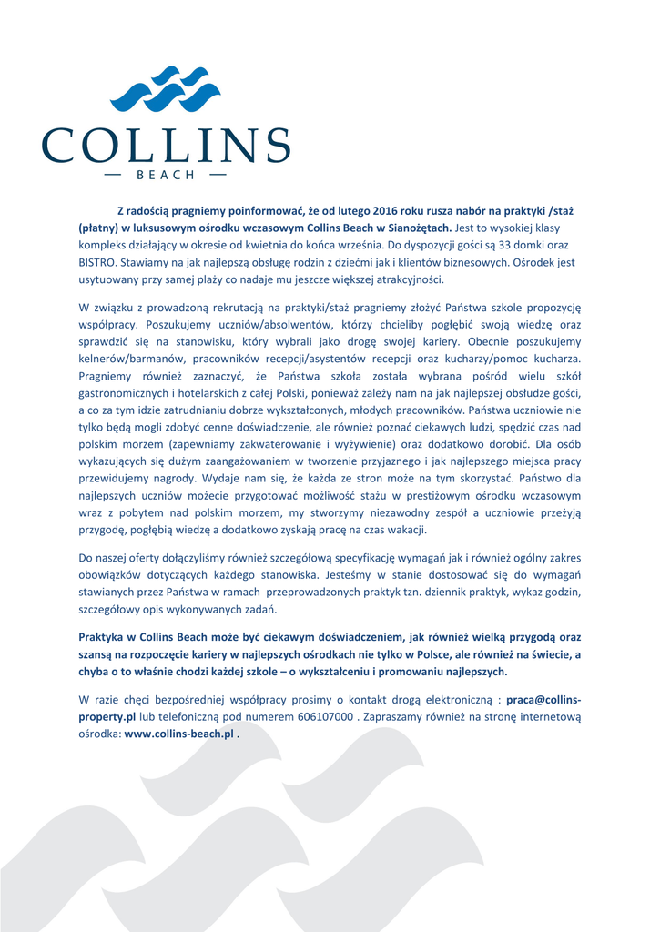 Z radością pragniemy poinformować, że od lutego 2016 roku rusza nabór na praktyki /staż (płatny) w luksusowym ośrodku wczasowym Collins Beach w Sianożętach. Jest to wysokiej klasy kompleks działający w okresie od kwietnia do końca września. Do dyspozycji gości są 33 domki oraz BISTRO. Stawiamy na jak najlepszą obsługę rodzin z dziećmi jak i klientów biznesowych. Ośrodek jest usytuowany przy samej plaży co nadaje mu jeszcze większej atrakcyjności. W związku z prowadzoną rekrutacją na praktyki/staż pragniemy złożyć Państwa szkole propozycję współpracy. Poszukujemy uczniów/absolwentów, którzy chcieliby pogłębić swoją wiedzę oraz sprawdzić się na stanowisku, który wybrali jako drogę swojej kariery. Obecnie poszukujemy kelnerów/barmanów, pracowników recepcji/asystentów recepcji oraz kucharzy/pomoc kucharza. Pragniemy również zaznaczyć, że Państwa szkoła została wybrana pośród wielu szkół gastronomicznych i hotelarskich z całej Polski, ponieważ zależy nam na jak najlepszej obsłudze gości, a co za tym idzie zatrudnianiu dobrze wykształconych, młodych pracowników. Państwa uczniowie nie tylko będą mogli zdobyć cenne doświadczenie, ale również poznać ciekawych ludzi, spędzić czas nad polskim morzem (zapewniamy zakwaterowanie i wyżywienie) oraz dodatkowo dorobić. Dla osób wykazujących się dużym zaangażowaniem w tworzenie przyjaznego i jak najlepszego miejsca pracy przewidujemy nagrody. Wydaje nam się, że każda ze stron może na tym skorzystać. Państwo dla najlepszych uczniów możecie przygotować możliwość stażu w prestiżowym ośrodku wczasowym wraz z pobytem nad polskim morzem, my stworzymy niezawodny zespół a uczniowie przeżyją przygodę, pogłębią wiedzę a dodatkowo zyskają pracę na czas wakacji. Do naszej oferty dołączyliśmy również szczegółową specyfikację wymagań jak i również ogólny zakres obowiązków dotyczących każdego stanowiska. Jesteśmy w stanie dostosować się do wymagań stawianych przez Państwa w ramach przeprowadzonych praktyk tzn. dziennik praktyk, wykaz godzin, szczegółowy opis wykonywanych zadań. Praktyka w Collins Beach może być ciekawym doświadczeniem, jak również wielką przygodą oraz szansą na rozpoczęcie kariery w najlepszych ośrodkach nie tylko w Polsce, ale również na świecie, a chyba o to właśnie chodzi każdej szkole – o wykształceniu i promowaniu najlepszych. W razie chęci bezpośredniej współpracy prosimy o kontakt drogą elektroniczną : [email protected] lub telefoniczną pod numerem 606107000 . Zapraszamy również na stronę internetową ośrodka: www.collins-beach.pl . Praca w zespole jest Twoją mocną stroną? Jesteś osobą otwartą na nowe wyzwania? Obsługa klienta nie jest Ci obca? Znasz co najmniej jeden język obcy w stopniu komunikatywnym? Jeżeli na wszystkie pytania odpowiedziałeś/łaś pozytywnie to szukamy właśnie Ciebie!!! ANIMATOR (KULTURALNO–OŚWIATOWY) Miejsce Pracy: Sianożęty k/Kołobrzegu Region: zachodniopomorskie Opis stanowiska: - praca w Ośrodku wczasowym „Collins-Bech” (Sianożęty), - realizacja zadań związanych animacjami dla osób starszych zarówno na terenie ośrodka jak i na plaży, - tworzenie programu animacyjnego, współpraca z grupą animacyjna animacja dla dzieci i młodzieży; Wymagania: - wysoka kultura osobista i nienaganna prezencja, - mile widziane doświadczenie w pracy na podobnym stanowisku, - liczymy na wyksztalcenie kierunkowe i doświadczenie w pracy z dziećmi , młodzieżą i dorosłymi - znajomość języków obcych (niemiecki, angielski) w stopniu komunikatywnym - sumienność, dokładność i odpowiedzialność. Oferujemy: - możliwość zakwaterowania na terenie ośrodka - system zmianowy oferujący komfortowe warunki pracy - pracę w okresie 29.04 – 15.09 (możliwość ustalenia konkretnych turnusów) - dobrą atmosferę pracy w młodym i dynamicznym zespole. Osoby zainteresowane prosimy o przesyłanie aplikacji na adres [email protected] KELNER / BARMAN Obowiązki: - sprawna i przyjazna obsługa gości, - przyjmowanie i realizowanie zamówień, znajomość oraz umiejętność prezentacji menu, - obsługa Gości odwiedzających kawiarnię i sprzedaż artykułów dostępnych w ofercie - wykonywanie prac związanych z przygotowaniem, uruchomieniem punktu i rozpoczęciem sprzedaży w sposób zgodny z obowiązującymi standardami. - wykonywanie prac zapewniających utrzymaniem czystości i porządku w punkcie sprzedaży - dbanie o wizerunek BISTRO - obsługa kasy fiskalnej - mile widziane doświadczenie w pracy na podobnym stanowisku - sumienność, dokładność, odpowiedzialność, wysoka kultura osobista - książeczka sanitarna - umiejętność pracy wg wyznaczonych standardów - bardzo dobra znajomość języka angielskiego ( znajomość dodatkowego języka mile widziana) - zorientowanie na klienta - dobra prezencja i ciekawa osobowość, umiejętność pracy w zespole. - umiejętność profesjonalnej obsługi Gościa i aktywnej sprzedaży - pozytywna, otwarta postawa, bardzo dobra organizacja pracy, samodzielność i wysoka samodyscyplina, zaangażowanie i chęć uczenia się Praca: - umowa zlecenie/ o dzieło - praca w prestiżowym ośrodku wypoczynkowym, zakwaterowanie wraz z wyżywieniem - możliwość odbycia płatnych praktyk oraz rozwoju zawodowego, zdobycia nowych - praca od kwietnia do września - praca w dynamicznie rozwijającej się firmie, przyjazna atmosfera - system motywacyjny, dla najlepszych premie- interesująca praca w młodym kreatywnym zespole KUCHARZ / POMOC KUCHARZA Obowiązki: - Wykonywanie obowiązków związanych z otwarciem – uruchamianie urządzeń, kontrola stanu oraz czystości - przygotowywanie poszczególnych składników potraw, - zgłaszanie zapotrzebowania na poszczególne składniki potraw - pomoc w sporządzaniu menu Wymagania: - Wykształcenie kierunkowe (dyplom kucharza, bądź ostatni rok szkoły) - mile