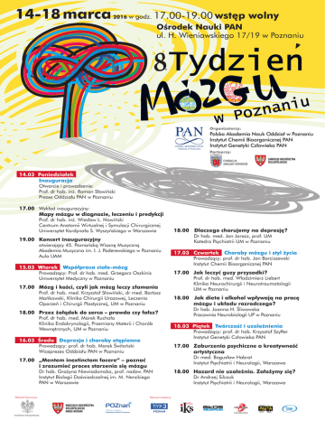 14-18 marca 2016 w godz. 17.00-19.00 wstęp wolny Ośrodek Nauki PAN ul. H. Wieniawskiego 17/19 w Poznaniu Organizatorzy: Polska Akademia Nauk Oddział w Poznaniu Instytut Chemii Bioorganicznej PAN Instytut Genetyki Człowieka PAN Partnerzy: FUNDACJA ZAKŁADY KÓRNICKIE 14.03 Poniedziałek Inauguracja Otwarcie i prowadzenie: PROGRAMProf. dr hab. inż. Roman Słowiński Prezes Oddziału PAN w Poznaniu 17.00 Wykład inauguracyjny: Mapy mózgu w diagnozie, leczeniu i predykcji Prof. dr hab. inż. Wiesław L. Nowiński Centrum Anatomii Wirtualnej i Symulacji Chirurgicznej Uniwersytet Kardynała S. Wyszyńskiego w Warszawie 19.00 Koncert inauguracyjny otwierający 45. Poznańską Wiosnę Muzyczną Akademia Muzyczna im. I. J. Paderewskiego w Poznaniu Aula UAM 15.03 Wtorek Współpraca ciało-mózg Prowadzący: Prof. dr hab. med. Grzegorz Oszkinis Uniwersytet Medyczny w Poznaniu 17.00 Mózg i kości, czyli jak mózg leczy złamania Prof. dr hab. med. Krzysztof Słowiński, dr med. Bartosz Mańkowski, Klinika Chirurgii Urazowej, Leczenia Oparzeń i Chirurgii Plastycznej, UM w Poznaniu 18.00 Przez żołądek do serca – prawda czy fałsz? Prof. dr hab. med. Marek Ruchała Klinika Endokrynologii, Przemiany Materii i Chorób Wewnętrznych, UM w Poznaniu 16.03 Środa Depresja i choroby otępienne 17.03 Czwartek Choroby mózgu i styl życia Prowadzący: prof. dr hab. Jan Barciszewski Instytut Chemii Bioorganicznej PAN 17.00 Jak leczyć guzy przysadki? Prof. dr hab. med. Włodzimierz Liebert Klinika Neurochirurgii i Neurotraumatologii UM w Poznaniu 18.00 Jak dieta i alkohol wpływają na pracę mózgu i układu rozrodczego? Dr hab. Joanna H. Śliwowska Pracownia Neurobiologii UP w Poznaniu 18.03 Piątek Twórczość i uzależnienia Prowadzący: prof. dr hab. Krzysztof Szyfter Instytut Genetyki Człowieka PAN Dr med. Bogusław Habrat Instytut Psychiatrii i Neurologii, Warszawa 17.00 „Mentem inextinctam facere” – poznać i zrozumieć proces starzenia się mózgu Dr hab. Grażyna Niewiadomska, prof. nadzw. PAN Instytut Biologii Doświadczalnej im. M. Nenckiego PAN w Warszawie WOJEWODA WIELKOPOLSKI Dr hab. med. Jan Jaracz, prof. UM Katedra Psychiatrii UM w Poznaniu 17.00 Zaburzenia psychiczne a kreatywność artystyczna Prowadzący: prof. dr hab. Marek Świtoński Wiceprezes Oddziału PAN w Poznaniu Patronat honorowy: 18.00 Dlaczego chorujemy na depresję? Patronat medialny: 18.00 Hazard nie uzależnia. Założymy się? Dr Andrzej Silczuk Instytut Psychiatrii i Neurologii, Warszawa